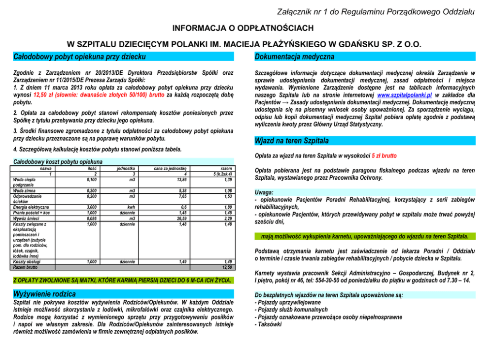 Załącznik nr 1 do Regulaminu Porządkowego Oddziału INFORMACJA O ODPŁATNOŚCIACH W SZPITALU DZIECIĘCYM POLANKI IM. MACIEJA PŁAŻYŃSKIEGO W GDAŃSKU SP. Z O.O. Całodobowy pobyt opiekuna przy dziecku Dokumentacja medyczna Zgodnie z Zarządzeniem nr 20/2013/DE Dyrektora Przedsiębiorstw Spółki oraz Zarządzeniem nr 11/2015/DE Prezesa Zarządu Spółki: 1. Z dniem 11 marca 2013 roku opłata za całodobowy pobyt opiekuna przy dziecku wynosi 12,50 zł (słownie: dwanaście złotych 50/100) brutto za każdą rozpoczętą dobę pobytu. 2. Opłata za całodobowy pobyt stanowi rekompensatę kosztów poniesionych przez Spółkę z tytułu przebywania przy dziecku jego opiekuna. 3. Środki finansowe zgromadzone z tytułu odpłatności za całodobowy pobyt opiekuna przy dziecku przeznaczone są na poprawę warunków pobytu. 4. Szczegółową kalkulację kosztów pobytu stanowi poniższa tabela. Woda ciepła podgrzanie Woda zimna Odprowadzanie ścieków Energia elektryczna Pranie pościel + koc Wywóz śmieci Koszty związane z eksploatacją pomieszczeń i urządzeń (zużycie pom. dla rodziców, łóżek, czajnik, lodówka inne) Koszty obsługi Razem brutto ilość 2 0,100 jednostka 3 m3 cana za jednostkę 4 13,86 razem 5 (k.2xk.4) 1,39 Opłata pobierana jest na podstawie paragonu fiskalnego podczas wjazdu na teren Szpitala, wystawianego przez Pracownika Ochrony. 0,200 0,200 m3 m3 5,38 7,65 1,08 1,53 3,000 1,000 0,086 1,000 kwh dziennie m3 dziennie 0,6 1,45 26,59 1,48 1,80 1,45 2,29 1,48 Uwaga: - opiekunowie Pacjentów Poradni Rehabilitacyjnej, korzystający z serii zabiegów rehabilitacyjnych, - opiekunowie Pacjentów, których przewidywany pobyt w szpitalu może trwać powyżej sześciu dni, mają możliwość wykupienia karnetu, upoważniającego do wjazdu na teren Szpitala. 1,000 dziennie 1,49 1,49 12,50 Z OPŁATY ZWOLNIONE SĄ MATKI, KTÓRE KARMIĄ PIERSIĄ DZIECI DO 6 M-CA ICH ŻYCIA. Wyżywienie rodzica Wjazd na teren Szpitala Opłata za wjazd na teren Szpitala w wysokości 5 zł brutto Całodobowy koszt pobytu opiekuna nazwa 1 Szczegółowe informacje dotyczące dokumentacji medycznej określa Zarządzenie w sprawie udostępniania dokumentacji medycznej, zasad odpłatności i miejsca wydawania. Wymienione Zarządzenie dostępne jest na tablicach informacyjnych naszego Szpitala lub na stronie internetowej www.szpitalpolanki.pl w zakładce dla Pacjentów → Zasady udostępniania dokumentacji medycznej. Dokumentację medyczną udostępnia się na pisemny wniosek osoby upoważnionej. Za sporządzenie wyciągu, odpisu lub kopii dokumentacji medycznej Szpital pobiera opłatę zgodnie z podstawą wyliczenia kwoty przez Główny Urząd Statystyczny. Szpital nie pokrywa kosztów wyżywienia Rodziców/Opiekunów. W każdym Oddziale istnieje możliwość skorzystania z lodówki, mikrofalówki oraz czajnika elektrycznego. Rodzice mogą korzystać z wymienionego sprzętu przy przygotowywaniu posiłków i napoi we własnym zakresie. Dla Rodziców/Opiekunów zainteresowanych istnieje również możliwość zamówienia w firmie zewnętrznej odpłatnych posiłków. Podstawą otrzymania karnetu jest zaświadczenie od lekarza Poradni / Oddziału o terminie i czasie trwania zabiegów rehabilitacyjnych / pobycie dziecka w Szpitalu. Karnety wystawia pracownik Sekcji Administracyjno – Gospodarczej, Budynek nr 2, I piętro, pokój nr 46, tel: 554-30-50 od poniedziałku do piątku w godzinach od 7.30 – 14. Do bezpłatnych wjazdów na teren Szpitala upoważnione są: - Pojazdy uprzywilejowane - Pojazdy służb komunalnych - Pojazdy oznakowane przewożące osoby niepełnosprawne - Taksówki