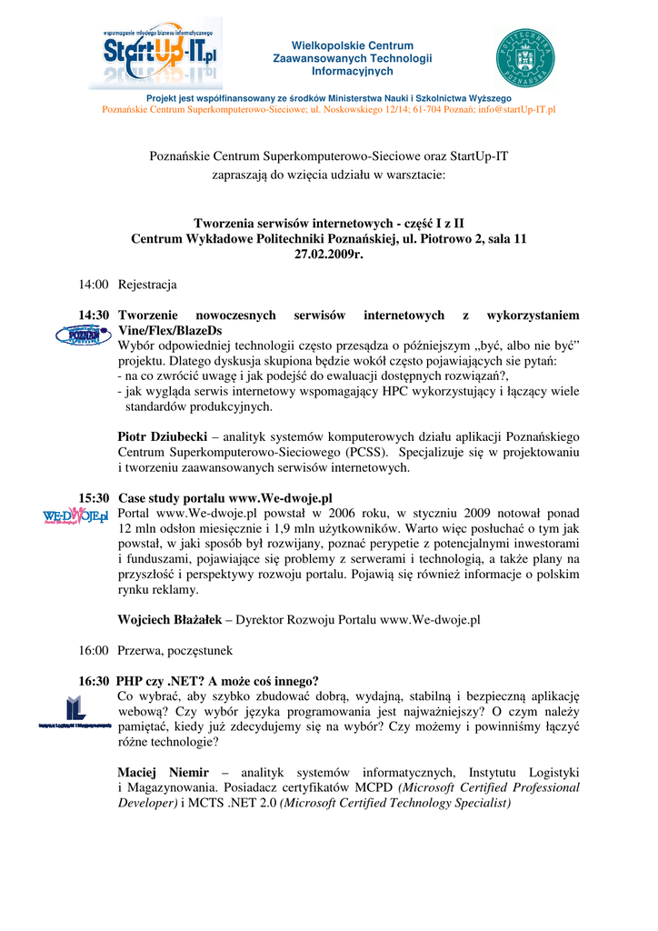 Wielkopolskie Centrum Zaawansowanych Technologii Informacyjnych Projekt jest współfinansowany ze środków Ministerstwa Nauki i Szkolnictwa Wyższego Poznańskie Centrum Superkomputerowo-Sieciowe; ul. Noskowskiego 12/14; 61-704 Poznań; [email protected] Poznańskie Centrum Superkomputerowo-Sieciowe oraz StartUp-IT zapraszają do wzięcia udziału w warsztacie: Tworzenia serwisów internetowych - część I z II Centrum Wykładowe Politechniki Poznańskiej, ul. Piotrowo 2, sala 11 27.02.2009r. 14:00 Rejestracja 14:30 Tworzenie nowoczesnych serwisów internetowych z wykorzystaniem Vine/Flex/BlazeDs Wybór odpowiedniej technologii często przesądza o późniejszym „być, albo nie być” projektu. Dlatego dyskusja skupiona będzie wokół często pojawiających sie pytań: - na co zwrócić uwagę i jak podejść do ewaluacji dostępnych rozwiązań?, - jak wygląda serwis internetowy wspomagający HPC wykorzystujący i łączący wiele standardów produkcyjnych. Piotr Dziubecki – analityk systemów komputerowych działu aplikacji Poznańskiego Centrum Superkomputerowo-Sieciowego (PCSS). Specjalizuje się w projektowaniu i tworzeniu zaawansowanych serwisów internetowych. 15:30 Case study portalu www.We-dwoje.pl Portal www.We-dwoje.pl powstał w 2006 roku, w styczniu 2009 notował ponad 12 mln odsłon miesięcznie i 1,9 mln użytkowników. Warto więc posłuchać o tym jak powstał, w jaki sposób był rozwijany, poznać perypetie z potencjalnymi inwestorami i funduszami, pojawiające się problemy z serwerami i technologią, a także plany na przyszłość i perspektywy rozwoju portalu. Pojawią się również informacje o polskim rynku reklamy. Wojciech Błażałek – Dyrektor Rozwoju Portalu www.We-dwoje.pl 16:00 Przerwa, poczęstunek 16:30 PHP czy .NET? A może coś innego? Co wybrać, aby szybko zbudować dobrą, wydajną, stabilną i bezpieczną aplikację webową? Czy wybór języka programowania jest najważniejszy? O czym należy pamiętać, kiedy już zdecydujemy się na wybór? Czy możemy i powinniśmy łączyć różne technologie? Maciej Niemir – analityk systemów informatycznych, Instytutu Logistyki i Magazynowania. Posiadacz certyfikatów MCPD (Microsoft Certified Professional Developer) i MCTS .NET 2.0 (Microsoft Certified Technology Specialist) 17:00 Zabezpieczenia serwisów internetowych i ich łamanie Nauczenie się lokalizowania oraz wykorzystywania luk w bezpieczeństwie aplikacji webowych jest najlepszym sposobem na uświadomienie sobie jak poważne skutki mogą mieć drobne niedociągnięcia programistyczne. Prezentacja jest zaadresowana do osób zaznajomionych z technologiami webowymi. Tomasz Kuczyński – Dział Aplikacji Poznańskiego Centrum SuperkomputerowoSieciowego. Specjalizuje się głównie w dziedzinie aplikacji webowych. Odkrył kilkanaście luk w bezpieczeństwie oprogramowania portalowego (m. in. w Liferay, Apache Tomcat, Mortbay Jetty, Caucho Resin). 18:00 Zabezpieczenia serwerów internetowych Portal internetowy hostowany na nieprawidłowo skonfigurowanych serwerach dla każdego agresora jest jak otwarty skarbiec. Aż żal byłoby nie wejść. Warto więc posłuchać i porozmawiać o błędach często popełnianych podczas konfiguracji oprogramowania serwerów, jak i błędach w samym oprogramowaniu. Dowiesz się także czego unikać, a co uznawane jest aktualnie za absolutne minimum pod względem bezpieczeństwa. Jakub Tomaszewski – Zespół Bezpieczeństwa PCSS 18:30 Zabezpieczanie aplikacji webowych w środowisku ASP.NET Bezpieczeństwo aplikacji webowych to nie tylko rzetelnie napisany kod. Nie mniej ważną rolę odgrywa odpowiednia konfiguracja środowiska, w którym jest on osadzony. Prezentacja pomoże w przygotowaniu bezpiecznego środowiska współdzielonego hostingu, wskazując na sposoby wykorzystania dostępnych narzędzi i wbudowanych mechanizmów systemu operacyjnego oraz aplikacji. Gerard Frankowski – Zespół Bezpieczeństwa PCSS 19:15 Zakończenie spotkania W czasie warsztatów zachęcamy do zadawania pytań i dyskusji z prelegentami. Udział w warsztatach jest bezpłatny. Wymagana jest wcześniejsza rejestracja poprzez stronę www.StartUp-IT.pl. Liczba miejsc jest ograniczona, o udziale decyduje kolejność zgłoszeń. W programie II części warsztatów, w dniu 13.03.2009 roku, między innymi: Serwis najlepiej dopasowany: Prosto z półki - Czy lepsze są gotowe portale z "pudełka", czy robione na ścisłe zamówienie klienta? • Klęska urodzaju - Czy na pewno zamiast dobrego śrubokręta potrzebna jest walizka z narzędziami w promocyjnej cenie? • Budowa, przebudowa albo rozbudowa - Czego nie wiemy na samym początku? Moja strona w Internecie - nierówna walka widzów z twórcą • Mamo, tato, jestem online - Ile osób mnie ogląda? • Gadał dziad do obrazu - Czym jest megalomania wirtualna? • Lustereczko, powiedz przecie - Dlaczego czasem warto, by dzieci, ryby i użytkownicy serwisu nie mieli głosu? Adobe Flash - co jest "trendy", co "jazzy", a co "passe" • Gra i trąbi - Czy animacja to przekleństwo czy przydatne narzędzie? • Dawno, dawno temu - Czy to jeszcze interfejs czy już aplikacja? • Kolorowa czapka niewidka - Jak to jest z tą promocją internetowych animacji? Damian Niemir – designer serwisów internetowych, Poznańskie Centrum Superkomputerowo-Sieciowe Light up the web! Czyli o technologii Silverlight 2.0 umożliwiającej tworzenie bogatych interfejsów graficznych dla aplikacji internetowych. W ramach warsztatu zostanie omówiona zarówno sama technologia, jak i proces tworzenia elementów aplikacji internetowych z jej wykorzystaniem. Zaprezentowane zostaną również narzędzia pozwalające na pełne wykorzystanie możliwości jakie oferuje Silverlight 2.0 Marek Flejszman – analityk systemów komputerowych Działu Usług Sieciowych PCSS. Posiadacz certyfikatu MCAD (Microsoft Certified Application Developer) Społeczność nie gryzie - budowanie serwisu UGC na przykładach Spo