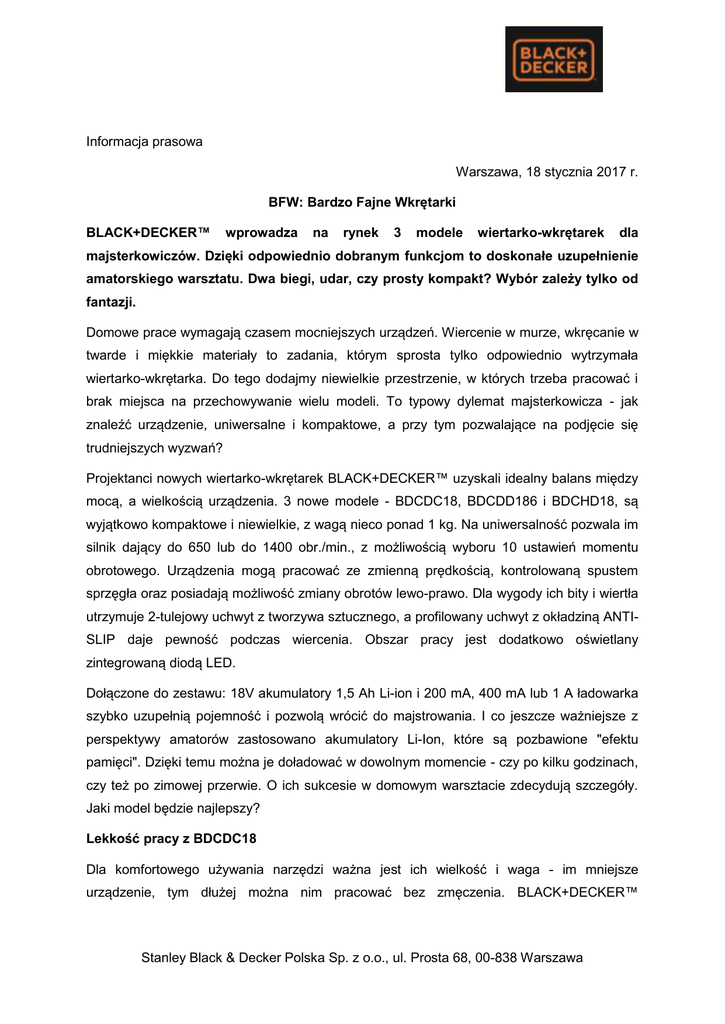 Informacja prasowa Warszawa, 18 stycznia 2017 r. BFW: Bardzo Fajne Wkrętarki BLACK+DECKER™ wprowadza na rynek 3 modele wiertarko-wkrętarek dla majsterkowiczów. Dzięki odpowiednio dobranym funkcjom to doskonałe uzupełnienie amatorskiego warsztatu. Dwa biegi, udar, czy prosty kompakt? Wybór zależy tylko od fantazji. Domowe prace wymagają czasem mocniejszych urządzeń. Wiercenie w murze, wkręcanie w twarde i miękkie materiały to zadania, którym sprosta tylko odpowiednio wytrzymała wiertarko-wkrętarka. Do tego dodajmy niewielkie przestrzenie, w których trzeba pracować i brak miejsca na przechowywanie wielu modeli. To typowy dylemat majsterkowicza - jak znaleźć urządzenie, uniwersalne i kompaktowe, a przy tym pozwalające na podjęcie się trudniejszych wyzwań? Projektanci nowych wiertarko-wkrętarek BLACK+DECKER™ uzyskali idealny balans między mocą, a wielkością urządzenia. 3 nowe modele - BDCDC18, BDCDD186 i BDCHD18, są wyjątkowo kompaktowe i niewielkie, z wagą nieco ponad 1 kg. Na uniwersalność pozwala im silnik dający do 650 lub do 1400 obr./min., z możliwością wyboru 10 ustawień momentu obrotowego. Urządzenia mogą pracować ze zmienną prędkością, kontrolowaną spustem sprzęgła oraz posiadają możliwość zmiany obrotów lewo-prawo. Dla wygody ich bity i wiertła utrzymuje 2-tulejowy uchwyt z tworzywa sztucznego, a profilowany uchwyt z okładziną ANTISLIP daje pewność podczas wiercenia. Obszar pracy jest dodatkowo oświetlany zintegrowaną diodą LED. Dołączone do zestawu: 18V akumulatory 1,5 Ah Li-ion i 200 mA, 400 mA lub 1 A ładowarka szybko uzupełnią pojemność i pozwolą wrócić do majstrowania. I co jeszcze ważniejsze z perspektywy amatorów zastosowano akumulatory Li-Ion, które są pozbawione "efektu pamięci". Dzięki temu można je doładować w dowolnym momencie - czy po kilku godzinach, czy też po zimowej przerwie. O ich sukcesie w domowym warsztacie zdecydują szczegóły. Jaki model będzie najlepszy? Lekkość pracy z BDCDC18 Dla komfortowego używania narzędzi ważna jest ich wielkość i waga - im mniejsze urządzenie, tym dłużej można nim pracować bez zmęczenia. BLACK+DECKER™ Stanley Black & Decker Polska Sp. z o.o., ul. Prosta 68, 00-838 Warszawa zaprojektował kompaktową wiertarko-wkrętarkę dostosowaną do domowych potrzeb, która pozwoli wywiercić kilkanaście otworów bez zmęczenia lub szybko zmontować zestaw mebli. Gdzie chcesz się wkręcić, BDCDD186? Możliwość zmiany biegów pozwala na jeszcze bardziej precyzyjną pracę. Pierwszy bieg z małą prędkością i wysokim momentem obrotowym służy do wkręcania wkrętów. W wiertarkowkrętarce BLACK+DECKER™ oznacza to do 380 obr./min. Drugi z odwrotnymi parametrami stworzono do wiercenia, co odzwierciedla maksymalna prędkość do 1450 obr./min. Moc kruszenia muru od BDCHD18 W pracach, które mogą czekać w domu skutecznie zastąpi młotowiertarkę. Udar pozwala ze spokojem podejść do wiercenia dziur w murze, a funkcja wkręcania poradzić sobie z podstawowym montażem. Odpowiednie mechanizmy zmieszczone w kompaktowym urządzeniu dadzą pewność perfekcyjnej pracy. Nowe wiertarko-wkrętarki BLACK+DECKER™ dostępne są w renomowanych marketach budowlanych. Dokładne dane techniczne zawarto w poniższej tabeli. Model BDCD18-QW BDCD18K-QW BDCDC18-XK BDCDC18KQW BDCDC18K1XK Rodzaj Dane techniczne Wiertarka 18.0V/1.5Ah, Li-Ion, 1 akum., dioda LED, ładowarka akumulatorowa 200 mA Wiertarka 18.0V/1.5Ah, Li-Ion, 1 akum., dioda LED, ładowarka akumulatorowa 200 mA, walizka Wiertarko- 18.0V/1.5Ah, Li-Ion, 1 akum.,0-650 obr./min., 10 wkrętarka ustawień momentu obrotowego, dioda LED, ładowarka akumulatorowa 200 mA Wiertarko- 18.0V/1.5Ah, Li-Ion, 1 akum.,0-650 obr./min., 10 wkrętarka ustawień momentu obrotowego, dioda LED, ładowarka akumulatorowa 400 mA, walizka Wiertarko- 18.0V/1.5Ah, Li-Ion, 1 akum.,0-650 obr./min., 10 wkrętarka ustawień momentu obrotowego, dioda LED, ładowarka akumulatorowa 1A, walizka Sugerowana cena Stanley Black & Decker Polska Sp. z o.o., ul. Prosta 68, 00-838 Warszawa 399.00 zł 439.00 zł 409.00 zł 449.00 zł 489.00 zł BDCDC18BXK BDCDC18KBQW BDCDC18K1BXK BDCDD186QW BDCDD186KXK BDCDD186KBXK BDCHD18-QW BDCHD18KQW BDCHD18KBXK Wiertarko- 18.0V/1.5Ah, Li-Ion, 2 akum.,0-650 obr./min., 10 wkrętarka ustawień momentu obrotowego, dioda LED, ładowarka akumulatorowa 200mA Wiertarko- 18.0V/1.5Ah, Li-Ion, 2 akum.,0-650 obr./min., 10 wkrętarka ustawień momentu obrotowego, dioda LED, ładowarka akumulatorowa 400mA, walizka Wiertarko- 18.0V/1.5Ah, Li-Ion, 2 akum.,0-650 obr./min., 10 wkrętarka ustawień momentu obrotowego, dioda LED, ładowarka akumulatorowa 1A, walizka Wiertarko- 18.0V/1.5Ah, Li-Ion, 1 akum., 2 biegi, 0-360/0-1400 wkrętarka obr./min., 10 ustawień momentu obrotowego, 17.5/40 akumulatorowa Nm, dioda LED, ładowarka 200 mA Wiertarko- 18.0V/1.5Ah, Li-Ion, 1 akum., 2 biegi, 0-360/0-1400 wkrętarka obr./min., 10 ustawień momentu obrotowego, 17.5/40 akumulatorowa Nm, dioda LED, ładowarka 400 mA, walizka Wiertarko- 18.0V/1.5Ah, Li-Ion, 2 akum., 2 biegi, 0-360/0-1400 wkrętarka obr./min., 10 ustawień momentu obrotowego, 17.5/40 akumulatorowa Nm, dioda LED, ładowarka 400 mA, walizka Wiertarko- 18V/1.5Ah Li-Ion, 1 akum., 2 biegi, 0-360/0-1400 wkrętarka obr/min., udar, 10 ustawień momentu obrotowego, akumulatorowa 17.5/40 Nm, dioda LED, ładowarka 200 mA Wiertarko- 18V/1.5Ah Li-Ion, 1 akum., 2 biegi, 0-360/0-1400 wkrętarka obr/min., udar, 10 ustawień momentu obrotowego, akumulatorowa 17.5/40 Nm, dioda LED, ładowarka 400 mA, walizka Wiertarko- 18V/1.5Ah Li-Ion, 2 akum., 2 biegi, 0-360/0-1400 wkrętarka obr/min., udar, 10 ustawień momentu obrotowego, akumulatorowa 17.5/40 Nm, dioda LED, ładowarka 400 mA, walizka *** Kontakt dla mediów: Stanley Black & Decker Polska Sp. z o.o., ul. Prosta 68, 00-838 Warszawa 559.00 zł 599.00 zł 649.00 zł 449.00 zł 489.00 zł 639.00 zł 499.00 zł 539.00 zł 689.00 z