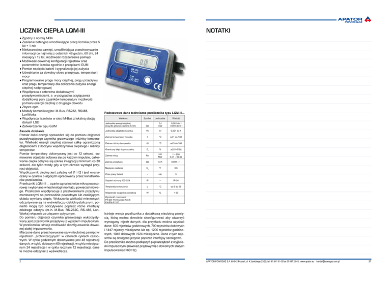 LICZNIK CIEPŁA LQM-III ● Zgodny z normą 1434 ● Zasilanie bateryjne umożliwiające pracę licznika przez 5 lat + 1 rok ● Niekasowalna pamięć, umożliwiająca przechowywanie informacji co najmniej z ostatnich 48 godzin, 60 dni, 24 miesięcy i 12 lat, możliwość rozszerzenia pamięci ● Możliwość dowolnej konfiguracji rejestrów oraz parametrów licznika zgodnie z przepisami GUM ● Pomiar napięcia baterii i sygnalizacja jej zużycia ● Uśrednianie za dowolny okres przepływu, temperatur i mocy ● Programowanie progu mocy cieplnej, progu przepływu oraz progu temperatury dla obliczenia zużycia energii cieplnej nadprogowej ● Współpraca z czterema dodatkowymi przepływomierzami, a w przypadku przyłączenia dodatkowej pary czujników temperatury możliwość pomiaru energii cieplnej z drugiego obwodu ● Złącze opto ● Moduły komunikacyjne: M-Bus, RS232, RS485, LonWorks ● Współpraca liczników w sieci M-Bus z lokalną stacją danych LSD ● Zatwierdzenie typu GUM Zasada działania Pomiar ilości energii sprowadza się do pomiaru objętości przepływającego czynnika grzewczego i różnicy temperatur. Wielkość energii cieplnej stanowi całkę ograniczoną objętościami z iloczynu współczynnika cieplnego i różnicy temperatur. Pomiar temperatury dokonywany jest co 12 sekund, sumowanie objętości odbywa się po każdym impulsie, całkowanie ciepła odbywa się (okres integracji) minimum co 30 sekund, ale tylko wtedy gdy w tym okresie wystąpił przyrost objętości. Współczynnik cieplny jest zależny od t1 i t2 i jest wyznaczany w oparciu o algorytm opracowany przez konstruktorów przelicznika. Przeliczniki LQM-III ... oparte są na technice mikroprocesorowej i wykonane w technologii montażu powierzchniowego. Przelicznik współpracuje z przetwornikami przepływu montowanymi na przewodzie powrotnym lub zasilającym układu wymiany ciepła. Wskazania wielkości mierzonych odczytywane są na wyświetlaczu ciekłokrystalicznym, ponadto mogą być odczytywane poprzez różne interfejsy zdalnego odczytu (m.in. M-Bus, RS-232C, RS-485, LonWorks) włącznie ze złączem optycznym. Do pomiaru objętości czynnika grzewczego wykorzystywany jest przetwornik przepływu z wyjściem impulsowym. W przeliczniku istnieje możliwość skonfigurowania dowolnej stałej impulsowania. Mierzone dane przechowywane są w nieulotnej pamięci w rejestrach „archiwizacyjnych” w czterech cyklach czasowych. W cyklu godzinnym dokonywane jest 48 rejestracji danych, w cyklu dobowym 60 rejestracji, w cyklu miesięcznym 24 rejestracje i w cyklu rocznym 12 rejestracji, dane te można odczytać z wyświetlacza. 2 NOTATKI Podstawowe dane techniczne przelicznika typu LQM-III... Wielkość Symbol Jednostka Wartość Jednostka energii cieplnej (liczydło główne zawiera 8 cyfr) Qe GJ mW 0,001 do 1 0,001 do 0,1 Jednostka objętości nośnika Ve m3 0,001 do 1 Zakres temperatury nośnika t °C od 1 do 180 Zakres różnicy temperatur Δt °C od 3 do 160 Graniczny błąd dopuszczalny EI % ±(0,5+3/Δt) Zakres mocy Pp kW MW 1 – 999 0,01 – 99,99 Zakres przepływu Qd m3/h 0,001 – 1 Napięcie zasilania Uz V 3,6 Czas pracy baterii – rok 5 Stopień ochrony IEC-529 IP – IP-54 Temperatura otoczenia ta °C od 5 do 55 Wilgotność względna powietrza W % < 90 Zgodność z normami: PN-EN 1434 części 1do 6 PN-EN 61107 Istnieje wersja przelicznika z dodatkową nieulotną pamięcią, którą można dowolnie skonfigurować aby utworzyć wymagany rejestr danych, dla przykładu można uzyskać dane: 500 rejestrów godzinowych, 700 rejestrów dobowych i 1447 rejestry miesięczne lub np. 1200 rejestrów godzinowych, 1046 dobowych i 924 miesięczne. Dane z tych rejestrów są dostępne jedynie poprzez interfejsy szeregowe. Do przelicznika można podłączyć pięć urządzeń z wyjściami impulsowymi (również prądowymi) o dowolnych stałych impulsowania(f<60 Hz). 27 Przelicznik LQM-III... może być skonfigurowany jako LQM-III-D, to jest może mierzyć ciepło w dwóch niezależnych obwodach pomiaru ciepła. W takiej konfiguracji mierzone są cztery temperatury, natomiast jedno z dodatkowych wejść impulsowych jest traktowane jako wejście przetwornika przepływu drugiego obiegu pomiaru ciepła. Obydwa obiegi cieplne mają identyczne właściwości i mogą być konfigurowane tak jak to opisano powyżej. Wszystkie wielkości pomiarowe, które są skojarzone z drugim obiegiem pomiaru ciepła wyświetlane są ze znaczkiem ’ (prim) wyświetlanym w lewym górnym rogu wyświetlacza. Zdalny odczyt danych Przeliczniki LQM-III-... umożliwiają zdalny odczyt danych i konfigurowanie przy użyciu odpowiednich urządzeń z oprogramowaniem, możliwe są dwa generalne sposoby elektronicznej obsługi odczytu i konfigurowania. Przy bezpośrednim dostępie do obudowy przelicznika można wykorzystać złącze typu ‘opto’, które zgodne jest z odpowiednią normą. Przy użyciu oprogramowania komputera PC (lub PSION, lub inne) można odczytać poprzez złącze ‘opto’ następujący zestaw danych aktualnych : suma ciepła, suma ciepła drugiej taryfy, wszystkie objętości i wejścia impulsowe, temperatury zasilania i powrotu, moc i przepływ, kod błędów, czas pracy, numer sieciowy, numer użytkownika i numer fabryczny. Poprzez ‘opto’ można konfigurować następujące parametry: progi do obliczania drugiej taryfy, okres do obliczeń, numer sieciowy, aktualny czas i data, parametry zapisu danych do archiwum, prędkość transmisji (M-BUS), numer użytkownika. Na obwodzie drukowanym listew zaciskowych umieszczone jest złącze pozwalające dołączać do przelicznika wszelkiego rodzaju interfejsy komunikacyjne, np. interfejsy M-BUS, RS 232, RS485, LonWorks i inne. Możliwe jest tworzenie zupełnie nowych interfejsów transmisyjnych z dowolnymi protokołami transmisji. Dostępne są również różne szczegółowe opisy dotyczące poszczególnych interfejsów i systemów zdalnego odczytu danych. Poprzez