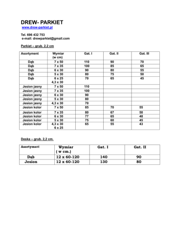 DREW- PARKIET www.drew-parkiet.pl Tel. 696 432 753 e-mail: [email protected] Parkiet – grub. 2.2 cm Asortyment Dąb Dąb Dąb Dąb Dąb Jesion jasny Jesion jasny Jesion jasny Jesion jasny Jesion jasny Jesion kolor Jesion kolor Jesion kolor Jesion kolor Jesion kolor Wymiar (w cm) 7 x 50 7 x 35 6 x 30 5 x 30 6 x 25 4,3 x 30 7 x 50 7 x 35 6 x 30 5 x 30 4,3 x 30 7 x 50 Gat. I Gat. II Gat. III 110 100 90 80 70 90 85 80 75 65 70 65 55 50 45 110 100 90 80 70 85 70 55 7 x 35 6 x 30 5 x 30 4,3 x 30 6 x 25 80 77 75 65 67 65 60 55 50 48 45 43 Deska – grub. 2,2 cm. Asortyment Dąb Jesion Wymiar ( w cm.) 12 x 60-120 12 x 60-120 Gat. I Gat. II 140 130 90 80