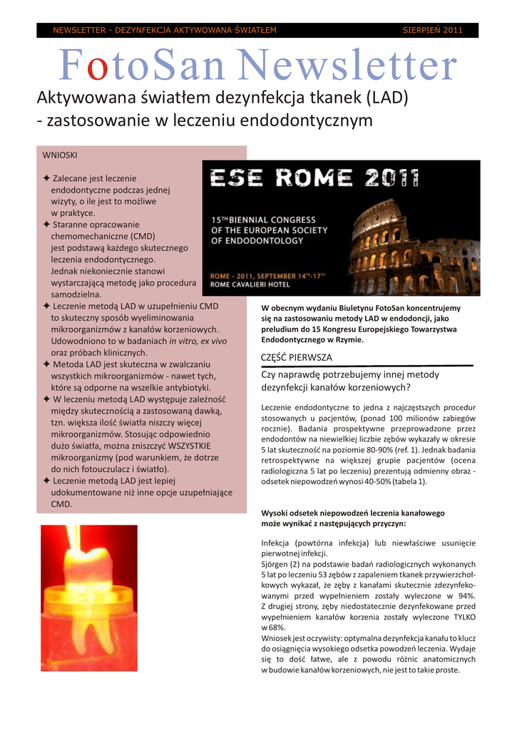 NEWSLETTER - DEZYNFEKCJA AKTYWOWANA ŒWIAT£EM SIERPIEÑ 2011 F o toSan Newsletter Aktywowana œwiat³em dezynfekcja tkanek (LAD) - zastosowanie w leczeniu endodontycznym WNIOSKI è Zalecane jest leczenie endodontyczne podczas jednej wizyty, o ile jest to mo¿liwe w praktyce. è Staranne opracowanie chemomechaniczne (CMD) jest podstaw¹ ka¿dego skutecznego leczenia endodontycznego. Jednak niekoniecznie stanowi wystarczaj¹c¹ metodê jako procedura samodzielna. è Leczenie metod¹ LAD w uzupe³nieniu CMD to skuteczny sposób wyeliminowania mikroorganizmów z kana³ów korzeniowych. Udowodniono to w badaniach in vitro, ex vivo oraz próbach klinicznych. è Metoda LAD jest skuteczna w zwalczaniu wszystkich mikroorganizmów - nawet tych, które s¹ odporne na wszelkie antybiotyki. è W leczeniu metod¹ LAD wystêpuje zale¿noœæ miêdzy skutecznoœci¹ a zastosowan¹ dawk¹, tzn. wiêksza iloœæ œwiat³a niszczy wiêcej mikroorganizmów. Stosuj¹c odpowiednio du¿o œwiat³a, mo¿na zniszczyæ WSZYSTKIE mikroorganizmy (pod warunkiem, ¿e dotrze do nich fotouczulacz i œwiat³o). è Leczenie metod¹ LAD jest lepiej udokumentowane ni¿ inne opcje uzupe³niaj¹ce CMD. W obecnym wydaniu Biuletynu FotoSan koncentrujemy siê na zastosowaniu metody LAD w endodoncji, jako preludium do 15 Kongresu Europejskiego Towarzystwa Endodontycznego w Rzymie. CZÊŒÆ PIERWSZA Czy naprawdê potrzebujemy innej metody dezynfekcji kana³ów korzeniowych? Leczenie endodontyczne to jedna z najczêstszych procedur stosowanych u pacjentów, (ponad 100 milionów zabiegów rocznie). Badania prospektywne przeprowadzone przez endodontów na niewielkiej liczbie zêbów wykaza³y w okresie 5 lat skutecznoœæ na poziomie 80-90% (ref. 1). Jednak badania retrospektywne na wiêkszej grupie pacjentów (ocena radiologiczna 5 lat po leczeniu) prezentuj¹ odmienny obraz odsetek niepowodzeñ wynosi 40-50% (tabela 1). Wysoki odsetek niepowodzeñ leczenia kana³owego mo¿e wynikaæ z nastêpuj¹cych przyczyn: Infekcja (powtórna infekcja) lub niew³aœciwe usuniêcie pierwotnej infekcji. Sjörgen (2) na podstawie badañ radiologicznych wykonanych 5 lat po leczeniu 53 zêbów z zapaleniem tkanek przywierzcho³kowych wykaza³, ¿e zêby z kana³ami skutecznie zdezynfekowanymi przed wype³nieniem zosta³y wyleczone w 94%. Z drugiej strony, zêby niedostatecznie dezynfekowane przed wype³nieniem kana³ów korzenia zosta³y wyleczone TYLKO w 68%. Wniosek jest oczywisty: optymalna dezynfekcja kana³u to klucz do osi¹gniêcia wysokiego odsetka powodzeñ leczenia. Wydaje siê to doœæ ³atwe, ale z powodu ró¿nic anatomicznych w budowie kana³ów korzeniowych, nie jest to takie proste. NEWSLETTER - DEZYNFEKCJA AKTYWOWANA ŒWIAT£EM Ró¿nice anatomiczne bardzo utrudniaj¹, a czasami wrêcz uniemo¿liwiaj¹ dostateczne oczyszczenie kana³ów, nawet przy zastosowaniu nowoczesnych elastycznych pilników niklowo tytanowych NiTi. Niektóre ostatnie badania pokazuj¹ (3,4), ¿e powierzchnia przywierzcho³kowa trzecich zêbów trzonowych rzadko da siê oczyœciæ przy pomocy pilników. Dlatego konieczna jest dezynfekcja chemiczna lub termiczna. Dezynfekcjê termiczn¹ mo¿na uzyskaæ np. za pomoc¹ lasera chirurgicznego, która to metoda nie jest omawiana w dalszej czêœci biuletynu, a to ze wzglêdu na jej wysokie koszty, przez które nie ma szans staæ siê g³ówn¹ terapi¹ w ramach endodoncji. Jedno badanie (6) wykazuje trudnoœæ z dezynfekcj¹ kana³ów u starszych pacjentów. Nie jest to zaskakuj¹ce i da siê choæby czêœciowo wyjaœniæ postêpuj¹cymi z wiekiem zmianami anatomicznymi kana³ów, co dodatkowo potwierdza, ¿e wczeœniejsze nie wyeliminowanie bakterii stanowi kluczowy czynnik niepowodzenia. W leczeniu endodontycznym dezynfekcjê chemiczn¹ najczêœciej przeprowadza siê metod¹ p³ukania 5,25% roztworem NaOCl. Wiêkszoœæ badañ in vitro (5) wykazuje niezadowalaj¹ce wyniki p³ukania kana³ów korzenia nawet za pomoc¹ 5,25% roztworu NaOCl. Niektórzy autorzy zalecaj¹ p³ukanie ³¹czone 17% EDTA, 5,25% roztworem NaOCl oraz 2% chlorheksydyn¹. Leczenie endodontyczne w czasie jednej czy dwóch wizyt? Inn¹ mo¿liw¹ metod¹ eliminacji mikroorganizmów w kanale korzenia jest umieszczenie opatrunku w kanale na okres miêdzy dwoma wizytami. Tradycyjny produkt, nadal stosowany, to wodorotlenek wapnia (Ca(OH)2). Sathorn (7) opublikowa³ w 2007 roku artyku³, stanowi¹cy metaanalizê oœmiu publikacji na temat rezultatów stosowania opatrunków z Ca(OH)2 w leczeniu kana³owym. W konkluzji stwierdzi³, ¿e nie zaobserwowano ¿adnych istotnych skutków klinicznych. Wynik w przypadku zastosowania opatrunków z antybiotykami nie jest lepszy, np. pulpomixine. Na ten temat istnieje tylko jedno opublikowane badanie (8) i nie wykazuje ono ¿adnych efektów. Jest rzecz¹ zaskakuj¹c¹, ¿e antybiotyki s¹ stosowane od 20-30 lat bez ¿adnego oparcia o naukowe badania kliniczne. Sathorn (9) opublikowa³ w 2005 roku artyku³, stanowi¹cy metaanalizê porównuj¹c¹ leczenie endodontyczne jedno- i wieloseansowe i stwierdzi³ nieznaczn¹ przewagê na korzyœæ leczenia podczas jednej wizyty, jednak¿e wynik nie by³ istotny statystycznie (p=0,38). Leczenie 5% roztworem jodyny (kombinacja jodyny i jodku potasu IDI) bada³ w 2004 roku Kvist z Goteborgu (10), porównuj¹c leczenie za pomoc¹ 5% IDI podczas jednej wizyty z leczeniem za pomoc¹ opatrunków z Ca(OH)2 miêdzy dwiema wizytami. Nie stwierdzi³ istotnych ró¿nic w skutecznoœci tych metod. Powstaje wiêc pytanie, czy jest to wystarczaj¹cy powód na stosowanie jodyny. Sathorn (9) wykaza³, jak wspomniano SIERPIEÑ 2011 Tabela 1: Lista badañ retrospektywnych dotycz¹cych odsetka niepowodzenia po leczeniu endodontycznym liczba zêbów niepowodzenie 320 kraj ref 35 % Litwa 13 6339 45 % Bia³oruœ 14 2051 50 % Brazylia 15 314 44 % Kanada 16 93 65 % Hiszpania 17 93 40 % Belgia 18 773 52 % Dania 19 wczeœniej, ¿e leczenie endodontyczne podczas jednej wizyty daje co najmniej tak