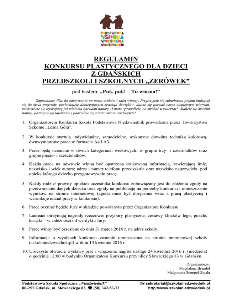 REGULAMIN KONKURSU PLASTYCZNEGO DLA DZIECI Z GDAŃSKICH PRZEDSZKOLI I SZKOLNYCH „ZERÓWEK” pod hasłem: „Puk, puk! – Tu wiosna!” Zapraszamy Was do odkrywania na nowo uroków i zalet wiosny. Przyjrzyjcie się subtelnemu pięknu budzącej się do życia przyrody, posłuchajcie dobiegających zewsząd dźwięków, dajcie się porwać coraz cieplejszym wiatrom, zachwyćcie się tryskającą już wieloma barwami naturą. A może sprawdźcie, co słychać u zwierząt? Stańcie się dziećmi natury, poznajcie jej tajemnice i podzielcie się z nami swoim zachwytem! 1. Organizatorem Konkursu Szkoła Podstawowa Niedźwiednik prowadzona przez Towarzystwo Szkolne „Leśna Góra”. 2. W konkursie startują indywidualne, samodzielne, wykonane dowolną techniką kolorową, dwuwymiarowe prace w formacie A4 i A3. 3. Prace będą oceniane w dwóch kategoriach wiekowych: w grupie trzy- i czterolatków oraz grupie pięcio- i sześciolatków. 4. Każda praca na odwrocie winna być opatrzona drukowaną informacją, zawierającą imię, nazwisko i wiek autora; adres i numer telefonu przedszkola oraz nazwisko nauczyciela, pod opieką którego dziecko przygotowywało pracę. 5. Każdy rodzic/ prawny opiekun uczestnika konkursu zobowiązany jest do złożenia zgody na przetwarzanie danych dziecka oraz zgody na publikację na potrzeby konkursu i umieszczenie wyników na stronie internetowej (zgoda musi być doręczona wraz z pracą plastyczną i warunkuje udział pracy w konkursie). 6. Prace oceniać będzie Jury w składzie powołanym przez Organizatora Konkursu. 7. Laureaci otrzymają nagrody rzeczowe: przybory plastyczne, zestawy klocków lego, puzzle, książki – w zależności od werdyktu Jury. 8. Prace winny być przesłane do dnia 31 marca 2016 r. na adres szkoły. 9. Informacja o wynikach konkursu zostanie umieszczona na stronie internetowej szkoły (szkolaniedzwiednik.pl) w dniu 13 kwietnia 2016 r. 10. Uroczyste otwarcie wystawy prac i wręczenie nagród nastąpi 24 kwietnia 2016 r. (niedziela) o godzinie 12:00 w budynku Organizatora Konkursu przy ulicy Słowackiego 83 w Gdańsku. Organizatorzy: Magdalena Brendel Małgorzata Stempel-Zeyda Podstawowa Szkoła Społeczna „Niedźwiednik” 80-257 Gdańsk, ul. Słowackiego 83, (58) 342-53-73 [email protected] http://www.szkolaniedzwiednik.pl