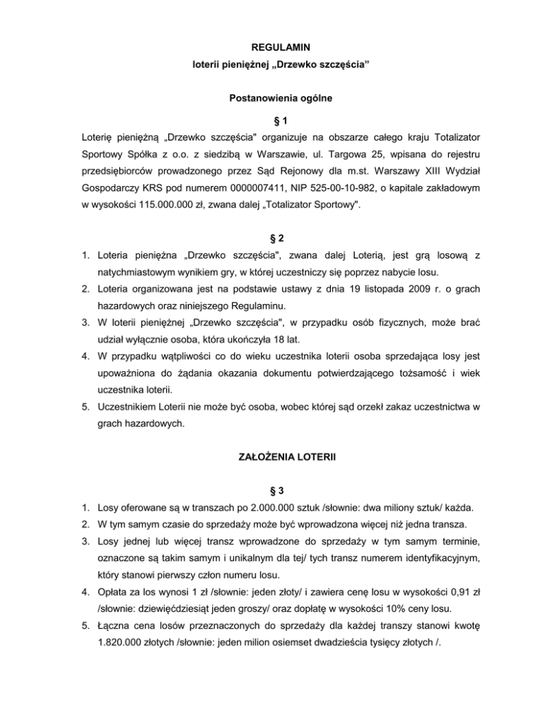 REGULAMIN loterii pieniężnej „Drzewko szczęścia” Postanowienia ogólne §1 Loterię pieniężną „Drzewko szczęścia" organizuje na obszarze całego kraju Totalizator Sportowy Spółka z o.o. z siedzibą w Warszawie, ul. Targowa 25, wpisana do rejestru przedsiębiorców prowadzonego przez Sąd Rejonowy dla m.st. Warszawy XIII Wydział Gospodarczy KRS pod numerem 0000007411, NIP 525-00-10-982, o kapitale zakładowym w wysokości 115.000.000 zł, zwana dalej „Totalizator Sportowy". §2 1. Loteria pieniężna „Drzewko szczęścia", zwana dalej Loterią, jest grą losową z natychmiastowym wynikiem gry, w której uczestniczy się poprzez nabycie losu. 2. Loteria organizowana jest na podstawie ustawy z dnia 19 listopada 2009 r. o grach hazardowych oraz niniejszego Regulaminu. 3. W loterii pieniężnej „Drzewko szczęścia", w przypadku osób fizycznych, może brać udział wyłącznie osoba, która ukończyła 18 lat. 4. W przypadku wątpliwości co do wieku uczestnika loterii osoba sprzedająca losy jest upoważniona do żądania okazania dokumentu potwierdzającego tożsamość i wiek uczestnika loterii. 5. Uczestnikiem Loterii nie może być osoba, wobec której sąd orzekł zakaz uczestnictwa w grach hazardowych. ZAŁOŻENIA LOTERII §3 1. Losy oferowane są w transzach po 2.000.000 sztuk /słownie: dwa miliony sztuk/ każda. 2. W tym samym czasie do sprzedaży może być wprowadzona więcej niż jedna transza. 3. Losy jednej lub więcej transz wprowadzone do sprzedaży w tym samym terminie, oznaczone są takim samym i unikalnym dla tej/ tych transz numerem identyfikacyjnym, który stanowi pierwszy człon numeru losu. 4. Opłata za los wynosi 1 zł /słownie: jeden złoty/ i zawiera cenę losu w wysokości 0,91 zł /słownie: dziewięćdziesiąt jeden groszy/ oraz dopłatę w wysokości 10% ceny losu. 5. Łączna cena losów przeznaczonych do sprzedaży dla każdej transzy stanowi kwotę 1.820.000 złotych /słownie: jeden milion osiemset dwadzieścia tysięcy złotych /. §4 1. Wysokość kapitału przeznaczonego na wygrane pieniężne wynosi dla każdej transzy 1.028.200 zł /słownie: jeden milion dwadzieścia osiem tysięcy dwieście złotych/, co stanowi 56,49% łącznej ceny losów przeznaczonych do sprzedaży dla każdej transzy. 2. Ilość i wysokość wygranych dla każdej transzy w Loterii: Stopień Ilość wygranych wygranych Wartość wygranych Łączna wartość w złotych wygranych w złotych I 5 6 000 30 000 II 88 400 35 200 III 1 500 32 48 000 IV 15 000 16 240 000 V 40 000 4 160 000 VI 100 000 2 200 000 VII 315 000 1 315 000 Razem wygranych: 471.593 sztuk dla każdej transzy. ZNAMIONA LOSÓW §5 Losy Loterii wykonane są w formie prostokąta o wymiarach 5,08 cm x 10,16 cm. §6 Na pierwszej stronie losu wydrukowano: 1) nazwę losu, 2) oznaczenie opłaty za los, 3) logo loterii pieniężnych Totalizatora Sportowego, 4) instrukcje dla uczestników Loterii, 5) pole gry pokryte w całości ścieralną warstwą ochronną, 6) numer identyfikacyjny losu. §7 Na drugiej stronie losu wydrukowano: 1) tabelę wygranych, 2) informacje o organizatorze Loterii i sposobie odbioru wygranej pieniężnej, 3) kody kreskowe i numery służące do identyfikacji losu, 4) logo Totalizatora Sportowego. WARUNKI SPRZEDAŻY LOSÓW §8 1. Termin rozpoczęcia sprzedaży losów oraz ilość transz Loterii, oznaczonych takim samym i unikalnym dla tej/ tych transz numerem identyfikacyjnym, który stanowi pierwszy człon numeru losu, każdorazowo określa Zarząd Totalizatora Sportowego i podaje do publicznej wiadomości grających z co najmniej 3 – dniowym wyprzedzeniem. 2. Termin zakończenia sprzedaży losów Loterii, oznaczonych takim samym i unikalnym dla tej/ tych transz numerem identyfikacyjnym, który stanowi pierwszy człon numeru losu, każdorazowo określa Zarząd Totalizatora Sportowego i podaje do publicznej wiadomości grających z co najmniej 7 – dniowym wyprzedzeniem. §9 Totalizator Sportowy prowadzi sprzedaż losów Loterii za pośrednictwem kolektur oraz innych sieci dystrybucji. § 10 1. Przy zakupie losu uczestnik Loterii obowiązany jest sprawdzić, czy los spełnia wymogi określone w § 5 -7 niniejszego regulaminu. 2. W przypadku stwierdzenia przez uczestnika Loterii, że los nie spełnia wymogów określonych w § 5 -7 niniejszego regulaminu, nabywcy przysługuje zwrot ceny losu wraz z dopłatą w zamian za zwrócony los, w miejscu i momencie jego nabycia, pod warunkiem, że zwracany los nie nosi cech dokonanych zdrapań. § 11 Nabycie losu jest równoznaczne z przyjęciem warunków uczestnictwa w Loterii określonych niniejszym regulaminem. ZASADY LOTERII § 12 1. Los bierze udział w grze o wygrane pieniężne. 2. W celu uzyskania wyniku gry, nabywca losu usuwa warstwę ścieralną z pola gry w kształcie drzewka. Jeżeli na polu gry wśród czterech symboli wystąpi symbol drzewka to przysługuje wygrana w złotych (dodatkowo opisana słownie) przypisana do tego symbolu. Symbol drzewka może wystąpić na polu gry więcej niż jeden raz, (maksimum do 4 razy), wtedy wygrane przypisane do wygrywających symboli drzewka sumuje się. Jeśli na polu gry wystąpi inny symbol niż symbol drzewka wtedy kwota przypisana do tego symbolu nie oznacza wygranej. § 13 1. Realizacja wygranych dla losów z jednej lub więcej transz Loterii, oznaczonych takim samym i unikalnym dla tej/ tych transz numerem identyfikacyjnym, który stanowi pierwszy człon numeru losu, odbywa się począwszy od daty rozpoczęcia sprzedaży losów tej/ tych transz Loterii. 2. Wygrane dla losów z jednej lub więcej transz Loterii, oznaczonych takim samym i unikalnym dla tej/ tych transz numerem identyfikacyjnym, który stanowi pierwszy człon numeru losu, wypłacane są w okresie do 30 dni od daty zakończenia sprzedaży tej/ tych transz losów Loterii. § 14 1. W terminach, o których mowa w § 13, wygrane w wysokości do 32 zł /słownie: trzydziestu dwóch złotych/ włącznie, są wypłacane