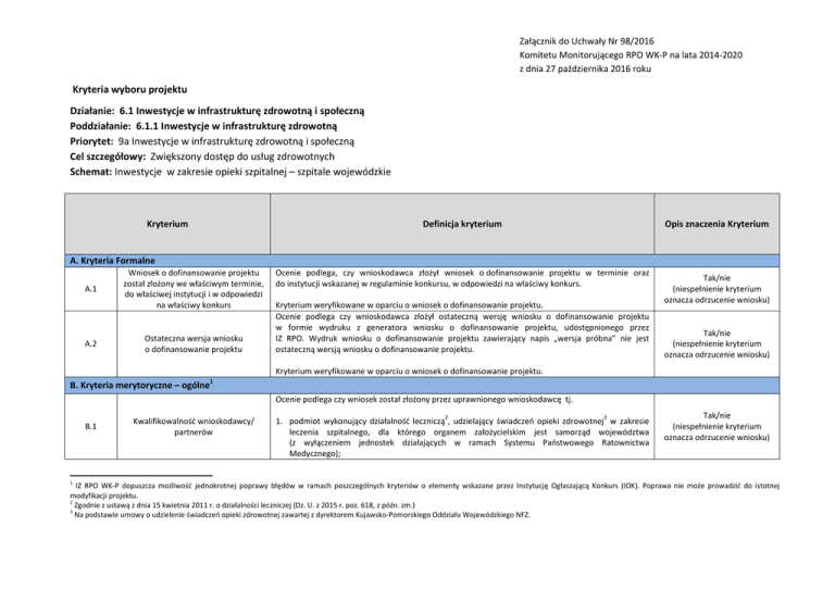 Załącznik do Uchwały Nr 98/2016 Komitetu Monitorującego RPO WK-P na lata 2014-2020 z dnia 27 października 2016 roku Kryteria wyboru projektu Działanie: 6.1 Inwestycje w infrastrukturę zdrowotną i społeczną Poddziałanie: 6.1.1 Inwestycje w infrastrukturę zdrowotną Priorytet: 9a Inwestycje w infrastrukturę zdrowotną i społeczną Cel szczegółowy: Zwiększony dostęp do usług zdrowotnych Schemat: Inwestycje w zakresie opieki szpitalnej – szpitale wojewódzkie Kryterium Definicja kryterium Opis znaczenia Kryterium A. Kryteria Formalne A.1 A.2 Wniosek o dofinansowanie projektu został złożony we właściwym terminie, do właściwej instytucji i w odpowiedzi na właściwy konkurs Ostateczna wersja wniosku o dofinansowanie projektu Ocenie podlega, czy wnioskodawca złożył wniosek o dofinansowanie projektu w terminie oraz do instytucji wskazanej w regulaminie konkursu, w odpowiedzi na właściwy konkurs. Kryterium weryfikowane w oparciu o wniosek o dofinansowanie projektu. Ocenie podlega czy wnioskodawca złożył ostateczną wersję wniosku o dofinansowanie projektu w formie wydruku z generatora wniosku o dofinansowanie projektu, udostępnionego przez IZ RPO. Wydruk wniosku o dofinansowanie projektu zawierający napis „wersja próbna” nie jest ostateczną wersją wniosku o dofinansowanie projektu. Tak/nie (niespełnienie kryterium oznacza odrzucenie wniosku) Tak/nie (niespełnienie kryterium oznacza odrzucenie wniosku) Kryterium weryfikowane w oparciu o wniosek o dofinansowanie projektu. B. Kryteria merytoryczne – ogólne 1 Ocenie podlega czy wniosek został złożony przez uprawnionego wnioskodawcę tj. B.1 1 Kwalifikowalność wnioskodawcy/ partnerów 2 3 1. podmiot wykonujący działalność leczniczą , udzielający świadczeń opieki zdrowotnej w zakresie leczenia szpitalnego, dla którego organem założycielskim jest samorząd województwa (z wyłączeniem jednostek działających w ramach Systemu Państwowego Ratownictwa Medycznego); Tak/nie (niespełnienie kryterium oznacza odrzucenie wniosku) IZ RPO WK-P dopuszcza możliwość jednokrotnej poprawy błędów w ramach poszczególnych kryteriów o elementy wskazane przez Instytucję Ogłaszającą Konkurs (IOK). Poprawa nie może prowadzić do istotnej modyfikacji projektu. 2 Zgodnie z ustawą z dnia 15 kwietnia 2011 r. o działalności leczniczej (Dz. U. z 2015 r. poz. 618, z późn. zm.) 3 Na podstawie umowy o udzielenie świadczeń opieki zdrowotnej zawartej z dyrektorem Kujawsko-Pomorskiego Oddziału Wojewódzkiego NFZ. Załącznik do Uchwały Nr 98/2016 Komitetu Monitorującego RPO WK-P na lata 2014-2020 z dnia 27 października 2016 roku 2. spółkę z większościowym udziałem jednostek samorządu przedsięwzięcia medyczne na rzecz ww. podmiotu leczniczego. B.2 B.3 Prawidłowość wyboru partnerów uczestniczących/realizujących projekt Niepodleganie wykluczeniu z możliwości otrzymania dofinansowania ze środków Unii Europejskiej terytorialnego, realizującą Kryterium weryfikowane w oparciu o wniosek o dofinansowanie projektu oraz załączniki. Ocenie podlega czy wnioskodawca dokonał wyboru partnera/ów zgodnie z przepisami ustawy z dnia 11 lipca 2014 r. o zasadach realizacji programów w zakresie polityki spójności finansowanych w perspektywie 2014-2020 (Dz. U. z 2016 r. poz. 217). Kryterium będzie weryfikowane w oparciu o oświadczenie wnioskodawcy stanowiące integralną część wniosku o dofinansowanie projektu. Wykluczenie podmiotowe (dotyczące wnioskodawcy): Ocenie podlega czy wnioskodawca oraz partnerzy (jeśli dotyczy) nie podlegają wykluczeniu z możliwości ubiegania się o dofinansowanie oraz że nie są objęci zakazem dostępu do środków funduszy europejskich na podstawie: - art. 207 ust. 4 ustawy z dnia 27 sierpnia 2009 r. o finansach publicznych (Dz. U. z 2013 r. poz. 885 ze zm.), - art. 12 ust. 1 pkt 1 ustawy z dnia 15 czerwca 2012 r. o skutkach powierzania wykonywania pracy cudzoziemcom przebywającym wbrew przepisom na terytorium Rzeczypospolitej Polskiej (Dz. U. z 2012 r. poz. 769), - art. 9 ust. 1 pkt 2a ustawy z dnia 28 października 2002 r. o odpowiedzialności podmiotów zbiorowych za czyny zabronione pod groźbą kary (tekst jednolity: Dz. U. z 2015 r. poz. 1212). - przepisów zawartych w art. 37 ust. 3 ustawy z dnia 11 lipca 2014 r. o zasadach realizacji programów w zakresie polityki spójności finansowanych w perspektywie finansowej 2014–2020 (Dz. U. 2016, poz. 217). Tak/nie/nie dotyczy (niespełnienie kryterium oznacza odrzucenie wniosku) Tak/nie (niespełnienie kryterium oznacza odrzucenie wniosku) Wykluczenia przedmiotowe (dotyczące przedmiotu projektu): Przedmiot realizacji projektu nie dotyczy rodzajów działalności wykluczonych z możliwości uzyskania pomocy finansowej, o których mowa w art. 3 ust. 3 rozporządzenia PE i Rady (UE) NR 1301/2013 z dnia 17 grudnia 2013 r. w sprawie Europejskiego Funduszu Rozwoju Regionalnego i przepisów szczególnych dotyczących celu "Inwestycje na rzecz wzrostu i zatrudnienia" oraz w sprawie uchylenia rozporządzenia (WE) nr 1080/2006) oraz projekt nie obejmuje przedsięwzięć, które zostały objęte lub 4 powinny zostać objęte procedurą odzyskiwania (w rozumieniu art. 71 rozporządzenia nr 1303/2013 ) w następstwie przeniesienia działalności produkcyjnej poza obszar objęty programem zgodnie z art. 125 ust. 3 lit. f) rozporządzenia nr 1303/2013. 4 Rozporządzenie Parlamentu Europejskiego i Rady (UE) nr 1303/2013 z dnia 17 grudnia 2013 r. ustanawiające wspólne przepisy dotyczące Europejskiego Funduszu Rozwoju Regionalnego, Europejskiego Funduszu Społecznego, Funduszu Spójności, Europejskiego Funduszu Rolnego na rzecz Rozwoju Obszarów Wiejskich oraz Europejskiego Funduszu Morskiego i Rybackiego oraz ustanawiające przepisy ogólne dotyczące Europejskiego Funduszu Rozwoju Regionalnego, Europejskiego Funduszu Społecznego, Funduszu Spójności i Europejskiego Funduszu Morskiego i Rybackiego oraz uch