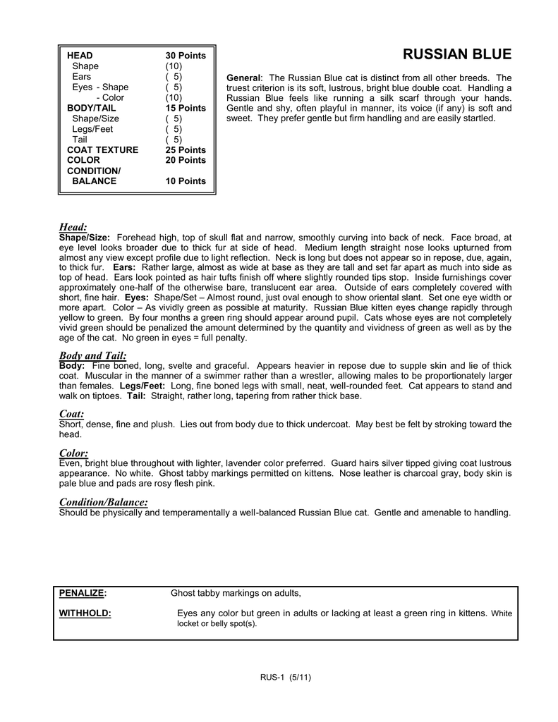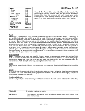 HEAD Shape Ears Eyes - Shape - Color BODY/TAIL Shape/Size Legs/Feet Tail COAT TEXTURE COLOR CONDITION/ BALANCE 30 Points (10) ( 5) ( 5) (10) 15 Points ( 5) ( 5) ( 5) 25 Points 20 Points RUSSIAN BLUE General: The Russian Blue cat is distinct from all other breeds. The truest criterion is its soft, lustrous, bright blue double coat. Handling a Russian Blue feels like running a silk scarf through your hands. Gentle and shy, often playful in manner, its voice (if any) is soft and sweet. They prefer gentle but firm handling and are easily startled. 10 Points Head: Shape/Size: Forehead high, top of skull flat and narrow, smoothly curving into back of neck. Face broad, at eye level looks broader due to thick fur at side of head. Medium length straight nose looks upturned from almost any view except profile due to light reflection. Neck is long but does not appear so in repose, due, again, to thick fur. Ears: Rather large, almost as wide at base as they are tall and set far apart as much into side as top of head. Ears look pointed as hair tufts finish off where slightly rounded tips stop. Inside furnishings cover approximately one-half of the otherwise bare, translucent ear area. Outside of ears completely covered with short, fine hair. Eyes: Shape/Set – Almost round, just oval enough to show oriental slant. Set one eye width or more apart. Color – As vividly green as possible at maturity. Russian Blue kitten eyes change rapidly through yellow to green. By four months a green ring should appear around pupil. Cats whose eyes are not completely vivid green should be penalized the amount determined by the quantity and vividness of green as well as by the age of the cat. No green in eyes = full penalty. Body and Tail: Body: Fine boned, long, svelte and graceful. Appears heavier in repose due to supple skin and lie of thick coat. Muscular in the manner of a swimmer rather than a wrestler, allowing males to be proportionately larger than females. Legs/Feet: Long, fine boned legs with small, neat, well-rounded feet. Cat appears to stand and walk on tiptoes. Tail: Straight, rather long, tapering from rather thick base. Coat: Short, dense, fine and plush. Lies out from body due to thick undercoat. May best be felt by stroking toward the head. Color: Even, bright blue throughout with lighter, lavender color preferred. Guard hairs silver tipped giving coat lustrous appearance. No white. Ghost tabby markings permitted on kittens. Nose leather is charcoal gray, body skin is pale blue and pads are rosy flesh pink. Condition/Balance: Should be physically and temperamentally a well-balanced Russian Blue cat. Gentle and amenable to handling. PENALIZE: WITHHOLD: Ghost tabby markings on adults, Eyes any color but green in adults or lacking at least a green ring in kittens. White locket or belly spot(s). RUS-1 (5/11)