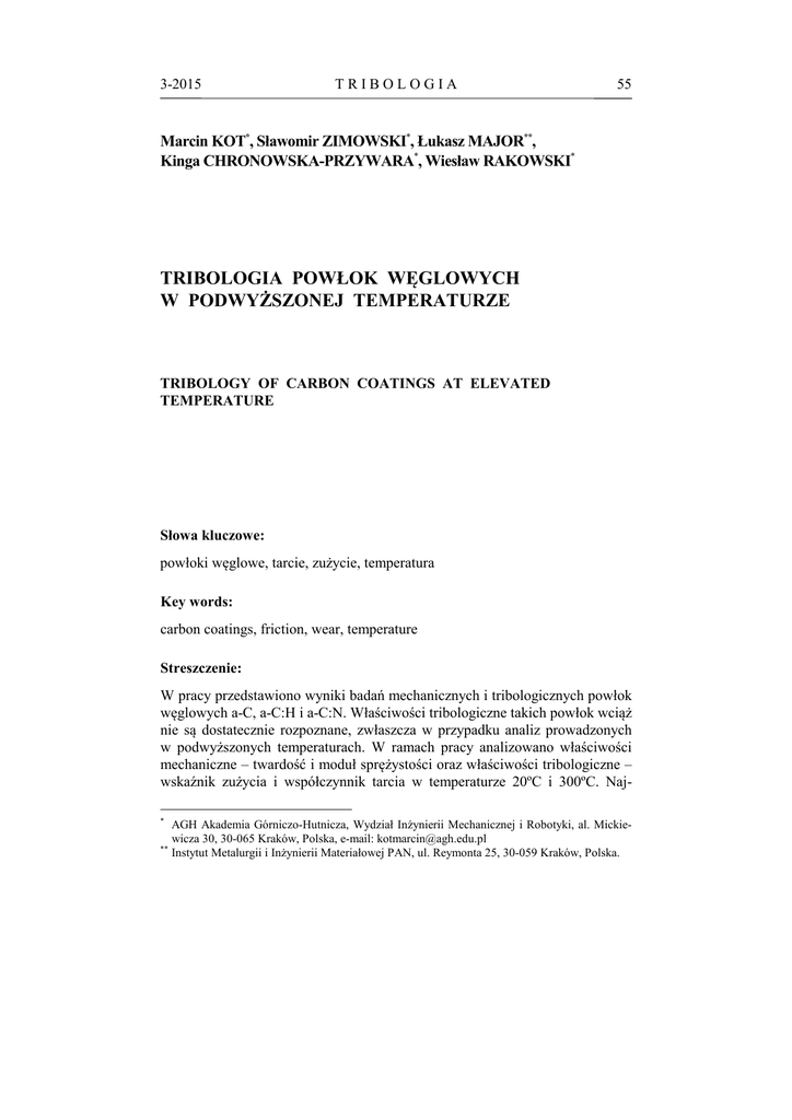 3-2015 TRIBOLOGIA 55 Marcin KOT*, Sławomir ZIMOWSKI*, Łukasz MAJOR**, Kinga CHRONOWSKA-PRZYWARA*, Wiesław RAKOWSKI* TRIBOLOGIA POWŁOK WĘGLOWYCH W PODWYŻSZONEJ TEMPERATURZE TRIBOLOGY OF CARBON COATINGS AT ELEVATED TEMPERATURE Słowa kluczowe: powłoki węglowe, tarcie, zużycie, temperatura Key words: carbon coatings, friction, wear, temperature Streszczenie: W pracy przedstawiono wyniki badań mechanicznych i tribologicznych powłok węglowych a-C, a-C:H i a-C:N. Właściwości tribologiczne takich powłok wciąż nie są dostatecznie rozpoznane, zwłaszcza w przypadku analiz prowadzonych w podwyższonych temperaturach. W ramach pracy analizowano właściwości mechaniczne – twardość i moduł sprężystości oraz właściwości tribologiczne – wskaźnik zużycia i współczynnik tarcia w temperaturze 20ºC i 300ºC. Naj* AGH Akademia Górniczo-Hutnicza, Wydział Inżynierii Mechanicznej i Robotyki, al. Mickiewicza 30, 30-065 Kraków, Polska, e-mail: [email protected] ** Instytut Metalurgii i Inżynierii Materiałowej PAN, ul. Reymonta 25, 30-059 Kraków, Polska. 56 TRIBOLOGIA 3-2015 twardszą z powłok okazała się powłoka a-C – 17 GPa, a najmiększą a-C:H – 7GPa. Testy tribologiczne w temperaturze pokojowej wykazały, że współczynnik tarcia jest najmniejszy dla powłoki a-C, a najwyższy dla a-C:N – odpowiednio µ = 0,05 i 0,24. Najniższe wartość wskaźnika zużycia zmierzono także dla powłoki a-C. Natomiast w temperaturze 300ºC najlepszą okazała się powłoka uwodorniona a-C:H, dla której zużycie było tylko nieznacznie wyższe niż w temperaturze pokojowej, a współczynnik tarcia wynosił 0,04. Zużycie powłoki a-C:N jest 20-krotnie większe niż powłoki a-C:H, chociaż współczynnik tarcia w całym zakresie 20 000 cykli testu tribologicznego wynosił tylko 0,05. Natomiast powłoka a-C w warunkach przeprowadzanego testu została całkowicie zniszczona już po 7000 cykli. WPROWADZENIE Powłoki na bazie węgla nakładane metodami PVD i CVD cieszą się dużym zainteresowaniem od około 20 lat. Wynika to z ich bardzo dobrych właściwości tribologicznych, odporności chemicznej na kwasy i zasady oraz biozgodności. Pojęcie „powłoki węglowe” dotyczy bardzo szerokiej grupy materiałów o znacząco różnych właściwościach. Zależą one przede wszystkim od ilości wiązań o hybrydyzacji sp3 typowych dla diamentu i sp2 występujących w graficie oraz udziału innych pierwiastków jak wodór H czy azot N [L. 1, 2]. W zależności od udziału wiązań sp3/sp2 oraz obecności głównie wodoru dzieli się je na kilka grup: – nieuwodornione powłoki amorficzne a-C i tetraedryczne ta-C, – uwodornione powłoki a-C:H, – powłoki z dodatkiem głównie metali Me/a-C czy Me/a-C:H posiadające często budowę nanokompozytową. Układ potrójnej równowagi węgla z wiązaniami sp3, sp2 oraz wodoru wraz z wynikającymi z nich właściwościami mechanicznymi powłok przedstawiono w pracy [L. 3]. Twardość powłok węglowych wynosi od 5GPa dla powłok a-C:H o dużym udziale wiązań sp2, do 50 GPa i więcej dla powłok ta-C. Jednak wraz ze wzrostem twardości maleje odporność na pękanie powłok węglowych, a typowe wartości krytycznego współczynnika intensywności naprężeń K1C mieszczą się w zakresie 0,5÷5 MPa·m1/2. Większe wartości parametru K1C = 2–5 MPa·m1/2, ale mniejszą twardość posiadają powłoki uwodornione a-C:H. Wprowadzenie wodoru do powłoki powoduje także zmniejszenie naprężeń własnych ściskających z 3÷5 GPa do 1÷2 GPa [L. 4], co znacząco poprawia adhezję tych powłok do podłoży metalowych. Poprawę odporności na zarysowanie powłok na bazie węgla uzyskuje się przez nakładanie cienkich międzywarstw metalicznych Ti czy Cr o grubości kilkudziesięciu nanometrów. Właściwości tribologiczne powłok węglowych zależą od rodzaju powłoki, styku tribologicznego, charakteru obciążeń, atmosfery czy temperatury. Powło- 3-2015 TRIBOLOGIA 57 ki nieuwodornione a-C charakteryzują się dużymi oporami tarcia przy wysokich temperaturach i w próżni. Tłumaczy się to silnym oddziaływaniem nieobsadzonych, najsilniejszych węglowych wiązań σ i adhezyjnym sczepianiem się ich z innymi atomami, gdy są one bezpośrednio na powierzchni [L. 1, 6]. Wtedy wartość współczynnika tarcia może sięgać nawet 1. Jeżeli jednak na powierzchni nastąpi pasywacja takich wiązań przez zaadsorbowane cząsteczki gazów z atmosfery lub wilgoć, to może ona znacząco ograniczać tarcie i zużycie takich powłok. Charakterystyczne dla takich powłok jest zmniejszanie wartości współczynnika tarcia wraz ze zwiększaniem wilgotności powietrza [L. 3]. Blokowanie możliwości niepożądanego oddziaływania wiązań σ przez atomy wodoru obserwuje się w przypadku powłok a-C:H [L. 2]. Powłoki takie osadza się zazwyczaj w atmosferze metanu CH4 lub acetylenu C2H2. Typowe wartości współczynnika tarcia µ<0,05 oraz bardzo niskie wartości wskaźnika zużycia Wv<10-7 obserwuje się dla nich w próżni, w atmosferze suchego powietrza czy w gazach obojętnych. Jest to efektem przenoszonej na partnera tribologicznego cienkiej, hydrofobowej tribowarstwy węglowej powodującej powstanie na powierzchni współpracujących dwóch warstw a-C:H i istnienie między nimi tylko słabych oddziaływań van der Vaals'a [L. 5]. Natomiast typowy dla powłok a-C:H jest wzrost współczynnika tarcia do µ = 0,1÷0,2 w środowisku wilgotnego powietrza, kiedy to zostaje zaburzona współpraca dwóch węglowych warstw. W atmosferze powietrza świetne właściwości tribologiczne uwodornionych powłok węglowych przypisuje się procesowi grafityzacji zachodzącemu na ich powierzchni. Liu i inni [L. 7] opisali ten proces, wskazując, że możliwy jest on dzięki uwalnianiu wodoru z powierzchni, a następnie na skutek wzrostu temperatury w strefie tarcia i silnych naprężeń ścinających tworzona jest cienka warstwy grafitu ma powierzchni 