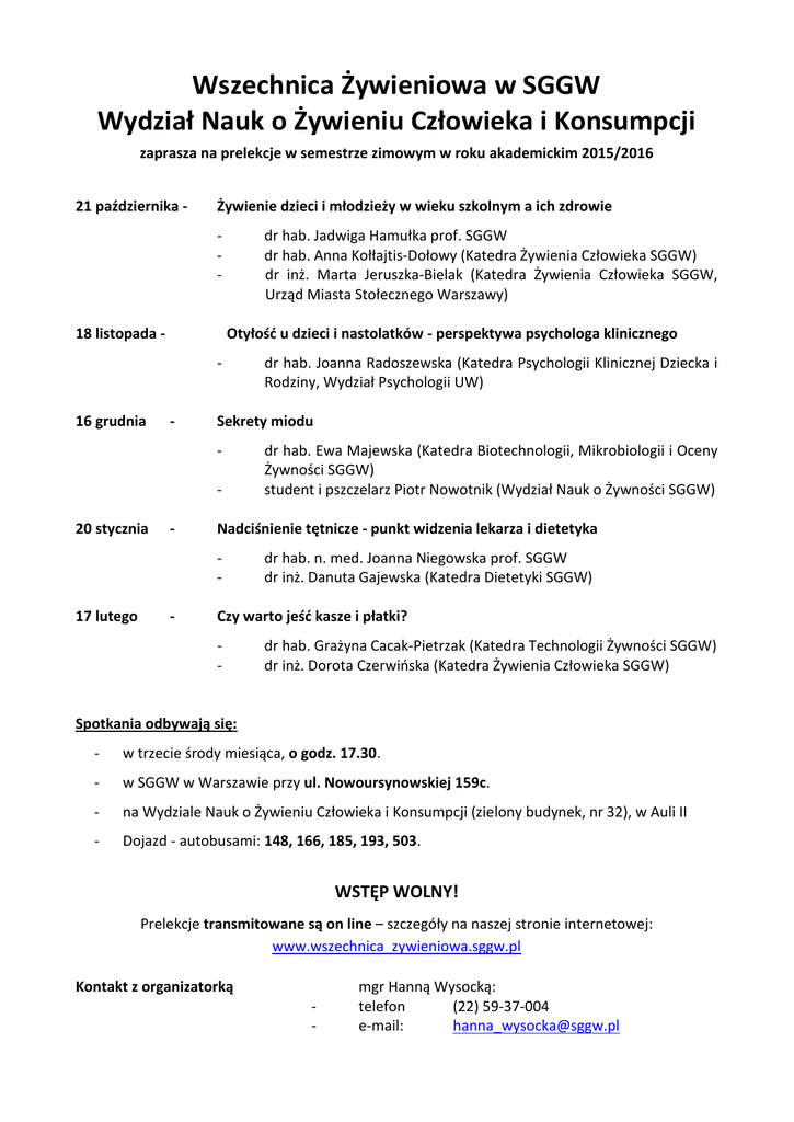 Wszechnica Żywieniowa w SGGW Wydział Nauk o Żywieniu Człowieka i Konsumpcji zaprasza na prelekcje w semestrze zimowym w roku akademickim 2015/2016 21 października - Żywienie dzieci i młodzieży w wieku szkolnym a ich zdrowie - 18 listopada - dr hab. Jadwiga Hamułka prof. SGGW dr hab. Anna Kołłajtis-Dołowy (Katedra Żywienia Człowieka SGGW) dr inż. Marta Jeruszka-Bielak (Katedra Żywienia Człowieka SGGW, Urząd Miasta Stołecznego Warszawy) Otyłość u dzieci i nastolatków - perspektywa psychologa klinicznego - 16 grudnia - Sekrety miodu - 20 stycznia - - dr hab. Ewa Majewska (Katedra Biotechnologii, Mikrobiologii i Oceny Żywności SGGW) student i pszczelarz Piotr Nowotnik (Wydział Nauk o Żywności SGGW) Nadciśnienie tętnicze - punkt widzenia lekarza i dietetyka - 17 lutego dr hab. Joanna Radoszewska (Katedra Psychologii Klinicznej Dziecka i Rodziny, Wydział Psychologii UW) dr hab. n. med. Joanna Niegowska prof. SGGW dr inż. Danuta Gajewska (Katedra Dietetyki SGGW) Czy warto jeść kasze i płatki? - dr hab. Grażyna Cacak-Pietrzak (Katedra Technologii Żywności SGGW) dr inż. Dorota Czerwińska (Katedra Żywienia Człowieka SGGW) Spotkania odbywają się: - w trzecie środy miesiąca, o godz. 17.30. - w SGGW w Warszawie przy ul. Nowoursynowskiej 159c. - na Wydziale Nauk o Żywieniu Człowieka i Konsumpcji (zielony budynek, nr 32), w Auli II - Dojazd - autobusami: 148, 166, 185, 193, 503. WSTĘP WOLNY! Prelekcje transmitowane są on line – szczegóły na naszej stronie internetowej: www.wszechnica_zywieniowa.sggw.pl Kontakt z organizatorką - mgr Hanną Wysocką: telefon (22) 59-37-004 e-mail: [email protected]