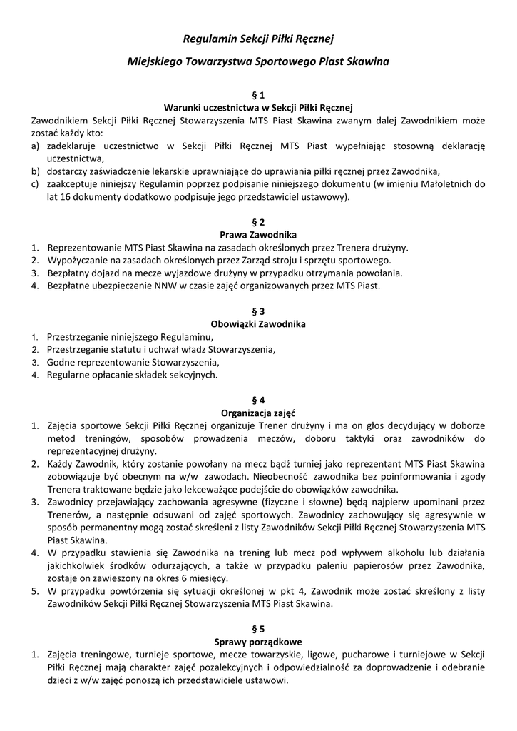 Regulamin Sekcji Piłki Ręcznej Miejskiego Towarzystwa Sportowego Piast Skawina §1 Warunki uczestnictwa w Sekcji Piłki Ręcznej Zawodnikiem Sekcji Piłki Ręcznej Stowarzyszenia MTS Piast Skawina zwanym dalej Zawodnikiem może zostać każdy kto: a) zadeklaruje uczestnictwo w Sekcji Piłki Ręcznej MTS Piast wypełniając stosowną deklarację uczestnictwa, b) dostarczy zaświadczenie lekarskie uprawniające do uprawiania piłki ręcznej przez Zawodnika, c) zaakceptuje niniejszy Regulamin poprzez podpisanie niniejszego dokumentu (w imieniu Małoletnich do lat 16 dokumenty dodatkowo podpisuje jego przedstawiciel ustawowy). 1. 2. 3. 4. §2 Prawa Zawodnika Reprezentowanie MTS Piast Skawina na zasadach określonych przez Trenera drużyny. Wypożyczanie na zasadach określonych przez Zarząd stroju i sprzętu sportowego. Bezpłatny dojazd na mecze wyjazdowe drużyny w przypadku otrzymania powołania. Bezpłatne ubezpieczenie NNW w czasie zajęć organizowanych przez MTS Piast. 1. 2. 3. 4. §3 Obowiązki Zawodnika Przestrzeganie niniejszego Regulaminu, Przestrzeganie statutu i uchwał władz Stowarzyszenia, Godne reprezentowanie Stowarzyszenia, Regularne opłacanie składek sekcyjnych. 1. 2. 3. 4. 5. §4 Organizacja zajęć Zajęcia sportowe Sekcji Piłki Ręcznej organizuje Trener drużyny i ma on głos decydujący w doborze metod treningów, sposobów prowadzenia meczów, doboru taktyki oraz zawodników do reprezentacyjnej drużyny. Każdy Zawodnik, który zostanie powołany na mecz bądź turniej jako reprezentant MTS Piast Skawina zobowiązuje być obecnym na w/w zawodach. Nieobecność zawodnika bez poinformowania i zgody Trenera traktowane będzie jako lekceważące podejście do obowiązków zawodnika. Zawodnicy przejawiający zachowania agresywne (fizyczne i słowne) będą najpierw upominani przez Trenerów, a następnie odsuwani od zajęć sportowych. Zawodnicy zachowujący się agresywnie w sposób permanentny mogą zostać skreśleni z listy Zawodników Sekcji Piłki Ręcznej Stowarzyszenia MTS Piast Skawina. W przypadku stawienia się Zawodnika na trening lub mecz pod wpływem alkoholu lub działania jakichkolwiek środków odurzających, a także w przypadku paleniu papierosów przez Zawodnika, zostaje on zawieszony na okres 6 miesięcy. W przypadku powtórzenia się sytuacji określonej w pkt 4, Zawodnik może zostać skreślony z listy Zawodników Sekcji Piłki Ręcznej Stowarzyszenia MTS Piast Skawina. §5 Sprawy porządkowe 1. Zajęcia treningowe, turnieje sportowe, mecze towarzyskie, ligowe, pucharowe i turniejowe w Sekcji Piłki Ręcznej mają charakter zajęć pozalekcyjnych i odpowiedzialność za doprowadzenie i odebranie dzieci z w/w zajęć ponoszą ich przedstawiciele ustawowi. 2. Trener drużyny co najmniej raz w rundzie cyklu rozgrywek piłkarskich spotyka się z zawodnikami/ przedstawicielami ustawowymi Zawodników Małoletnich, aby przedstawić plany i wyniki sportowe drużyny oraz Zawodników. 3. W przypadku pogarszających się wyników w szkole Zawodnika uczącego się, powinien on zgłosić Trenerowi swoją trudną sytuację. 4. Zawodnik chcący opuścić MTS Piast Skawina zobowiązany jest swoją decyzję przedstawić na piśmie Trenerowi drużyny lub bezpośrednio do Zarządu Stowarzyszenia. 1. 2. 3. 4. 5. §6 Składki członkowskie Sekcji Piłki Ręcznej Składki członkowskie Sekcji Piłki Ręcznej przeznaczane są między innymi na zakup sprzętu niezbędnego do przeprowadzania treningów (piłki, pachołki, znaczniki i in.), stroje zawodników oraz transport zawodników na ligowe mecze wyjazdowe. Składka członkowska Sekcji Piłki Ręcznej wynosi 100 zł (słownie: sto złotych) za jeden miesiąc, przy czym MTS Piast Skawina udziela wszystkim zawodnikom sekcji piłki ręcznej rabatu w wysokości 50% kwoty składki. Składka członkowska powinna być wpłacana na konto MTS Piast Skawina (BS w Skawinie nr 81 8600 0002 0000 0098 6870 0001) do 10 dnia każdego miesiąca, w którym Zawodnik jest członkiem Sekcji. W przypadku zmian barw klubowych, przedstawiciel ustawowy Zawodnika zobowiązuje się do zwrotu kwoty w wysokości udzielonego Zawodnikowi rabatu za cały okres członkostwa w Sekcji Piłki Ręcznej. W uzasadnionych przypadkach, na pisemny wniosek zawodnika/przedstawiciela ustawowego Zawodnika, MTS Piast Skawina może od takiego postępowania odstąpić. W przypadku trudnej sytuacji materialnej zawodnika/rodziny Zawodnika, na pisemny wniosek zawodnika/jego przedstawiciela ustawowego, składka członkowska Sekcji Piłki Ręcznej może ulec obniżeniu przez Zarząd MTS Piast Skawina, po konsultacji z: Trenerem, przedstawicielem Szkoły, do której Zawodnik uczęszcza oraz ew. pracownikami właściwych, ze względu na miejsce zamieszkania, ośrodków pomocy społecznej. §7 Sprzęt 1. Sprzęt zostaje wypożyczony Zawodnikowi na okres, w którym jest członkiem Sekcji Piłki Ręcznej. 2. Zawodnik Sekcji Piłki Ręcznej zobowiązuje się dbać o powierzony mu sprzęt, a w przypadku jego celowego zniszczenia lub zawinionej utraty zobowiązuje się zwrócić koszty zniszczonego lub utraconego sprzętu. §8 Końcowe postanowienie We wszelkich sprawach spornych Zarząd MTS Piast Skawina zastrzega dla siebie ostateczne rozstrzygnięcie. --------------------------------------------------------------------------------Zobowiązuję się do przestrzegania powyższego regulaminu i wykonywania poleceń Trenera. Skawina, dnia ……-……-………… .......................................................... ……………..……………………………………… czytelny podpis Zawodnika podpis Przedstawiciela Ustawowego