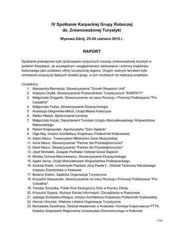 IV Spotkanie Karpackiej Grupy Roboczej ds. Zrównoważonej Turystyki Wysowa Zdrój, 2526 czerwca 2015 r. RAPORT Spotkanie poświęcone było opracowaniu wytycznych rozwoju zrównoważonej turystyki w polskich Karpatach, ze szczególnym uwzględnieniem zachowania i ochrony krajobrazu kulturowego jako podstawy oferty turystycznej regionu. Drugim ważnym tematem było omówienie propozycji dalszych działań grupy, w tym możliwych do realizacji projektów. Uczestnicy: 1. Aleksandra Biernacka, Stowarzyszenie "Growth Research Unit" 2. Grażyna Chytła, Stowarzyszenie Przewodników Turystycznych "KARPATY" 3. Małgorzata Draganik, Stowarzyszenie na rzecz Rozwoju i Promocji Podkarpacia "Pro Carpathia" 4. Małgorzata Fedas, Stowarzyszenie Ekopsychologia 5. Anastazja GłogowskaMikoś, Urząd Miasta Kołaczyce 6. Stefan Hładyk, Zjednoczenie Łemków 7. Małgorzata Kozak, Departament Turystyki Urzędu Marszałkowskiego Województwa Małopolskiego 8. Robert Księżopolski, Agroturystyka “Dom Sądecki” 9. Olga Maj, Instytut Architektury Krajobrazu Politechniki Krakowskiej 10. Adam Mazur, Towarzystwo Miłośników Ziemi Muszyńskiej 11. Anna Mazur, Stowarzyszenie "Partner dla Przedsiębiorczości" 12. Karol Mazur, Stowarzyszenie "Partner dla Przedsiębiorczości" 13. Józef Michałek, Związek Podhalan Oddział Górali Śląskich 14. Monika OchwatMarcinkiewicz, Stowarzyszenie Ekopsychologia 15. Agata Sarna, Urząd Marszałkowski Województwa Podkarpackiego 16. Andrzej Siwek, Uniwersytet Papieski Jana Pawła II , Oddział Terenowy Narodowego Instytutu Dziedzictwa w Krakowie 17. Bożena Srebro, Sądecka Organizacja Turystyczna 18. Krzysztof Staszewski, Stowarzyszenie na rzecz Rozwoju i Promocji Podkarpacia "Pro Carpathia" 19. Tomasz Szczotka, Polski Klub Ekologiczny Koło w Krynicy Zdroju 20. Krzysztof Szpara, Wyższa Szkoła Informatyki i Zarządzania w Rzeszowie 21. Jadwiga ŚrodulskaWielgus, Instytut Architektury Krajobrazu Politechniki Krakowskiej 22. Henryk Uhryński, Wielicka Lokalna Organizacja Turystyczna 23. Bernadetta Zawilińska, Oddział Akademicki w Krakowie i Komisja Krajoznawcza PTTK, Katedra Gospodarki Regionalnej Uniwersytetu Ekonomicznego w Krakowie ć1/6 Wszystkie prezentacje i inne materiały ze spotkania dostępne są na stronie internetowej Porozumienia . W pierwszej, wprowadzającej części spotkania zaprezentowane zostały działania Porozumienia Karpackiego „Karpaty Naszym Domem”, w tym projekt „Karpaty łączą – mechanizm konsultacji i współpracy dla wdrażania konwencji karpackiej” (Monika OchwatMarcinkiewicz, Stowarzyszenie Ekopsychologia). Następnie rozpoczęto prace nad Wytycznymi rozwoju zrównoważonej turystyki w Karpatach . W ramach wprowadzenia do tematu zaprezentowana została robocza wersja wytycznych, opracowana na poprzednim spotkaniu grupy, w Łopusznej, w dn. 2425 kwietnia 2015 roku (Małgorzata Fedas, Stowarzyszenie Ekopsychologia). Głos w dyskusji zabrał Andrzej Siwek, Dyrektor Krakowskiego Oddziału Narodowego Instytutu Dziedzictwa , prezentując temat: Zabytek w krajobrazie, czy krajobraz zabytkowy? W kolejnym kroku uczestnicy pracowali metodą world café nad rekomendacjami dla grup interesariuszy określonych w wytycznych, tj. przedsiębiorców, samorządów lokalnych, organizacji pozarządowych, administracji obszarów chronionych i uczelni. Przy każdym ze stolików, reprezentujących ww. grupy, omówiono następujące zagadnienia: (1) ZABYTKI/DZIEDZICTWO MATERIALNE Jak rozwijać funkcję turystyczną zabytków/dziedzictwa materialnego? (2) DOBRE PRAKTYKI Jak propagować dobre praktyki w zarządzaniu infrastruktura wspierającą? Jak prowadzić obiekt turystyczny? (3) AKTYWIZACJA LOKALNA Jak wyzwolić działanie w turystyce? Jak inicjować spotkania partnerskie? (4) PRODUKT LOKALNY I JAKOŚĆ Jak tworzyć lokalne produkty? Jak wprowadzać mądre innowacje? Co decyduje o jakości? (5) PRODUKT LOKALNY ZWIĄZANY Z ZASOBAMI PRZYRODNICZYMI Jak rozłożyć odpowiedzialność za gospodarowanie tymi zasobami? Jak włączyć je do oferty? Rezultaty dyskusji przedstawione zostały na forum grupy i naniesione na tekst wytycznych (plik w załączeniu). ć2/6 Wytyczne zostaną przekazane do konsultacji poszczególnym grupom interesariuszy, a następnie po opracowaniu ostatecznej wersji spopularyzowane w regionie. W drugiej części spotkania uczestnicy zajęli się omówieniem propozycji dalszych działań grupy, w tym możliwych do realizacji projektów . Pod dyskusję poddano następujące koncepcje: (1) Szlak Kultury Wołoskiej (2) Przedsiębiorczość kobiet (3) Polskoukraińska wymiana młodzieży (4) Badanie wpływu obszarów chronionych na rozwój społecznogospodarczy (5) Ekomuzeum Sądecczyzny (6) Korytarze ekologiczne (7) Ginące zawody i utworzono cztery grupy tematyczne: (1) Ginące zawody. Aktywizacja istniejących inicjatyw Opiekun: Stefan Hładyk, Zjednoczenie Łemków Partnerzy: NGO, podmioty działające w turystyce, rzemieślnicy, uczelnie Działania: 1. opracowanie koncepcji aktywizacji i rozwoju 2. nawiązanie do istniejących inicjatyw, jak np. Szlak Rzemiosła (Fundacja Nad Wyraz), Szlak Architektury Drewnianej, który funkcjonuje w całych polskich Karpatach, Szlak Winny na Podkarpaciu, Szlak Papieski, w celu: rozszerzenie, uatrakcyjnienia, usprawnienia 3. promocja materiały promocyjne i reklamowe, obecność w internecie i na portalach społecznościowych, udział w targach turystycznych Źródła finansowania: środki własne partnerów, granty, potrzebne m.in. na sfinansowanie promocji oraz tworzenie nowych miejsc z ginącymi zawodami (lub “poprawienie” istniejących) – żeby rzemieślnicy mogli dostosować swoją działalność na przyjęcie gości Głosy w dyskusji: ○ Ważne jest nawiązanie współpracy z uczelniami, w tym wypadku np. inwentaryzacja, opracowanie koncepcji aktywizacji, co może być wykonywane podczas praktyk studenckich. ○ Także w tym kontekście współpraca z lokalnymi organizacjami tury