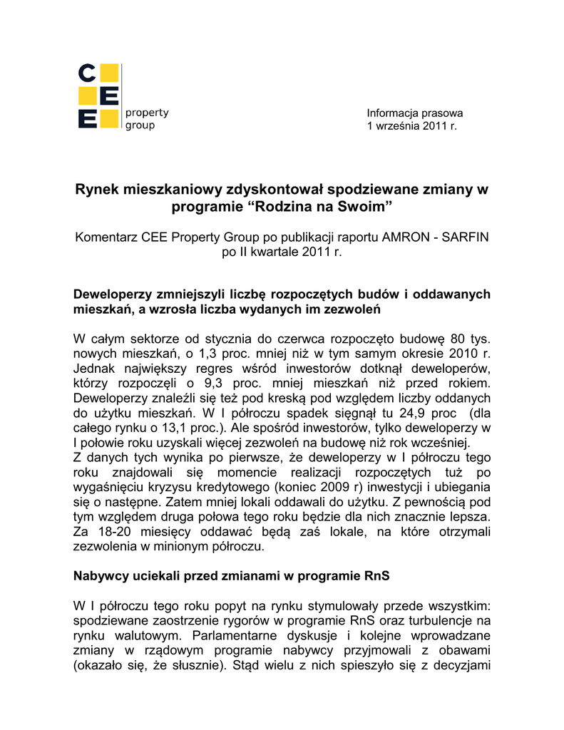 nformacja Warsza Informacja prasowa 1 września 2011 r. Rynek mieszkaniowy zdyskontował spodziewane zmiany w programie “Rodzina na Swoim” Komentarz CEE Property Group po publikacji raportu AMRON - SARFIN po II kwartale 2011 r. Deweloperzy zmniejszyli liczbę rozpoczętych budów i oddawanych mieszkań, a wzrosła liczba wydanych im zezwoleń W całym sektorze od stycznia do czerwca rozpoczęto budowę 80 tys. nowych mieszkań, o 1,3 proc. mniej niż w tym samym okresie 2010 r. Jednak największy regres wśród inwestorów dotknął deweloperów, którzy rozpoczęli o 9,3 proc. mniej mieszkań niż przed rokiem. Deweloperzy znaleźli się też pod kreską pod względem liczby oddanych do użytku mieszkań. W I półroczu spadek sięgnął tu 24,9 proc (dla całego rynku o 13,1 proc.). Ale spośród inwestorów, tylko deweloperzy w I połowie roku uzyskali więcej zezwoleń na budowę niż rok wcześniej. Z danych tych wynika po pierwsze, że deweloperzy w I półroczu tego roku znajdowali się momencie realizacji rozpoczętych tuż po wygaśnięciu kryzysu kredytowego (koniec 2009 r) inwestycji i ubiegania się o następne. Zatem mniej lokali oddawali do użytku. Z pewnością pod tym względem druga połowa tego roku będzie dla nich znacznie lepsza. Za 18-20 miesięcy oddawać będą zaś lokale, na które otrzymali zezwolenia w minionym półroczu. Nabywcy uciekali przed zmianami w programie RnS W I półroczu tego roku popyt na rynku stymulowały przede wszystkim: spodziewane zaostrzenie rygorów w programie RnS oraz turbulencje na rynku walutowym. Parlamentarne dyskusje i kolejne wprowadzane zmiany w rządowym programie nabywcy przyjmowali z obawami (okazało się, że słusznie). Stąd wielu z nich spieszyło się z decyzjami zakupowymi i ruszyło do banków po dotowane kredyty. Z tej wymuszonej hossy z pewnością skorzystali deweloperzy. Poprawiła się sprzedaż mieszkań “z półki”. Czy wejście w życie zaostrzonych regulacji ją zastopuje? Z pewnością na jakiś czas tak, dopóki rynek się z nimi nie oswoi. Z kolei turbulencje wokół franka szwajcarskiego mogły nieco wypłoszyć pewną grupę chętnych nabywców, którzy wystraszyli się korzystania z kredytu jako takiego, niezależnie od waluty. Ale to z pewnością było zjawisko o charakterze psychologicznym i krótkotrwałym. Zwłaszcza jeśli weźmiemy pod uwagę, że ponad 78 proc nowo udzielonych od stycznia do czerwca br. kredytów było denominowanych w rodzimej walucie a jedynie 7,5 proc. we franku szwajcarskim. Ceny najbardziej spadły w Warszawie i Poznaniu W II kw 2011, jak podaje raport AMRON, w większości aglomeracji średnie ceny m kw mieszkania spadły. Najbardziej ceny pikowały w stolicy i w Poznaniu. W Warszawie średnia cena transakcyjna spadła z 7982 zł w I kw roku do 7826 zł w II kw 2011. Spadek w porównaniu z IV kw 2010 sięgnął tu prawie 300 zł. W stolicy Wielkopolski spadek z kwartału na kwartał wyniósł 117 zł. W innych aglomeracjach - Łodzi, Wrocławiu, Katowicach, Krakowi, Gdańsku czy Białymstoku spadek cen sięgnął średnio 50 zł/m kw mieszkania. Jest to przede wszystkim efekt rosnącej konkurencji oraz ciągłego nawisu podażowego z lat minionych, który deweloperzy starają się zmniejszać stosując upusty, największe na duże lokale i 55-65 -metrowe w gorszych lokalizacjach. Deweloperzy chyba pogodzili się już z niższymi marżami i dłuższym okresem sprzedaży gotowych mieszkań. Ich nowa oferta podażowa jest też bardziej dostosowana do oczekiwań rynku, stąd raczej nie będzie podlegać polityce obniżek i upustów. Kredyt tanieje, klienci ośmieleni W II kw tego roku w porównaniu do pierwszych trzech miesięcy liczba udzielonych kredytów wzrosłą o 9,33 proc a ich wartość o 8,02 proc. (13,3 mld zł, w I półroczu 26 mld zł). Co oznacza, że w całym 2011 r. wartość udzielnych kredytów może być wyższa niż w ub roku, kiedy sięgnęła 48,7 mld zł. Wyniki akcji kredytowej są zaskakująco dobre. Powód tego jest jeden systematycznie obniżane przez banki marże oraz inne opłaty związane z 2 udzieleniem kredytu hipotecznego. Można się spodziewać, że czynnik ten będzie determinował też sytuację na rynku kredytów w drugiej połowie tego roku. Innym czynnikiem napędzającym do tej pory kredyty były spodziewane zmiany w programie Rodzina na Swoim (w II kwartale roku kwota udzielonych z programu kredytów wzrosła o 13 proc.)Tu należy, z uwagi na niekorzystne zmiany, spodziewać się regresu. Wprowadzone zmiany wpłyną na nabywców zdecydowanie demotywacyjnie. Dr Paweł Grząbka, Prezes Zarządu CEE Property Group zauważa, że po zmianie rządowego programu rynek mieszkaniowy znalazł się w nowej sytuacji. Według Pawła Grząbki – po zmianach programu Rodzina na Swoim najbardziej zmaleje popyt na większe, droższe mieszkania. Znowelizowany program zmniejszy liczbę mieszkań deweloperskich, które będą mogły być nim objęte. Do tej pory “podpadało” pod program blisko ¾ mieszkań, po zmianach zaledwie 10 proc., zwłaszcza w drogich dużych aglomeracjach. Bowiem, przykładowo cena m kw dotowana przez program zjedzie w Warszawie z dotychczasowego poziomu 9,8 tys zł do około 7 tys. zł. Mieszkań w takiej cenie buduje się w Warszawie niewiele, zanim się pojawią w ofercie minie jakiś czas, z pewnością będą to lokale w znacznie gorszych lokalizacjach. Z drugiej jednak strony przyspieszy dalsza korekta cen w dół związana z ograniczaniem programu Rodzina na Swoim, po korzystnym okresie I półrocza tego roku, kiedy chęć wejścia do programu na starych zasadach nieco napędzał rynek i ceny. „Jestem zdania, iż w II półroczu można się spodziewać kontynuacji zmiękczania przez banku zasad kredytowania, z uwagi na rosnącą konkurencję i topniejącą liczbę osób, które od te kredyty będą się starały (zmniejszy się oferta mieszkaniowa dla nich). Z pewnością kurczyć się będzie liczba chętny