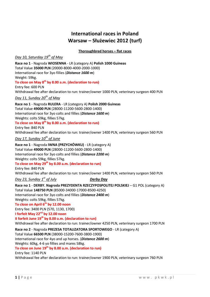 International races in Poland Warsaw – Służewiec 2012 (turf) Thoroughbred horses – flat races th Day 10, Saturday 19 of May Race no 1 - Nagroda WIOSENNA - LR (category A) Polish 1000 Guineas Total Value 35000 PLN (20000-8000-4000-2000-1000) International race for 3yo fillies (Distance 1600 m) Weight: 59kg. To close on May 8th by 8.00 a.m. (declaration to run) Entry fee: 600 PLN Withdrawal fee after declaration to run: trainer/owner 1000 PLN, veterinary surgeon 400 PLN Day 11, Sunday 20th of May Race no 1 - Nagroda RULERA - LR (category A) Polish 2000 Guineas Total Value 49000 PLN (28000-11200-5600-2800-1400) International race for 3yo colts and fillies (Distance 1600 m) Weights: colts 59kg, fillies 57kg. To close on May 8th by 8.00 a.m. (declaration to run) Entry fee: 840 PLN Withdrawal fee after declaration to run: trainer/owner 1400 PLN, veterinary surgeon 560 PLN Day 17, Sunday 10th of June Race no 1 - Nagroda IWNA (PRZYCHÓWKU) - LR (category A) Total Value 49000 PLN (28000-11200-5600-2800-1400) International race for 3yo colts and fillies (Distance 2200 m) Weights: colts 59kg, fillies 57kg. To close on May 29th by 8.00 a.m. (declaration to run) Entry fee: 840 PLN Withdrawal fee after declaration to run: trainer/owner 1400 PLN, veterinary surgeon 560 PLN Day 23, Sunday 1st of July Derby Day Race no 1 - DERBY. Nagroda PREZYDENTA RZECZYPOSPOLITEJ POLSKIEJ – G1 POL (category A) Total Value 148750 PLN (85000-34000-17000-8500-4250) International race for 3yo colts and fillies (Distance 2400 m) Weights: colts 59kg, fillies 57kg. To close on April 6th by 12.00 noon Entry fee: 3400 PLN (570, 1130, 1700) I forfeit May 22nd by 12.00 noon II forfeit June 19th by 8.00 a.m. (declaration to run) Withdrawal fee after declaration to run: trainer/owner 4250 PLN, veterinary surgeon 1700 PLN Race no 2 - Nagroda PREZESA TOTALIZATORA SPORTOWEGO - LR (category A) Total Value 66500 PLN (38000-15200-7600-3800-1900) International race for 4yo and up horses. (Distance 2600 m) Weights: 60kg, 4-6 yo fillies and mares 58kg. To close on June 19th by 8.00 a.m. (declaration to run) Entry fee: 1140 PLN Withdrawal fee after declaration to run: trainer/owner 1900 PLN, veterinary surgeon 760 PLN 1|Page www. pkwk.pl Race no 3 - MEMORIAŁ FRYDERYKA JURJEWICZA - LR (category A) Total Value 31500 PLN (18000-7200-3600-1800-900) International race for 3yo and up horses. (Distance 1600 m) Weights: 3yo 55kg, 4yo and up 60kg, 3-6yo fillies and mares 2kg allowed. To close on June 19th by 8.00 a.m. (declaration to run) Entry fee: 540 PLN Withdrawal fee after declaration to run: trainer/owner 900 PLN, veterinary surgeon 360 PLN Race no 9 – Total Value 10500 PLN (6000-2400-1200-600-300) with 5000 GBP bonus for owner of Racing Post Yearling Bonus Scheme eligible winner International race for 2yo unraced horses (Distance 1000 m) Weights: 56kg, fillies 1kg allowed. To close on June 19th by 8.00 a.m. (declaration to run) Entry fee: 180 PLN Withdrawal fee after declaration to run: trainer/owner 300 PLN, veterinary surgeon 120 PLN Day 25, Sunday 22nd of July Race no 1 - Nagroda SYRENY - LR (category A) Total Value 31500 PLN (18000-7200-3600-1800-900) International race for 3yo and up horses. (Distance 1400 m) Weights: 3yo 56kg, 4yo and up 60kg, 3-6yo fillies and mares 1kg allowed. To close on July 10th by 8.00 a.m. (declaration to run) Entry fee: 540 PLN Withdrawal fee after declaration to run: trainer/owner 900 PLN, veterinary surgeon 360 PLN Race no 6 – Total Value 10500 PLN (6000-2400-1200-600-300) with 5000 GBP bonus for owner of Racing Post Yearling Bonus Scheme eligible winner International race for 2yo maiden horses (Distance 1200 m) Weights: 56kg, fillies 1kg allowed. To close on July 10th by 8.00 a.m. (declaration to run) Entry fee: 180 PLN Withdrawal fee after declaration to run: trainer/owner 300 PLN, veterinary surgeon 120 PLN Day 26, Saturday 28th of July Race no 1 - Nagroda LIRY (Oaks) - LR (category A) Polish Oaks Total Value 49000 PLN (28000-11200-5600-2800-1400) International race for 3yo fillies. (Distance 2400 m) Weight: 59kg. To close on July 17th by 8.00 a.m. (declaration to run) Entry fee: 840 PLN Withdrawal fee after declaration to run: trainer/owner 1400 PLN, veterinary surgeon 560 PLN Day 27, Sunday 29th of July Race no 1 - Nagroda KOZIENIC - LR (category A) Total Value 49000 PLN (28000-11200-5600-2800-1400) International race for 3yo and up horses. (Distance 2000 m) Weights: 3yo 54kg, 4yo and up 60kg, 3-6yo fillies and mares 2kg allowed. To close on July 17th by 8.00 a.m. (declaration to run) Entry fee: 840 PLN Withdrawal fee after declaration to run: trainer/owner 1400 PLN, veterinary surgeon 560 PLN 2|Page www. pkwk.pl Day 32, Saturday 18th of August Race no 1 - Nagroda SK KRASNE - LR (category A) Total Value 35000 PLN (20000-8000-4000-2000-1000) International race for 3yo and up fillies and mares. (Distance 2200 m) Weights: 3yo 55kg, 4yo and up 60kg. To close on August 7th by 8.00 a.m. (declaration to run) Entry fee: 600 PLN Withdrawal fee after declaration to run: trainer/owner 1000 PLN, veterinary surgeon 400 PLN Day 33, Sunday 19th of August Race no 1 - Nagroda ST.LEGER - LR (category A) Polish St.Leger Total Value 66500 PLN (38000-15200-7600-3800-1900) International race for dla 3yo and up colts and fillies. (Distance 2800 m) Weights: 3yo 54kg, 4yo and up 60kg, 3-6yo fillies and mares 2kg allowed. To close on August 7th by 8.00 a.m. (declaration to run) Entry fee: 1140 PLN Withdrawal fee after declaration to run: trainer/owner 1900 PLN, veterinary surgeon 760 PLN Race no 6 – Total Value 10500 PLN (6000-2400-1200-600-300) with 5000 GBP bonus for owner of Racing Post Yearling Bonus Scheme eligible winner International race for 2yo maiden horses (Distance 1300 m) Weights: 57kg, fillies 1kg allowed. To close on August 7th by 8.00 a.m. (declaration to run) Entry fee: 180 PLN Withdrawal fee after declaration to run: trainer/owner 300 PLN, veterinary surgeon 120 PLN Day 37, Sunday 2nd of September 