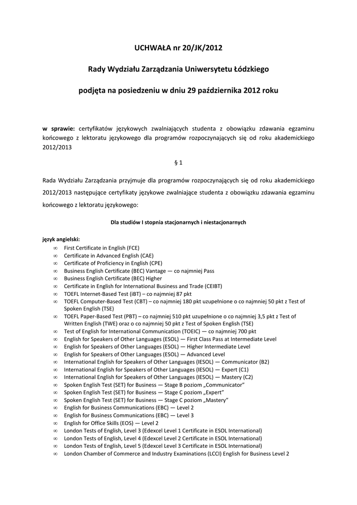UCHWAŁA nr 20/JK/2012 Rady Wydziału Zarządzania Uniwersytetu Łódzkiego podjęta na posiedzeniu w dniu 29 października 2012 roku w sprawie: certyfikatów językowych zwalniających studenta z obowiązku zdawania egzaminu końcowego z lektoratu językowego dla programów rozpoczynających się od roku akademickiego 2012/2013 §1 Rada Wydziału Zarządzania przyjmuje dla programów rozpoczynających się od roku akademickiego 2012/2013 następujące certyfikaty językowe zwalniające studenta z obowiązku zdawania egzaminu końcowego z lektoratu językowego: Dla studiów I stopnia stacjonarnych i niestacjonarnych język angielski: • First Certificate in English (FCE) • Certificate in Advanced English (CAE) • Certificate of Proficiency in English (CPE) • Business English Certificate (BEC) Vantage — co najmniej Pass • Business English Certificate (BEC) Higher • Certificate in English for International Business and Trade (CEIBT) • TOEFL Internet-Based Test (iBT) – co najmniej 87 pkt • TOEFL Computer-Based Test (CBT) – co najmniej 180 pkt uzupełnione o co najmniej 50 pkt z Test of Spoken English (TSE) • TOEFL Paper-Based Test (PBT) – co najmniej 510 pkt uzupełnione o co najmniej 3,5 pkt z Test of Written English (TWE) oraz o co najmniej 50 pkt z Test of Spoken English (TSE) • Test of English for International Communication (TOEIC) — co najmniej 700 pkt • English for Speakers of Other Languages (ESOL) — First Class Pass at Intermediate Level • English for Speakers of Other Languages (ESOL) — Higher Intermediate Level • English for Speakers of Other Languages (ESOL) — Advanced Level • International English for Speakers of Other Languages (IESOL) — Communicator (B2) • International English for Speakers of Other Languages (IESOL) — Expert (C1) • International English for Speakers of Other Languages (IESOL) — Mastery (C2) • Spoken English Test (SET) for Business — Stage B poziom „Communicator” • Spoken English Test (SET) for Business — Stage C poziom „Expert” • Spoken English Test (SET) for Business — Stage C poziom „Mastery” • English for Business Communications (EBC) — Level 2 • English for Business Communications (EBC) — Level 3 • English for Office Skills (EOS) — Level 2 • London Tests of English, Level 3 (Edexcel Level 1 Certificate in ESOL International) • London Tests of English, Level 4 (Edexcel Level 2 Certificate in ESOL International) • London Tests of English, Level 5 (Edexcel Level 3 Certificate in ESOL International) • London Chamber of Commerce and Industry Examinations (LCCI) English for Business Level 2 • • • • • • • • • • • • London Chamber of Commerce and Industry Examinations (LCCI) English for Business Level 3 London Chamber of Commerce and Industry Examinations (LCCI) English for Business Level 4 London Chamber of Commerce and Industry Examinations (LCCI) Foundation Certificate for Teachers of Business English (FTBE) London Chamber of Commerce and Industry Examinations (LCCI) English for Tourism Level 2 — poziom „Pass with Credit”, poziom „Pass with Distinction” International English Language Testing System IELTS — powyżej 6 pkt. TELC B2 Certificate in English — advantage TELC B2 Certificate in English for Business Purposes — advantage TELC Certificate in English for Technical Purposes (B2) TELC English B2 TECL English B2 Business TELC English B2 Technical TELC English C1 język francuski: • Diplôme d’Étude en Langue Française (DELF) (B2) • Diplôme Approfondi de Langue Française (DALF) (C1) • Diplôme Approfondi de Langue Française (DALF) (C2) • Test de Connaissance du Français (TCF) – poziom 4 (B2) • Test de Connaissance du Français (TCF) – poziom 5 (C1) • Test de Connaissance du Français (TCF) – poziom 6 (C2) • Diplôme de Langue Française (DL) (B2) • Diplôme Supérieur Langue et Culture Françaises (DSLCF) • Diplôme Supérieur d’Etudes Françaises Modernes (DS) (C1) • Diplôme de Hautes Études Françaises (DHEF) (C2) • Test de Français International (TFI) — co najmniej 605 pkt • Chambre d commerce et d’industrie de Paris (CCIP) — Diplôme de Français des Affaires 1er degré (DFA 1) (B2) • Chambre d commerce et d’industrie de Paris (CCIP) — Diplôme de Français Professionnel (DFP) Affaires B2 • Chambre d commerce et d’industrie de Paris (CCIP) — Diplôme de Français des Daffaires 2čme degré (DFA 2) (C1) • Chambre d commerce et d’industrie de Paris (CCIP) — Diplôme de Français Professionnel (DFP) Affaires C1 • TELC Certificat Supérieur de Français (B2) • TELC Français B2 język niemiecki: • Test Deutsch als Fremdsprache (TestDaF) • Zertifikat Deutsch für den Beruf (ZDfB) (B2) • Goethe-Zertifikat B2 • Zentrale Mittelstufenprüfung (ZMP) (C1) • Goethe-Zertifikat C1 (Zentrale Mittelstufenprüfung) (ZMP) • Zentrale Oberstufenprüfung (ZOP) (C2) • Goethe-Zertifikat C2 (Zentrale Oberstufenprüfung) (ZOP) • Kleines Deutsches Sprachdiplom (KDS) (C2) • Grosses Deutsches Sprachdiplom (GDS) (C2) • Goethe-Institut, Deutscher Industrie und Handelskammertag (DIHK), Carl Duisberg Centren (CDC) — Prüfung Wirtschaftsdeutsch International (PWD) (C1) • Kultusministerkonferenz (KMK) —Deutsches Sprachdiplom II der Kultusministerkonferenz der Länder — KMK (B2/C1) • Österreich Institut, Prüfungszentren des Österreichischen Sprachdiploms für Deutsch (ÖSD) — Österreichisches Sprachdiplom für Deutsch als Fremdsprache (ÖSD) — B2 Mittelstufe Deutsch, Mittelstufe Deutsch (C1), C1 Oberstufe, Wirtschaftssprache Deutsch (C2) • • • • TELC Zertifikat Deutsch Plus (B2) TELC Zertifikat Deutsch für den Beruf (B2) TELC Deutsch B2 TELC Deutsch C1 język rosyjski: • TELC B2 Dla studiów II stopnia stacjonarnych i niestacjonarnych język angielski: • Certificate in Advanced English (CAE) • Certificate of Proficiency in English (C