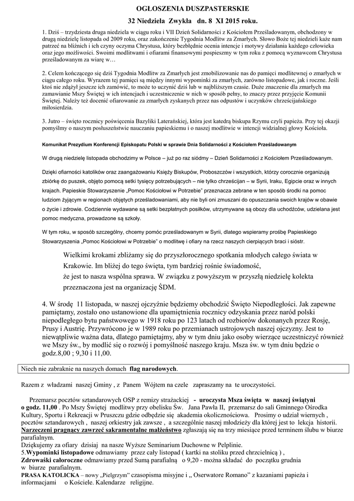 OGŁOSZENIA DUSZPASTERSKIE 32 Niedziela Zwykła dn. 8 XI 2015 roku. 1. Dziś – trzydziesta druga niedziela w ciągu roku i VII Dzień Solidarności z Kościołem Prześladowanym, obchodzony w drugą niedzielę listopada od 2009 roku, oraz zakończenie Tygodnia Modlitw za Zmarłych. Słowo Boże tej niedzieli każe nam patrzeć na bliźnich i ich czyny oczyma Chrystusa, który bezbłędnie ocenia intencje i motywy działania każdego człowieka oraz jego możliwości. Swoimi modlitwami i ofiarami finansowymi pospieszmy w tym roku z pomocą wyznawcom Chrystusa prześladowanym za wiarę w… 2. Celem kończącego się dziś Tygodnia Modlitw za Zmarłych jest zmobilizowanie nas do pamięci modlitewnej o zmarłych w ciągu całego roku. Wyrazem tej pamięci są między innymi wypominki za zmarłych, zarówno listopadowe, jak i roczne. Jeśli ktoś nie zdążył jeszcze ich zamówić, to może to uczynić dziś lub w najbliższym czasie. Duże znaczenie dla zmarłych ma zamawianie Mszy Świętej w ich intencjach i uczestniczenie w nich w sposób pełny, to znaczy przez przyjęcie Komunii Świętej. Należy też docenić ofiarowanie za zmarłych zyskanych przez nas odpustów i uczynków chrześcijańskiego miłosierdzia. 3. Jutro – święto rocznicy poświęcenia Bazyliki Laterańskiej, która jest katedrą biskupa Rzymu czyli papieża. Przy tej okazji pomyślmy o naszym posłuszeństwie nauczaniu papieskiemu i o naszej modlitwie w intencji widzialnej głowy Kościoła. Komunikat Prezydium Konferencji Episkopatu Polski w sprawie Dnia Solidarności z Kościołem Prześladowanym W drugą niedzielę listopada obchodzimy w Polsce – już po raz siódmy – Dzień Solidarności z Kościołem Prześladowanym. Dzięki ofiarności katolików oraz zaangażowaniu Księży Biskupów, Proboszczów i wszystkich, którzy corocznie organizują zbiórkę do puszek, objęto pomocą setki tysięcy potrzebujących – nie tylko chrześcijan – w Syrii, Iraku, Egipcie oraz w innych krajach. Papieskie Stowarzyszenie „Pomoc Kościołowi w Potrzebie” przeznacza zebrane w ten sposób środki na pomoc ludziom żyjącym w regionach objętych prześladowaniami, aby nie byli oni zmuszani do opuszczania swoich krajów w obawie o życie i zdrowie. Codziennie wydawane są setki bezpłatnych posiłków, utrzymywane są obozy dla uchodźców, udzielana jest pomoc medyczna, prowadzone są szkoły. W tym roku, w sposób szczególny, chcemy pomóc prześladowanym w Syrii, dlatego wspieramy prośbę Papieskiego Stowarzyszenia „Pomoc Kościołowi w Potrzebie” o modlitwę i ofiary na rzecz naszych cierpiących braci i sióstr. Wielkimi krokami zbliżamy się do przyszłorocznego spotkania młodych całego świata w Krakowie. Im bliżej do tego święta, tym bardziej rośnie świadomość, że jest to nasza wspólna sprawa. W związku z powyższym w przyszłą niedzielę kolekta przeznaczona jest na organizację ŚDM. 4. W środę 11 listopada, w naszej ojczyźnie będziemy obchodzić Święto Niepodległości. Jak zapewne pamiętamy, zostało ono ustanowione dla upamiętnienia rocznicy odzyskania przez naród polski niepodległego bytu państwowego w 1918 roku po 123 latach od rozbiorów dokonanych przez Rosję, Prusy i Austrię. Przywrócono je w 1989 roku po przemianach ustrojowych naszej ojczyzny. Jest to niewątpliwie ważna data, dlatego pamiętajmy, aby w tym dniu jako osoby wierzące uczestniczyć również we Mszy św., by modlić się o rozwój i pomyślność naszego kraju. Msza św. w tym dniu będzie o godz.8,00 ; 9,30 i 11,00. Niech nie zabraknie na naszych domach flag narodowych. Razem z władzami naszej Gminy , z Panem Wójtem na czele zapraszamy na te uroczystości. Przemarsz pocztów sztandarowych OSP z remizy strażackiej - uroczysta Msza święta w naszej świątyni o godz. 11,00 . Po Mszy Świętej modlitwy przy obelisku Św. Jana Pawła II, przemarsz do sali Gminnego Ośrodka Kultury, Sportu i Rekreacji w Pruszczu gdzie odbędzie się akademia okolicznościowa. Prosimy o udział wiernych , pocztów sztandarowych , naszej orkiestry jak zawsze , a szczególnie naszej młodzieży dla której jest to lekcja historii. Narzeczeni pragnący zawrzeć sakramentalne małżeństwo zgłaszają się na trzy miesiące przed terminem ślubu w biurze parafialnym. Dziękujemy za ofiary dzisiaj na nasze Wyższe Seminarium Duchowne w Pelplinie. 5.Wypominki listopadowe odmawiamy przez cały listopad ( kartki na stoliku przed chrzcielnicą ) , Zdrowaśki całoroczne odmawiamy przed Sumą parafialną o 9,20 - można składać do początku grudnia w biurze parafialnym. PRASA KATOLICKA – nowy „Pielgrzym” czasopisma misyjne i „ Oserwatore Romano” z kazaniami papieża i informacjami o Kościele. Kalendarze religijne.