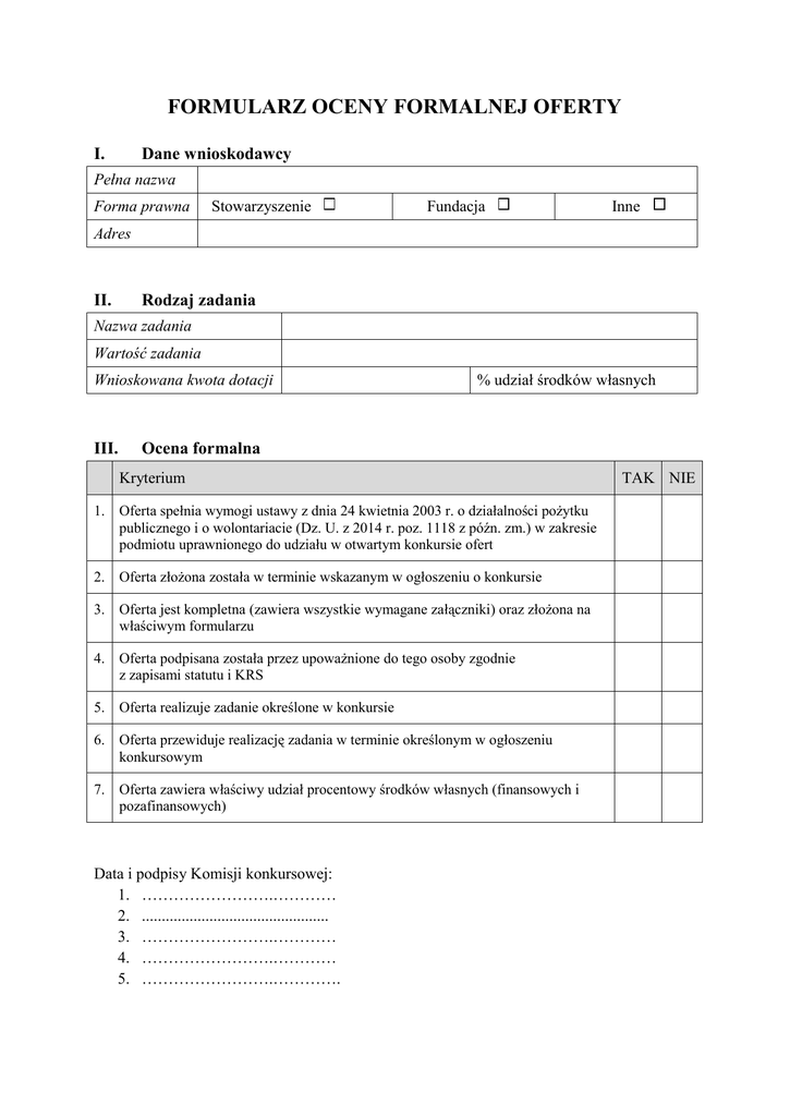 FORMULARZ OCENY FORMALNEJ OFERTY I. Dane wnioskodawcy Pełna nazwa Forma prawna Stowarzyszenie Fundacja Inne Adres II. Rodzaj zadania Nazwa zadania Wartość zadania Wnioskowana kwota dotacji III. % udział środków własnych Ocena formalna Kryterium 1. Oferta spełnia wymogi ustawy z dnia 24 kwietnia 2003 r. o działalności pożytku publicznego i o wolontariacie (Dz. U. z 2014 r. poz. 1118 z późn. zm.) w zakresie podmiotu uprawnionego do udziału w otwartym konkursie ofert 2. Oferta złożona została w terminie wskazanym w ogłoszeniu o konkursie 3. Oferta jest kompletna (zawiera wszystkie wymagane załączniki) oraz złożona na właściwym formularzu 4. Oferta podpisana została przez upoważnione do tego osoby zgodnie z zapisami statutu i KRS 5. Oferta realizuje zadanie określone w konkursie 6. Oferta przewiduje realizację zadania w terminie określonym w ogłoszeniu konkursowym 7. Oferta zawiera właściwy udział procentowy środków własnych (finansowych i pozafinansowych) Data i podpisy Komisji konkursowej: 1. …………………….………… 2. ............................................... 3. …………………….………… 4. …………………….………… 5. …………………….…………. TAK NIE