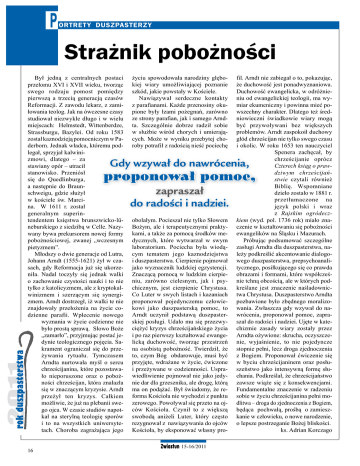 P ORTRETY DUSZPASTERZY Strażnik pobożności Był jedną z centralnych postaci przełomu XVI i XVII wieku, tworząc swego rodzaju pomost pomiędzy pierwszą a trzecią generacją czasów Reformacji. Z zawodu lekarz, z zamiłowania teolog. Jak na ówczesne czasy studiował niezwykle długo i w wielu miejscach: Helmstedt, Wittenberdze, Strassburgu, Bazylei. Od roku 1583 został kaznodzieją pomocniczym w Paderborn. Jednak władca, któremu podlegał, sprzyjał kalwinizmowi, dlatego – za stawiany opór – utracił stanowisko. Przeniósł się do Quedlinburga, a następnie do Braunschweigu, gdzie służył w kościele św. Marcina. W 1611 r. został generalnym superintendentem księstwa brunszwicko-lüneburskiego z siedzibą w Celle. Nazywany bywa prekursorem nowej formy pobożnościowej, zwanej „wczesnym pietyzmem”. Młodszy o dwie generacje od Lutra, Johann Arndt (1555-1621) żył w czasach, gdy Reformacja już się ukorzeniła. Nadal toczyły się jednak walki o zachowanie czystości nauki i to nie tylko z katolicyzmem, ale z kryptokalwinizmem i szerzącym się synergizmem. Arndt dostrzegł, iż walki te nie znajdowały przełożenia na życie codzienne parafii. Wplecenie nowego wyznania w życie codzienne nie było prostą sprawą. Słowo Boże „zamarło”, przyjmując postać jedynie teologicznego pojęcia. Sakrament ograniczał się do przeżywania rytuału. Tymczasem Arndta nurtowała myśl o sercu chrześcijanina, które pozostawało nieporuszone oraz o pobożności chrześcijan, która znalazła się w znaczącym kryzysie. Arndt przeżył ten kryzys. Całkiem możliwie, że już na plebanii swego ojca. W czasie studiów napotkał na sterylną teologię sporów i to na wszystkich uniwersytetach. Choroba zagrażająca jego życiu spowodowała narodziny głębokiej wiary umożliwiającej poznanie szkód, jakie powstały w Kościele. Nawiązywał serdeczne kontakty z parafianami. Każde przenosiny okupione były łzami pożegnań, zarówno ze strony parafian, jak i samego Arndta. Szczególnie dobrze radził sobie w służbie wśród chorych i umierających. Może w wyniku przebytej choroby potrafił z radością nieść pociechę fil. Arndt nie zabiegał o to, pokazując, że duchowość jest ponadwyznaniowa. Duchowość ewangelicka, w odróżnieniu od ewangelickiej teologii, ma wymiar ekumeniczny i powinna mieć powszechny charakter. Dlatego też średniowieczni świadkowie wiary mogą być przywoływani bez większych problemów. Arndt zaspokoił duchowy głód chrześcijan nie tylko swego czasu i okolic. W roku 1653 ten nauczyciel Spenera zachęcał, by chrześcijanie oprócz Czterech ksiąg o prawdziwym chrześcijaństwie czytali również Biblię. Wspomniane dzieło zostało w 1881 r. przetłumaczone na język polski i wraz z Rajskim ogródeczkiem (wyd. pol. 1736 rok) miało znaczenie w kształtowaniu się pobożności ewangelików na Śląsku i Mazurach. Próbując podsumować szczególne zasługi Arndta dla duszpasterstwa, należy podkreślić akcentowanie dialogowego duszpasterstwa, prepsychoanalitycznego, posiłkującego się co prawda obrazami i formami, które współcześnie tchną obcością, ale w których podkreślane jest znaczenie naśladownictwa Chrystusa. Duszpasterstwo Arndta pozbawione było zbędnego moralizowania. Zwłaszcza gdy wzywał do nawrócenia, proponował pomoc, zapraszał do radości i nadziei. Ujęte w katechizmie zasady wiary zostały przez Arndta ożywione: skrucha, oczyszczenie, wyjaśnienie, to nie pojedyncze stopnie pełni, lecz droga zjednoczenia z Bogiem. Proponował ćwiczenie się w byciu chrześcijaninem oraz posłuszeństwo jako intensywną formę słuchania. Podkreślał, że chrześcijaństwo zawsze wiąże się z konsekwencjami. Fundamentalne znaczenie w radzeniu sobie w życiu chrześcijanina pełni modlitwa – droga do zjednoczenia z Bogiem, będąca pochwałą, prośbą o zamieszkanie w człowieku, o nowe narodzenie, o lepsze postrzeganie Bożej bliskości. ks. Adrian Korczago Gdy wzywał do nawrócenia, 2011 rok duszpasterstwa proponował pomoc, 16 zapraszał do radości i nadziei. obolałym. Pocieszał nie tylko Słowem Bożym, ale i terapeutycznymi praktykami, a także za pomocą środków medycznych, które wytwarzał w swym laboratorium. Pociecha była wiodącym tematem jego kaznodziejstwa i duszpasterstwa. Cierpienie pojmował jako wyznacznik ludzkiej egzystencji. Znaczącą pomocą w ludzkim cierpieniu, zarówno cielesnym, jak i psychicznym, jest cierpienie Chrystusa. Co Luter w swych listach i kazaniach proponował pojedynczemu człowiekowi jako duszpasterską pomoc, to Arndt uczynił podstawą duszpasterskiej posługi. Udało mu się przezwyciężyć kryzys chrześcijańskiego życia i po raz pierwszy kształtować ewangelicką duchowość, tworząc przestrzeń na osobistą pobożność. Twierdził, że to, czym Bóg obdarowuje, musi być przyjęte, wdrażane w życie, ćwiczone i przeżywane w codzienności. Usprawiedliwienie pojmował nie jako jedynie dar dla grzesznika, ale drogę, którą ma on podążać. Był świadomy, że reforma Kościoła nie wychodzi z punktu zerowego. Powoływał się przeto na ojców Kościoła. Czynił to z większą swobodą aniżeli Luter, który często rezygnował z nawiązywania do ojców Kościoła, by eksponować własny pro15-16/2011