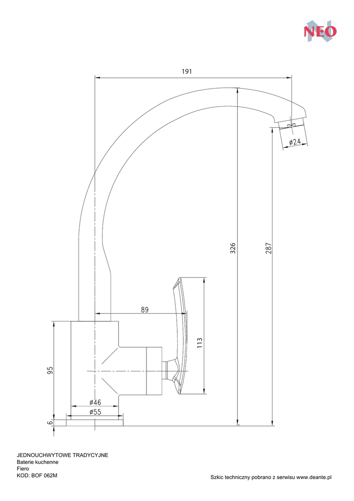 113 326 191 JEDNOUCHWYTOWE TRADYCYJNE Baterie kuchenne Fiero KOD: BOF 062M Szkic techniczny pobrano z serwisu www.deante.pl