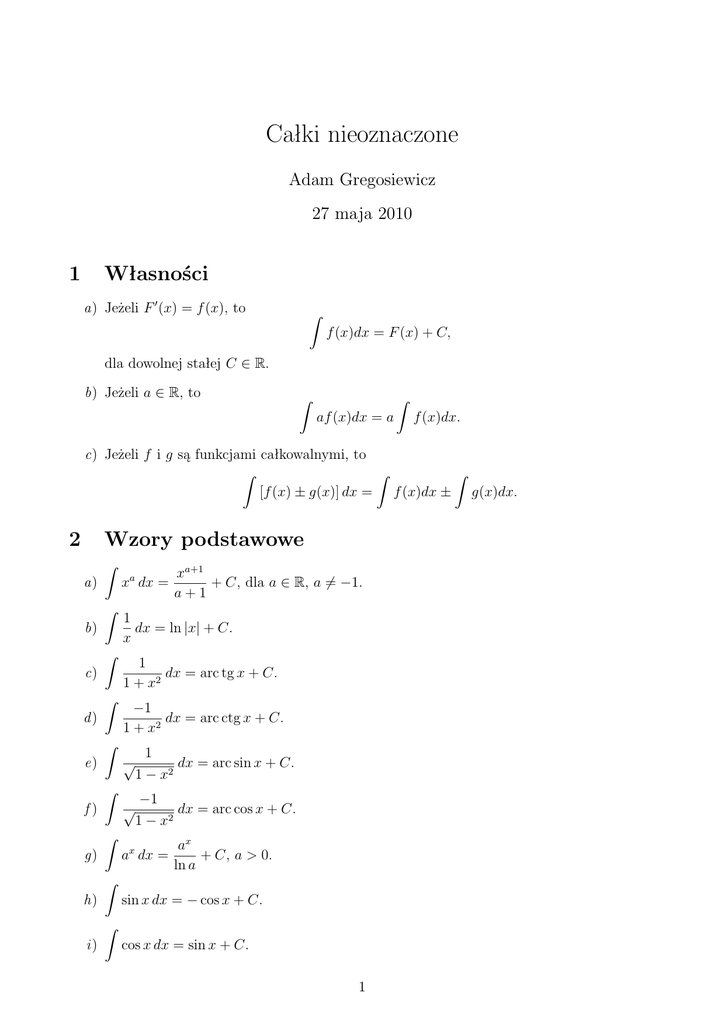 Całki nieoznaczone Adam Gregosiewicz 27 maja 2010 1 Własności a) Jeżeli F 0 (x) = f (x), to Z f (x)dx = F (x) + C, dla dowolnej stałej C ∈ R. b) Jeżeli a ∈ R, to Z Z af (x)dx = a f (x)dx. c) Jeżeli f i g są funkcjami całkowalnymi, to Z Z Z [f (x) ± g(x)] dx = f (x)dx ± g(x)dx. 2 Wzory podstawowe Z a) xa dx = xa+1 + C, dla a ∈ R, a 6= −1. a+1 Z 1 dx = ln |x| + C. x Z 1 dx = arc tg x + C. 1 + x2 Z −1 dx = arc ctg x + C. 1 + x2 b) c) d) Z e) Z f) Z g) √ 1 dx = arc sin x + C. 1 − x2 √ −1 dx = arc cos x + C. 1 − x2 ax dx = ax + C, a > 0. ln a Z sin x dx = − cos x + C. h) Z i) cos x dx = sin x + C. 1 Z 1 dx = tg x + C. cos2 x Z 1 dx = − ctg x + C. sin2 x j) k) Z sinh x dx = cosh x + C. l) Z cosh x dx = sinh x + C. m) Z 1 dx = tgh x + C. cosh2 x Z 1 dx = ctgh x + C. sinh2 x n) o) 3 Całkowanie przez podstawienie Z Jeżeli funkcja ϕ jest różniczkowalna w sposób ciągły, to całkę f (x) dx można przekształcić, podstawiając x = ϕ(t). Wtedy Z Z f (x) dx = f (ϕ(t))ϕ0 (t) dt. Czasami jednak lepiej jest wykonać podstawienie t = ϕ(x). Należy wtedy (o ile to możliwe), korzystając z formalnego równania dt = ϕ0 (x) dx, zapisać f (x) dx jako g(t) dt dla pewnej funkcji g. Wtedy, jeżeli Z g(t) dt = F (t) + C, to Z f (x) dx = F (ϕ(x)) + C. 4 Całkowanie przez części Jeżeli funkcje f i g są różniczkowalne, to zachodzi wzór Z Z 0 f (x)g (x) dx = f (x)g(x) − f 0 (x)g(x) dx. Wybór funkcji f oraz g bywa trudny. Najczęściej jednak za funkcję f należy przyjąć tę, która występuje wcześniej w poniższej liście: a) funkcje logarytmiczne (np. ln x), b) funkcje cyklometryczne (np. arc sin x), c) funkcje algebraiczne (np. x5 ), d ) funkcje trygonometryczne (np. sin x), e) funkcje wykładnicze (np. ex ). 2 5 Całki zawierające trójmian kwadratowy Z 5.1 Całki typu mx + n dx ax2 + bx + c a) m = 0 Zapisując mianownik funkcji podcałkowej w postaci kanonicznej ax2 + bx + c = a(x + k)2 + l, a następnie stosując podstawienie t = 2ax + b, sprowadzamy rachunki do obliczenia całki Z 1 dt lub t2 + A2 Z 1 dt. t2 − A2 b) m 6= 0 Mamy wtedy Z Z m mb (2ax + b) + n − mx + n 2a 2a dx = dx = ax2 + bx + c ax2 + bx + c Z m mb 1 2 = ln |ax + bx + c| + n − . 2 2a 2a ax + bx + c Z 0 f (x) W powyższej równości wykorzystaliśmy wzór dx = ln |f (x)|. Pozostaje teraz do f (x) ostatniej całki zastosować wcześniejszą metodę. Z 5.2 Całki typu √ mx + n dx ax2 + bx + c Podobnie jak w przypadku całek z punktu 5.1 zapisujemy trójmian w postaci kanonicznej i podstawiamy t = ax + b, co sprowadzi całkę do Z 1 √ dt dla a > 0 2 t +A Z 5.3 Całki typu Z lub √ 1 dt dla a < 0. − t2 A2 1 √ dx (mx + n) ax2 + bx + c Stosując podstawienie t= 1 mx + n sprowadzamy całkę do postaci z punktu 5.2. 5.4 Całki typu Z p ax2 + bx + c dx Ponownie przekształcamy trójmian kwadratowy do postaci kanonicznej, a następnie wykonujemy standardowe podstawienie liniowe. Do obliczenia pozostanie całka Z √ Z √ 2 2 A − t dt lub t2 + A dt. 3 6 Całki funkcji wymiernych Niech P oraz Q, Q 6= 0, będą dowolnymi wielomianami. Interesuje nas znalezienie całki P (x) z funkcji wymiernej R(x) = , to znaczy Q(x) Z Z P (x) dx. R(x) dx = Q(x) Jeżeli stopień wielomianu P jest nie mniejszy od stopnia wielomianu Q, to należy najpierw wykonać dzielenie z resztą wielomianu P przez Q. Wtedy P (x) = q(x)Q(x) + r(x), gdzie stopień reszty r jest mniejszy od stopnia Q. Stąd Z Z Z r(x) R(x) dx = q(x) dx + dx. Q(x) Będziemy zatem od tej pory zakładać, że licznik ma mniejszy stopień od mianownika. 6.1 Metoda współczynników nieoznaczonych Wielomian Q można rozłożyć na iloczyn czynników nierozkładalnych, to znaczy Q(x) = (x − a1 )α1 · . . . · (x − an )αn (x2 + b1 x + c1 )β1 · . . . · (x2 + bm x + cm )βm , (1) gdzie żaden z wielomianów x2 + bi x + ci nie ma pierwiastków rzeczywistych. Wtedy istnieją stałe Aji , Bkl , Ckl ∈ R, takie że R(x) = A1α1 A11 A12 P (x) = + . . . + + + ...+ Q(x) x − a1 (x − a1 )2 (x − a1 )α1 Anα1 An1 An2 + + + . . . + + x − an (x − an )2 (x − an )αn Bβ11 x + Cβ11 B11 x + C11 B21 x + C21 + + ... + 2 + ...+ x2 + b1 x + c1 (x2 + b1 x + c1 )2 (x + b1 x + c1 )β1 Bβm1 x + Cβm1 B2m x + C2m B1m x + C1m + + ... + 2 . (2) + 2 x + bm x + cm (x2 + bm x + cm )2 (x + bm x + cm )βm Po wymnożeniu równania (2) obustronnie przez Q(x), nieznane stałe można wyznaczyć na przykład poprzez • I sposób porównanie współczynników przy odpowiednich potęgach x-ów, • II sposób wstawienie do przekształconego równania (2) dowolnych wartości rzeczywistych x, otrzymując układ równań do rozwiązania. Z Mając dany rozkład na ułamki proste, aby znaleźć całkę R(x) dx zauważmy najpierw, że Z Aji 1 Aji dx = · . (x − aj )α 1 − α (x − aj )α−1 4 Pozostaje zatem wyznaczyć całki typu Z Bx + C dx. (x2 + bx + c)n (3) Na początek, przez sprowadzenie trójmianu do postaci kanonicznej oraz odpowiednie podstawienie, przekształcamy całkę (3) do postaci Z Dx + E dx, (x2 + 1)n a następnie rozdzielamy Z Z Z Dx + E x 1 dx = D dx + E dx. 2 n 2 n 2 (x + 1) (x + 1) (x + 1)n Oczywiście, po zastosowaniu podstawienia x2 + 1 = t, otrzymujemy Z Z x 1 1 1 1 1 dx = dt = = . 2 n n n−1 2 (x + 1) 2t 2(1 − n) t 2(1 − n) (x + 1)n−1 Całki Z (x2 (4) 1 dx + 1)n nie wyznaczymy explicite, natomiast podamy formułę redukcyjną, która umożliwi wyznaczania jej wartości dla konkretnego n. Oznaczmy najpierw Z 1 In = dx. 2 (x + 1)n Wtedy Z In = 1 + x2 − x2 dx = (x2 + 1)n Z 1 dx − (x2 + 1)n−1 Z x2 dx = In−1 − (x2 + 1)n Z x x dx. (x2 + 1)n Na mocy wzoru na całkowanie przez części, wykorzystując równość (4), otrzymujemy Z 1 1 x 1 In = In−1 − + dx = 2 n−1 2 2(1 − n) (x + 1) 2(1 − n) (x + 1)n−1 1 x 1 = In−1 − + In−1 = 2 n−1 2(1 − n) (x + 1) 2(1 − n) 1 x 1 = + 1− In−1 . 2(n − 1) (x2 + 1)n−1 2(n − 1) Z 1 Wystarczy zatem znać wartość I1 = dx = arc tg x oraz skorzystać z fo