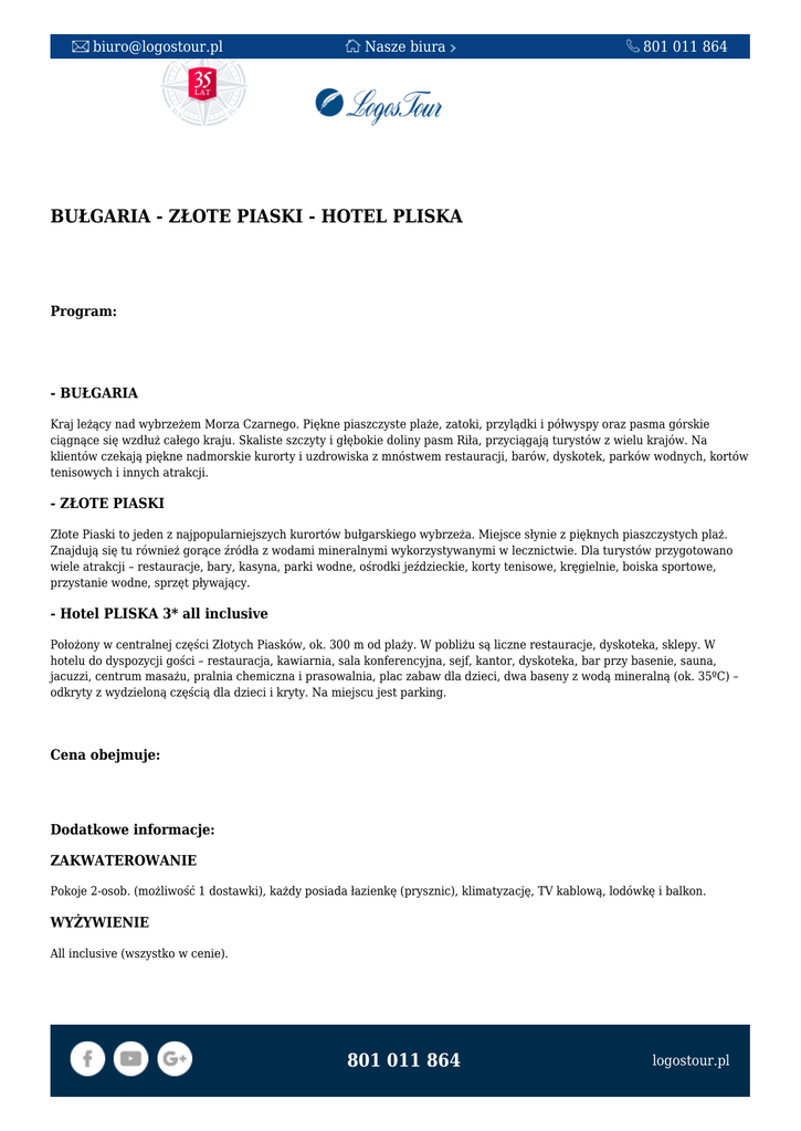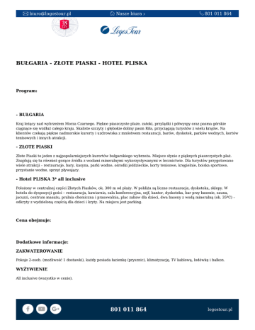 [email protected] Nasze biura 801 011 864 BUŁGARIA - ZŁOTE PIASKI - HOTEL PLISKA Program: - BUŁGARIA Kraj leżący nad wybrzeżem Morza Czarnego. Piękne piaszczyste plaże, zatoki, przylądki i półwyspy oraz pasma górskie ciągnące się wzdłuż całego kraju. Skaliste szczyty i głębokie doliny pasm Riła, przyciągają turystów z wielu krajów. Na klientów czekają piękne nadmorskie kurorty i uzdrowiska z mnóstwem restauracji, barów, dyskotek, parków wodnych, kortów tenisowych i innych atrakcji. - ZŁOTE PIASKI Złote Piaski to jeden z najpopularniejszych kurortów bułgarskiego wybrzeża. Miejsce słynie z pięknych piaszczystych plaż. Znajdują się tu również gorące źródła z wodami mineralnymi wykorzystywanymi w lecznictwie. Dla turystów przygotowano wiele atrakcji – restauracje, bary, kasyna, parki wodne, ośrodki jeździeckie, korty tenisowe, kręgielnie, boiska sportowe, przystanie wodne, sprzęt pływający. - Hotel PLISKA 3* all inclusive Położony w centralnej części Złotych Piasków, ok. 300 m od plaży. W pobliżu są liczne restauracje, dyskoteka, sklepy. W hotelu do dyspozycji gości – restauracja, kawiarnia, sala konferencyjna, sejf, kantor, dyskoteka, bar przy basenie, sauna, jacuzzi, centrum masażu, pralnia chemiczna i prasowalnia, plac zabaw dla dzieci, dwa baseny z wodą mineralną (ok. 35ºC) – odkryty z wydzieloną częścią dla dzieci i kryty. Na miejscu jest parking. Cena obejmuje: Dodatkowe informacje: ZAKWATEROWANIE Pokoje 2-osob. (możliwość 1 dostawki), każdy posiada łazienkę (prysznic), klimatyzację, TV kablową, lodówkę i balkon. WYŻYWIENIE All inclusive (wszystko w cenie). 801 011 864 logostour.pl [email protected] Nasze biura 801 011 864 TERMINY Turnusy tygodniowe, od soboty do soboty, w okresie od czerwca do września. Doba hotelowa od godz. 15:00, do godz. 10:00. CENY W PLN od osoby w pokoju 2-osob. za turnus tygodniowy, zawiera taksę klimatyczną. ZNIŻKI • dziecko do12 lat (na dostawce z 2 os. dor.) – gratis, • dziecko do 12 lat (na łóżku) – 50% zniżki, • osoba powyżej 12 lat (na dostawce) – 20% zniżki. DOPŁATY Do pokoju 1-osob. – 270 PLN. WARUNKI PLATNOŚCI 30% zaliczki przy podpisaniu umowy, dopłata do 100% na 21 dni przed wyjazdem. UBIEZPIECZENIE Obowiązkowe Signal Iduna NW (7000 PLN), KL (15 000 EUR); dodatkowo płatne 25 PLN/osoba. INNE Taksa klimatyczna, parking; korzystanie z leżaków przy basenie. TRANSPORT Dojazd własny. Terminy: 801 011 864 logostour.pl
