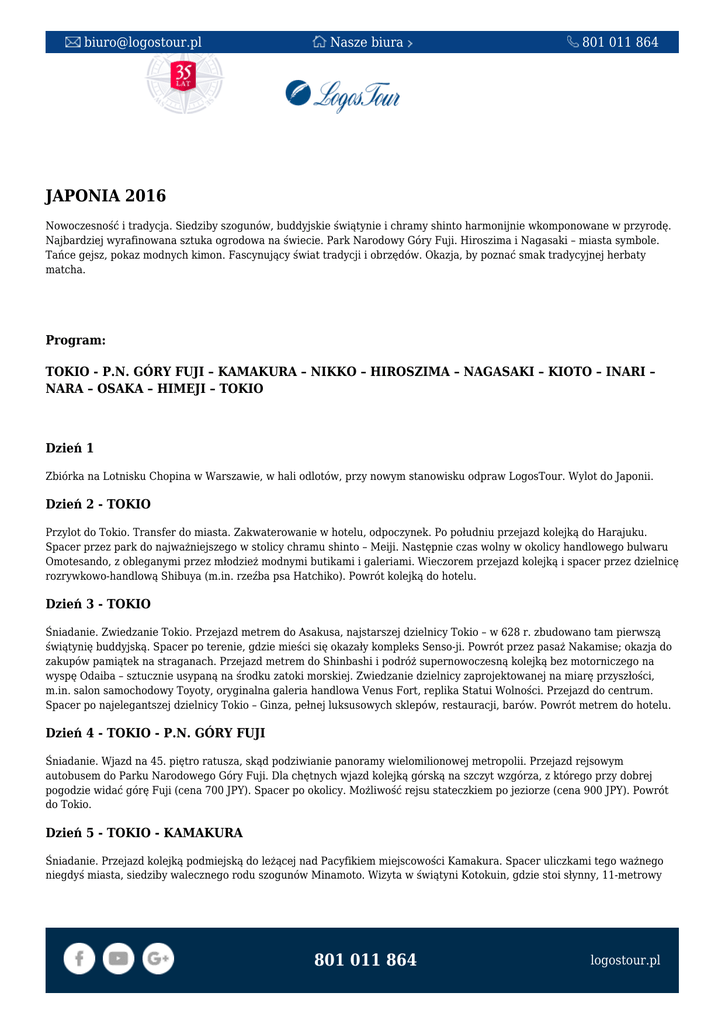 [email protected] Nasze biura 801 011 864 JAPONIA 2016 Nowoczesność i tradycja. Siedziby szogunów, buddyjskie świątynie i chramy shinto harmonijnie wkomponowane w przyrodę. Najbardziej wyrafinowana sztuka ogrodowa na świecie. Park Narodowy Góry Fuji. Hiroszima i Nagasaki – miasta symbole. Tańce gejsz, pokaz modnych kimon. Fascynujący świat tradycji i obrzędów. Okazja, by poznać smak tradycyjnej herbaty matcha. Program: TOKIO - P.N. GÓRY FUJI – KAMAKURA – NIKKO – HIROSZIMA – NAGASAKI – KIOTO – INARI – NARA – OSAKA – HIMEJI – TOKIO Dzień 1 Zbiórka na Lotnisku Chopina w Warszawie, w hali odlotów, przy nowym stanowisku odpraw LogosTour. Wylot do Japonii. Dzień 2 - TOKIO Przylot do Tokio. Transfer do miasta. Zakwaterowanie w hotelu, odpoczynek. Po południu przejazd kolejką do Harajuku. Spacer przez park do najważniejszego w stolicy chramu shinto – Meiji. Następnie czas wolny w okolicy handlowego bulwaru Omotesando, z obleganymi przez młodzież modnymi butikami i galeriami. Wieczorem przejazd kolejką i spacer przez dzielnicę rozrywkowo-handlową Shibuya (m.in. rzeźba psa Hatchiko). Powrót kolejką do hotelu. Dzień 3 - TOKIO Śniadanie. Zwiedzanie Tokio. Przejazd metrem do Asakusa, najstarszej dzielnicy Tokio – w 628 r. zbudowano tam pierwszą świątynię buddyjską. Spacer po terenie, gdzie mieści się okazały kompleks Senso-ji. Powrót przez pasaż Nakamise; okazja do zakupów pamiątek na straganach. Przejazd metrem do Shinbashi i podróż supernowoczesną kolejką bez motorniczego na wyspę Odaiba – sztucznie usypaną na środku zatoki morskiej. Zwiedzanie dzielnicy zaprojektowanej na miarę przyszłości, m.in. salon samochodowy Toyoty, oryginalna galeria handlowa Venus Fort, replika Statui Wolności. Przejazd do centrum. Spacer po najelegantszej dzielnicy Tokio – Ginza, pełnej luksusowych sklepów, restauracji, barów. Powrót metrem do hotelu. Dzień 4 - TOKIO - P.N. GÓRY FUJI Śniadanie. Wjazd na 45. piętro ratusza, skąd podziwianie panoramy wielomilionowej metropolii. Przejazd rejsowym autobusem do Parku Narodowego Góry Fuji. Dla chętnych wjazd kolejką górską na szczyt wzgórza, z którego przy dobrej pogodzie widać górę Fuji (cena 700 JPY). Spacer po okolicy. Możliwość rejsu stateczkiem po jeziorze (cena 900 JPY). Powrót do Tokio. Dzień 5 - TOKIO - KAMAKURA Śniadanie. Przejazd kolejką podmiejską do leżącej nad Pacyfikiem miejscowości Kamakura. Spacer uliczkami tego ważnego niegdyś miasta, siedziby walecznego rodu szogunów Minamoto. Wizyta w świątyni Kotokuin, gdzie stoi słynny, 11-metrowy 801 011 864 logostour.pl [email protected] Nasze biura 801 011 864 posąg Buddy z brązu, do którego można wejść. Spacer do świątyni Hasedera; położony na wzgórzu kompleks robi ogromne wrażenie. Następnie zwiedzanie chramu wyznawców shinto – Tsurugaoka Hachimangu, który znajduje się w malowniczym parku. Powrót kolejką podmiejską do Tokio. Dla chętnych – czas na zakupy elektroniki w dzielnicy Shinjuku. Dzień 6 - TOKIO - NIKKO Śniadanie. Rano przejazd pociągiem do Nikko. Objazd autokarem najważniejszych atrakcji tej zabytkowej miejscowości. W programie – spacer aleją wysadzaną wielowiekowymi cedrami do chramu Toshogu, położonego w lesie mauzoleum jednego z najpotężniejszych władców Japonii, szoguna Tokugawa Ieyasu. Wraz ze świątynią buddyjską Rinnoji i chramem Futarasan – jest to jedyny w swoim rodzaju, z przepychem zdobiony, rozległy kompleks świątynny. Potem wjazd licznymi serpentynami na szczyt góry i krótki postój nad jeziorem Chuzenji. Czas wolny przy malowniczym wodospadzie Kegon. Powrót pociągiem do Tokio. Dzień 7 - TOKIO - HIROSZIMA Przejazd japońskim superexpressem, zwanym shinkansen, do miasta Hiroszima. Przejście do hotelu i zostawienie bagaży. Następnie przejazd pociągiem podmiejskim do Miyajimaguchi. Rejs promem na wysepkę Miyajima, na której znajduje się zbudowany na palach szintoistyczny chram stojący w wodzie – Itsukushima ze słynną czerwoną torii. Czas wolny na wyspie, po której przechadzają się stada jelonków. Powrót pociągiem oraz tramwajem do Hiroszimy. Spacer po Parku Pokoju założonym w pobliżu epicentrum wybuchu bomby atomowej. Zakwaterowanie w hotelu. Dzień 8 - HIROSZIMA - NAGASAKI Śniadanie. Wyjazd pociągiem shinkansen do Nagasaki (wyspa Kiusiu). Po przyjeździe zwiedzanie miasta autokarem. Postój przy katedrze katolickiej, przed którą stoi popiersie papieża Jana Pawła II. Potem spacer po Parku Pokoju. Zwiedzanie nowoczesnego muzeum poświęconego przyczynom i skutkom wybuchu bomby atomowej. Krótka przerwa na zakwaterowanie w hotelu. Przejście do malowniczego Ogrodu Glovera, w którym stoją zabytkowe budynki, zajmowane w przeszłości przez pierwszych cudzoziemców osiedlających się w mieście. Kolacja w orientalnym stylu. Wieczorem spacer do Dzielnicy Chińskiej. Dzień 9 - NAGASAKI - KIOTO Podróż pociągiem shinkansen do Kioto, miasta setek zabytkowych świątyń, chramów i ogrodów. Przejazd do ryokanu – tradycyjnego, drewnianego pensjonatu prowadzonego przez japońską rodzinę (zostawienie bagaży). Następnie spacer do centrum tkactwa, gdzie podczas specjalnego pokazu modelki zaprezentują piękne kimona. Czas wolny w centrum, w którym można kupić atrakcyjne i gustowne pamiątki oraz wyroby japońskiej sztuki ludowej. Następnie spacer po parku otaczającym pałac cesarski. Zakwaterowanie w ryokanie. Wspólna kolacja złożona z wielu przysmaków japońskich. Nocleg na futonach. Dzień 10 - KIOTO Po śniadaniu w ryokanie zwiedzanie autokarem najsłynniejszych zabytków Kioto – olśniewający Złoty Pawilon – Kinkaku-ji, zamek szoguna Tokugawy – Nijo-jo, świątynia Kiyomizu-dera, stojąca na ok. 140 palach. Przerwa na zakwaterowanie w hotelu i odpoczynek. Następnie spacer do nastrojowej dzielnicy gejsz – Gion. Dla chętnych – fakultatywne przedstawienie w teatrze Gion Corner m.i