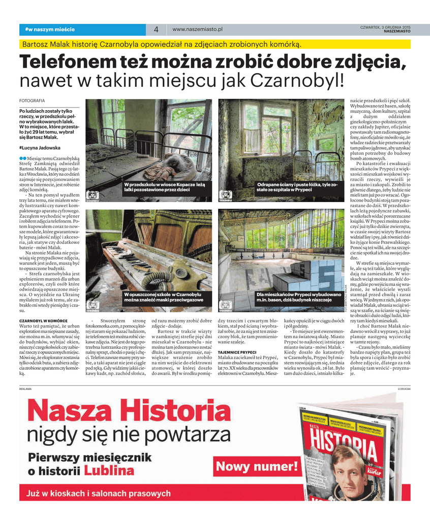 4 #w naszym mieście CZWARTEK, 3 GRUDNIA 2015 NASZEMIASTO www.naszemiasto.pl Bartosz Malak historię Czarnobyla opowiedział na zdjęciach zrobionych komórką. Telefonem też można zrobić dobre zdjęcia, nawet w takim miejscu jak Czarnobyl! FOTOGRAFIA Po ludziach zostały tylko rzeczy, w przedszkolu pełno wybrakowanych lalek. W to miejsce, które przestało żyć 29 lat temu, wybrał się Bartosz Malak. aa Miesiąc temu Czarnobylską Strefę Zamkniętą odwiedził Bartosz Malak. Pasją tego 25-latka z Wrocławia, który na co dzień zajmuje się pozycjonowaniem stron w Internecie, jest robienie zdjęć komórką. - Na ten pomysł wpadłem trzy lata temu, nie miałem wtedy lustrzanki czy nawet kompaktowego aparatu cyfrowego. Zacząłem wychodzić w plener i robiłem zdjęcia telefonem. Potem kupowałem coraz to nowsze modele, które gwarantowały lepszą jakość zdjęć i akcesoria, jak statyw czy dodatkowe baterie - mówi Malak. Na stronie Malaka nie pojawiają się przypadkowe zdjęcia, warunek jest jeden, muszą być to opuszczone budynki. - Strefa czarnobylska jest spełnieniem marzeń dla urban explorerów, czyli osób które odwiedzają opuszczone miejsca. O wyjeździe na Ukrainę myślałem już rok temu, ale zabrakło mi wtedy pieniędzy i czasu. CZARNOBYL W KOMÓRCE Warto też pamiętać, że urban exploration ma niepisane zasady, nie można m.in. włamywać się do budynków, wybijać okien, niszczyć czegokolwiek czy zabierać rzeczy z opuszczonych miejsc. Mówi się, że eksplorator zostawia tylko odcisk buta, a zabiera zdjęcia zrobione aparatem czy komórką. REKLAMA W przedszkolu w wiosce Kopacze leżą lalki pozostawione przez dzieci Odrapane ściany i puste łóżka, tyle zostało ze szpitala w Prypeci W opuszczonej szkole w Czarnobylu można znaleźć maski przeciwgazowe Dla mieszkańców Prypeci wybudowano m.in. basen, dziś budynek niszczeje Stworzyłem stronę fotokomorka.com, z pomocą której staram się pokazać ludziom, że telefonem też można robić ciekawe zdjęcia. Nie jest do tego potrzebna lustrzanka czy profesjonalny sprzęt, chodzi o pasję i chęci. Telefon zawsze mamy przy sobie, a taki aparat nie jest ciągle pod ręką. Gdy widzimy jakiś ciekawy kadr, np. zachód słońca, od razu możemy zrobić dobre zdjęcie - dodaje. Bartosz w trakcie wizyty w zamkniętej strefie pięć dni mieszkał w Czarnobylu - nie można tam jednorazowo zostać dłużej. Jak sam przyznaje, największe wrażenie zrobiło na nim wejście do elektrowni atomowej, w której doszło do awarii. Był w środku pomię- dzy trzecim i czwartym blokiem, stał pod ścianą i wyobrażał sobie, że za nią jest ten zniszczony blok, że tam promieniowanie szaleje. TAJEMNICE PRYPECI Malaka zaciekawił też Prypeć, miasto zbudowane na początku lat 70. XX wieku dla pracowników elektrowni w Czarnobylu. Miesz- kańcy opuścili je w ciągu dwóch i pół godziny. - To miejsce jest ewenementem na światową skalę. Miasto Prypeć to najkrócej istniejące miasto świata - mówi Malak. Kiedy doszło do katastrofy w Czarnobylu, Prypeć był miastem rozwijającym się, średnia wieku wynosiła ok. 26 lat. Było tam dużo dzieci, istniało kilka- FOT.BARTIOSZ MALAK #Lucyna Jadowska naście przedszkoli i pięć szkół. Wybudowano też basen, szkołę muzyczną, dom kultury, szpital z dużym oddziałem ginekologiczno-położniczym czy zakłady Jupiter, oficjalnie powstawały tam radiomagnetofony, nieoficjalnie mówiło się, że władze radzieckie przetwarzały tam paliwo jądrowe, aby uzyskać pluton potrzebny do budowy bomb atomowych. Po katastrofie i ewakuacji mieszkańców Prypeci z większości mieszkań wojskowi wyrzucili rzeczy, wywieźli je za miasto i zakopali. Zrobili to głównie dlatego, żeby ludzie nie mieli tam już po co wracać. Ogołocone budynki stoją tam pozarastane do dziś. W przedszkolach leżą pojedyncze zabawki, w szkołach widać porozrzucane książki. W Prypeci można zobaczyć już tylko dzikie zwierzęta, w czasie swojej wizyty Bartosz widział lisy i psy, jak również dziko żyjące konie Przewalskiego. Ponoć są też wilki, ale na szczęście nie spotkał ich na swojej drodze. W strefie są miejsca wymarłe, ale są też takie, które wyglądają na zamieszkałe. W wioskach wciąż można znaleźć domy, gdzie po wejściu ma się wrażenie, że właściciele wyszli stamtąd przed chwilą i zaraz wrócą. W jednym z nich, jak opowiadał Malak, ubrania wciąż wiszą w szafie, na ścianie są święte obrazki i dużo zdjęć ludzi, którzy tam kiedyś mieszkali. I choć Bartosz Malak niedawno wrócił z wyprawy, to już planuje następną wycieczkę w tamte rejony. - Czasu było mało, mieliśmy bardzo napięty plan, grupa też była spora i ciężko było zrobić dobre zdjęcie, dlatego za rok planuję tam wrócić - przyznaje. 115914344