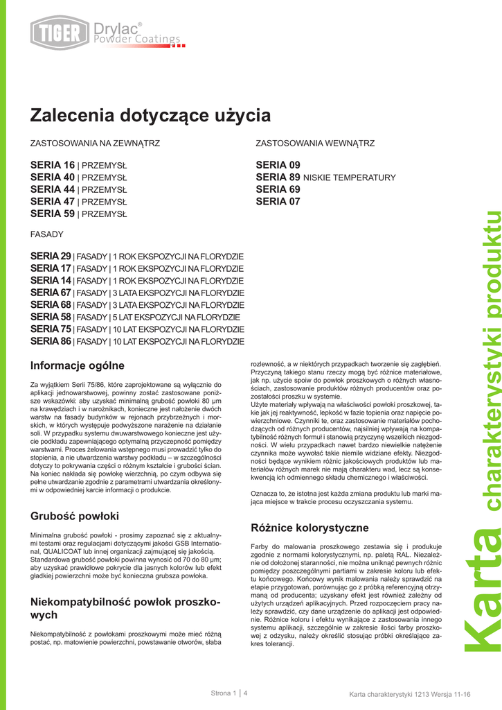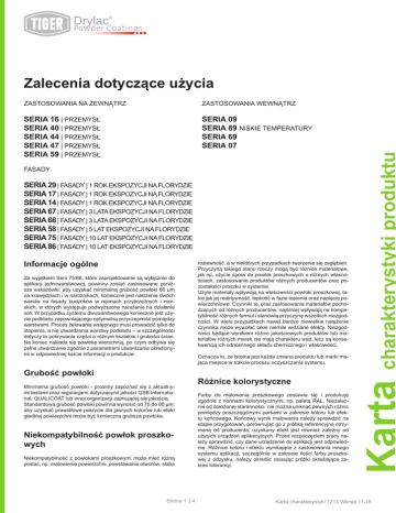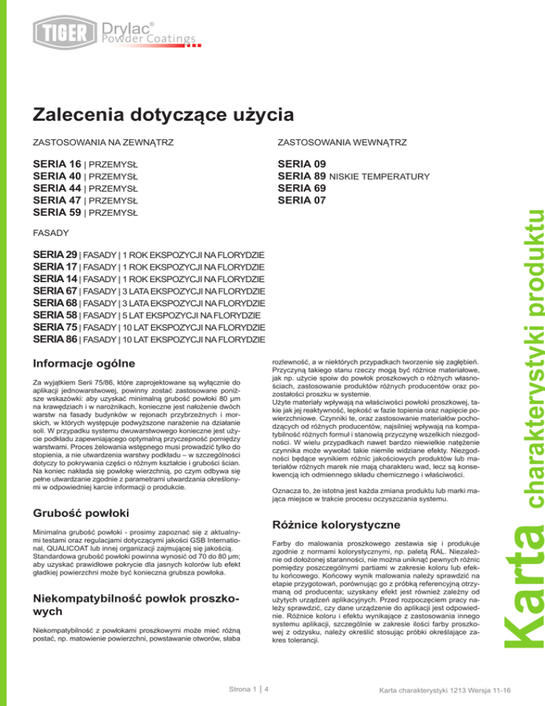 ZASTOSOWANIA NA ZEWNĄTRZ ZASTOSOWANIA WEWNĄTRZ SERIA 16 | PRZEMYSŁ SERIA 40 | PRZEMYSŁ SERIA 44 | PRZEMYSŁ SERIA 47 | PRZEMYSŁ SERIA 59 | PRZEMYSŁ SERIA 09 SERIA 89 NISKIE TEMPERATURY SERIA 69 SERIA 07 FASADY SERIA 29 | FASADY | 1 ROK EKSPOZYCJI NA FLORYDZIE SERIA 17 | FASADY | 1 ROK EKSPOZYCJI NA FLORYDZIE SERIA 14 | FASADY | 1 ROK EKSPOZYCJI NA FLORYDZIE SERIA 67 | FASADY | 3 LATA EKSPOZYCJI NA FLORYDZIE SERIA 68 | FASADY | 3 LATA EKSPOZYCJI NA FLORYDZIE SERIA 58 | FASADY | 5 LAT EKSPOZYCJI NA FLORYDZIE SERIA 75 | FASADY | 10 LAT EKSPOZYCJI NA FLORYDZIE SERIA 86 | FASADY | 10 LAT EKSPOZYCJI NA FLORYDZIE Informacje ogólne rozlewność, a w niektórych przypadkach tworzenie się zagłębień. Przyczyną takiego stanu rzeczy mogą być różnice materiałowe, jak np. użycie spoiw do powłok proszkowych o różnych własnościach, zastosowanie produktów różnych producentów oraz pozostałości proszku w systemie. Użyte materiały wpływają na właściwości powłoki proszkowej, takie jak jej reaktywność, lepkość w fazie topienia oraz napięcie powierzchniowe. Czynniki te, oraz zastosowanie materiałów pochodzących od różnych producentów, najsilniej wpływają na kompatybilność różnych formuł i stanowią przyczynę wszelkich niezgodności. W wielu przypadkach nawet bardzo niewielkie natężenie czynnika może wywołać takie niemile widziane efekty. Niezgodności będące wynikiem różnic jakościowych produktów lub materiałów różnych marek nie mają charakteru wad, lecz są konsekwencją ich odmiennego składu chemicznego i właściwości. Za wyjątkiem Serii 75/86, które zaprojektowane są wyłącznie do aplikacji jednowarstwowej, powinny zostać zastosowane poniższe wskazówki: aby uzyskać minimalną grubość powłoki 80 µm na krawędziach i w narożnikach, konieczne jest nałożenie dwóch warstw na fasady budynków w rejonach przybrzeżnych i morskich, w których występuje podwyższone narażenie na działanie soli. W przypadku systemu dwuwarstwowego konieczne jest użycie podkładu zapewniającego optymalną przyczepność pomiędzy warstwami. Proces żelowania wstępnego musi prowadzić tylko do stopienia, a nie utwardzenia warstwy podkładu – w szczególności dotyczy to pokrywania części o różnym kształcie i grubości ścian. Na koniec nakłada się powłokę wierzchnią, po czym odbywa się pełne utwardzanie zgodnie z parametrami utwardzania określonymi w odpowiedniej karcie informacji o produkcie. Oznacza to, że istotna jest każda zmiana produktu lub marki mająca miejsce w trakcie procesu oczyszczania systemu. Grubość powłoki Różnice kolorystyczne Minimalna grubość powłoki - prosimy zapoznać się z aktualnymi testami oraz regulacjami dotyczącymi jakości GSB International, QUALICOAT lub innej organizacji zajmującej się jakością. Standardowa grubość powłoki powinna wynosić od 70 do 80 µm; aby uzyskać prawidłowe pokrycie dla jasnych kolorów lub efekt gładkiej powierzchni może być konieczna grubsza powłoka. Farby do malowania proszkowego zestawia się i produkuje zgodnie z normami kolorystycznymi, np. paletą RAL. Niezależnie od dołożonej staranności, nie można uniknąć pewnych różnic pomiędzy poszczególnymi partiami w zakresie koloru lub efektu końcowego. Końcowy wynik malowania należy sprawdzić na etapie przygotowań, porównując go z próbką referencyjną otrzymaną od producenta; uzyskany efekt jest również zależny od użytych urządzeń aplikacyjnych. Przed rozpoczęciem pracy należy sprawdzić, czy dane urządzenie do aplikacji jest odpowiednie. Różnice koloru i efektu wynikające z zastosowania innego systemu aplikacji, szczególnie w zakresie ilości farby proszkowej z odzysku, należy określić stosując próbki określające zakres tolerancji. Niekompatybilność powłok proszkowych Niekompatybilność z powłokami proszkowymi może mieć różną postać, np. matowienie powierzchni, powstawanie otworów, słaba Strona 1 |4 Karta charakterystyki produktu Zalecenia dotyczące użycia Karta charakterystyki 1213 Wersja 11-16 W przypadku zginania już pomalowanych elementów należy przeprowadzić test przydatności na oryginalnych częściach przed rozpoczęciem produkcji seryjnej, gdyż na parametry gięcia mają wpływ czynniki takie, jak sposób działania zaginarki, rodzaj stopu, obróbka wstępna, promień zgięcia, warunki gięcia (środowiskowe), temperatura, grubość ścianek i powłoki, warunki utwardzania, kolor, czas przechowywania i inne. Mikroskopijne pęknięcia powłoki proszkowej mogą prowadzić do uszkodzeń w wyniku korozji. Nakładanie kolejnych warstw i/lub odświeżanie dokonywane w ramach zastosowań architektonicznych nie pozostaje w zgodności z wytycznymi jakościowymi publikowanymi przez GSB i QUALICOAT. Jeżeli jednak działania takie są przeprowadzane, wówczas należy zwrócić uwagę na odpowiednie przyleganie do podłoża, nieprawidłowości powłok oraz na składniki strukturalne i właściwości materiału. Przed ponownym malowaniem konieczne jest oszlifowanie powierzchni i oczyszczenie jej w celu usunięcia pyłu szlifierskiego. Podczas nakładania nowej warstwy należy postępować zgodnie z zaleceniami zawartymi w odpowiedniej karcie charakterystyki produktu. Trwałość – powłoka jednowarstwowa a dwuwarstwowa W przypadku zastosowań architektonicznych produkty oznaczone jako farby z efektem metalicznym do malowania dwuwarstwowego należy pokryć warstwą lakieru bezbarwnego przeznaczonego do tego rodzaju zastosowań. Wszystkie prace związane z odświeżaniem muszą być wykonywane przez firmę specjalistyczną w celu przywrócenia funkcjonalności powłoki i ogólnego efektu wizualnego w stopniu możliwie zgodnym ze stanem oryginalnym. W każdym przypadku należy najpierw przetestować system odświeżający na niewidocznym obszarze – tylko w ten sposób można zapewnić optymalne dopasowanie koloru i funkcjonalność oraz sprawdze