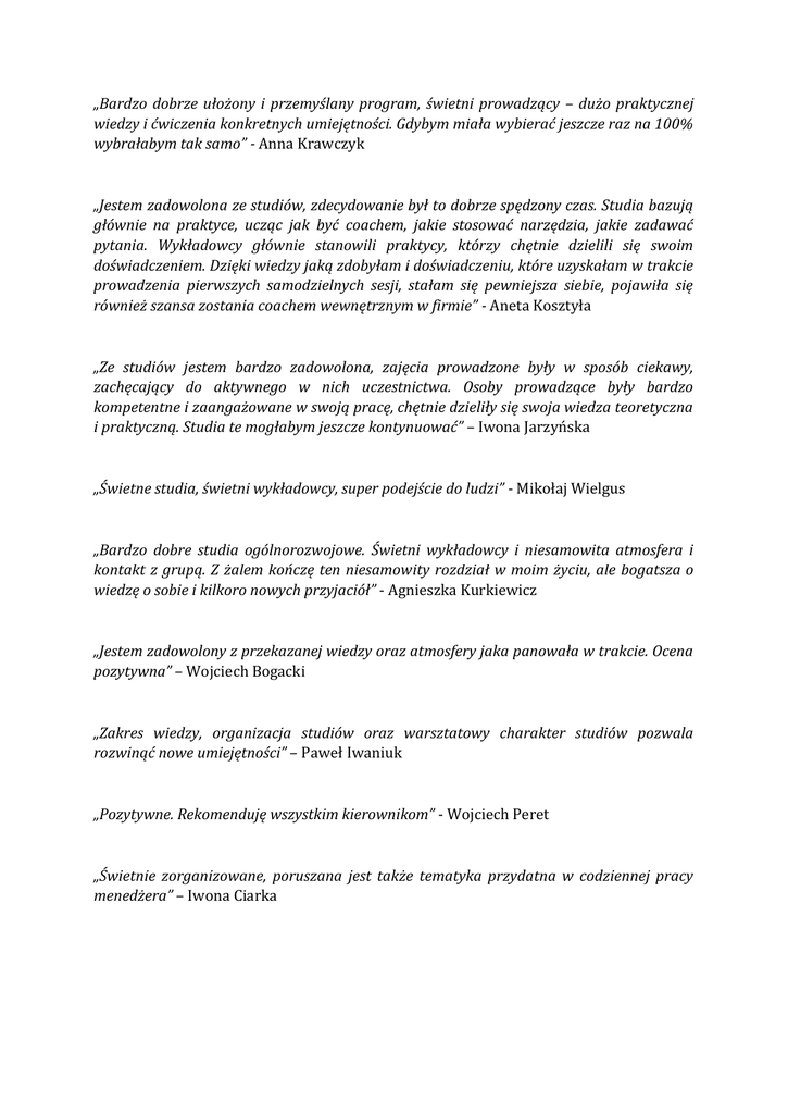 „Bardzo dobrze ułożony i przemyślany program, świetni prowadzący – dużo praktycznej wiedzy i ćwiczenia konkretnych umiejętności. Gdybym miała wybierać jeszcze raz na 100% wybrałabym tak samo” - Anna Krawczyk „Jestem zadowolona ze studiów, zdecydowanie był to dobrze spędzony czas. Studia bazują głównie na praktyce, ucząc jak być coachem, jakie stosować narzędzia, jakie zadawać pytania. Wykładowcy głównie stanowili praktycy, którzy chętnie dzielili się swoim doświadczeniem. Dzięki wiedzy jaką zdobyłam i doświadczeniu, które uzyskałam w trakcie prowadzenia pierwszych samodzielnych sesji, stałam się pewniejsza siebie, pojawiła się również szansa zostania coachem wewnętrznym w firmie” - Aneta Kosztyła „Ze studiów jestem bardzo zadowolona, zajęcia prowadzone były w sposób ciekawy, zachęcający do aktywnego w nich uczestnictwa. Osoby prowadzące były bardzo kompetentne i zaangażowane w swoją pracę, chętnie dzieliły się swoja wiedza teoretyczna i praktyczną. Studia te mogłabym jeszcze kontynuować” – Iwona Jarzyńska „Świetne studia, świetni wykładowcy, super podejście do ludzi” - Mikołaj Wielgus „Bardzo dobre studia ogólnorozwojowe. Świetni wykładowcy i niesamowita atmosfera i kontakt z grupą. Z żalem kończę ten niesamowity rozdział w moim życiu, ale bogatsza o wiedzę o sobie i kilkoro nowych przyjaciół” - Agnieszka Kurkiewicz „Jestem zadowolony z przekazanej wiedzy oraz atmosfery jaka panowała w trakcie. Ocena pozytywna” – Wojciech Bogacki „Zakres wiedzy, organizacja studiów oraz warsztatowy charakter studiów pozwala rozwinąć nowe umiejętności” – Paweł Iwaniuk „Pozytywne. Rekomenduję wszystkim kierownikom” - Wojciech Peret „Świetnie zorganizowane, poruszana jest także tematyka przydatna w codziennej pracy menedżera” – Iwona Ciarka