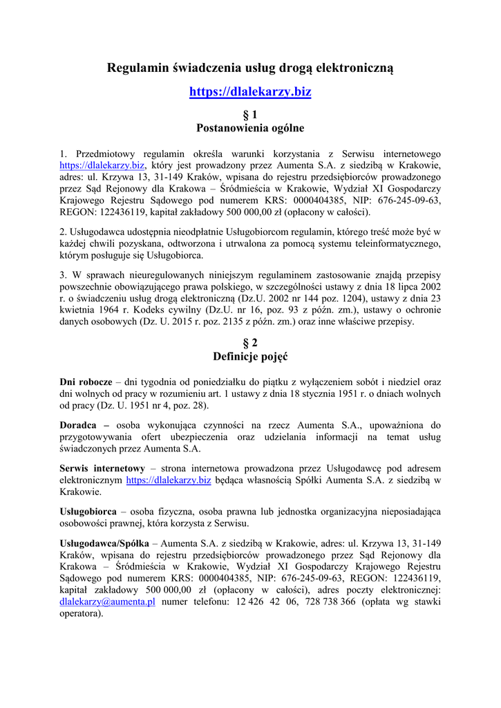 Regulamin świadczenia usług drogą elektroniczną https://dlalekarzy.biz §1 Postanowienia ogólne 1. Przedmiotowy regulamin określa warunki korzystania z Serwisu internetowego https://dlalekarzy.biz, który jest prowadzony przez Aumenta S.A. z siedzibą w Krakowie, adres: ul. Krzywa 13, 31-149 Kraków, wpisana do rejestru przedsiębiorców prowadzonego przez Sąd Rejonowy dla Krakowa – Śródmieścia w Krakowie, Wydział XI Gospodarczy Krajowego Rejestru Sądowego pod numerem KRS: 0000404385, NIP: 676-245-09-63, REGON: 122436119, kapitał zakładowy 500 000,00 zł (opłacony w całości). 2. Usługodawca udostępnia nieodpłatnie Usługobiorcom regulamin, którego treść może być w każdej chwili pozyskana, odtworzona i utrwalona za pomocą systemu teleinformatycznego, którym posługuje się Usługobiorca. 3. W sprawach nieuregulowanych niniejszym regulaminem zastosowanie znajdą przepisy powszechnie obowiązującego prawa polskiego, w szczególności ustawy z dnia 18 lipca 2002 r. o świadczeniu usług drogą elektroniczną (Dz.U. 2002 nr 144 poz. 1204), ustawy z dnia 23 kwietnia 1964 r. Kodeks cywilny (Dz.U. nr 16, poz. 93 z późn. zm.), ustawy o ochronie danych osobowych (Dz. U. 2015 r. poz. 2135 z późn. zm.) oraz inne właściwe przepisy. §2 Definicje pojęć Dni robocze – dni tygodnia od poniedziałku do piątku z wyłączeniem sobót i niedziel oraz dni wolnych od pracy w rozumieniu art. 1 ustawy z dnia 18 stycznia 1951 r. o dniach wolnych od pracy (Dz. U. 1951 nr 4, poz. 28). Doradca – osoba wykonująca czynności na rzecz Aumenta S.A., upoważniona do przygotowywania ofert ubezpieczenia oraz udzielania informacji na temat usług świadczonych przez Aumenta S.A. Serwis internetowy – strona internetowa prowadzona przez Usługodawcę pod adresem elektronicznym https://dlalekarzy.biz będąca własnością Spółki Aumenta S.A. z siedzibą w Krakowie. Usługobiorca – osoba fizyczna, osoba prawna lub jednostka organizacyjna nieposiadająca osobowości prawnej, która korzysta z Serwisu. Usługodawca/Spółka – Aumenta S.A. z siedzibą w Krakowie, adres: ul. Krzywa 13, 31-149 Kraków, wpisana do rejestru przedsiębiorców prowadzonego przez Sąd Rejonowy dla Krakowa – Śródmieścia w Krakowie, Wydział XI Gospodarczy Krajowego Rejestru Sądowego pod numerem KRS: 0000404385, NIP: 676-245-09-63, REGON: 122436119, kapitał zakładowy 500 000,00 zł (opłacony w całości), adres poczty elektronicznej: [email protected] numer telefonu: 12 426 42 06, 728 738 366 (opłata wg stawki operatora). §3 Warunki świadczenia usług drogą elektroniczną 1. Warunkiem koniecznym dla skorzystania z usług świadczonych drogą elektroniczną jest posiadanie przez Usługobiorcę: komputera stacjonarnego, laptopa lub innego urządzenia multimedialnego z dostępem do Internetu, aktywnego konta poczty elektronicznej (e-mail), systemu operacyjnego Microsoft Windows XP, 7, 8, 10, Vista, Linux, OsX, Android, przeglądarki internetowej Internet Explorer, Mozilla FireFox, Google Chrome, Opera, minimalne ustawienia rozdzielczości ekranu: 1024 x 768 pikseli lub wyższa. 2. W przypadku korespondencji otrzymywanej za pośrednictwem poczty elektronicznej niezbędne jest posiadanie aktywnego konta poczty e-mail, natomiast w przypadku załączników dostarczanych wraz z pocztą, programu obsługującego pliki danego typu w szczególności: pdf, doc, docx, jpg. 3. Usługobiorca jest zobowiązany korzystać z zasobów niniejszego Serwisu, zgodnie z jego przeznaczeniem i powinien powstrzymywać się od dostarczania treści o charakterze bezprawnym. 4. Z uwagi na fakt, iż korzystanie z usług świadczonych drogą elektroniczną wiąże się ze szczególnym zagrożeniem, jakie występuje przy korzystaniu z sieci Internet, Usługobiorca winien stosować odpowiednie oprogramowanie mające na celu stworzenie odpowiednich zabezpieczeń, w szczególności używać aktualizowanych na bieżąco programów antywirusowych, oraz zapór sieciowych – firewall. §4 Pliki Cookies Usługodawca wykorzystuje do świadczenia usług drogą elektroniczną mechanizm plików Cookies. Stosowane pliki Cookies są bezpieczne dla urządzenia Usługobiorcy. Serwis stosuje dwa rodzaje plików Cookies: sesyjne oraz stałe. Cookies sesyjne są plikami tymczasowymi, które przechowywane są w urządzeniu końcowym użytkownika do czasu opuszczenia strony Serwisu. Stałe pliki Cookies przechowywane są w urządzeniu końcowym użytkownika przez czas określony w parametrach plików Cookies lub do czasu ich usunięcia przez użytkownika. Usługobiorca ma możliwość ograniczenia lub wyłączenia dostępu plików Cookies do swojego urządzenia. W przypadku skorzystania z tej opcji korzystanie ze strony Serwisu będzie możliwe, poza funkcjami, które ze swojej natury wymagają działania plików Cookies. Szczegółowe informacje na temat możliwości i sposobów obsługi plików Cookies dostępne są w ustawieniach przeglądarki internetowej, z której korzysta Usługobiorca. §5 Usługa świadczona drogą elektroniczną „Zakup polisy” 1. Usługa „Zakup polisy” dostępna jest dla wszystkich Usługobiorców, którzy są zainteresowani zakupem polisy. Aby skorzystać z powyższej usługi, należy podać następujące dane: imię, nazwisko, numer telefonu, adres e-mail, numer i organ wydający dokument uprawniający do wykonywania zawodu, data, od kiedy ma obowiązywać ubezpieczenie, specjalizacja – należy zaznaczyć specjalizację, która nas dotyczy, dodatkowo można wybrać ubezpieczenie uzupełniające, dostępne opcje: dobrowolne ubezpieczenie OC lekarza, ochrona HIV/WZW, NNW, ubezpieczenie podróżne, ubezpieczenie od utraty dochodu, kliknąć na ikonę „Wyślij”. 2. Usługodawca przesyła drogą mailową w terminie 2 dni roboczych dwie propozycje zakupu polisy do wyboru, przygotowane przez Doradcę. §6 Reklamacje w zakresie świadczenia usług drogą elektroniczną 1. Reklamacje w zakresie usług świadc
