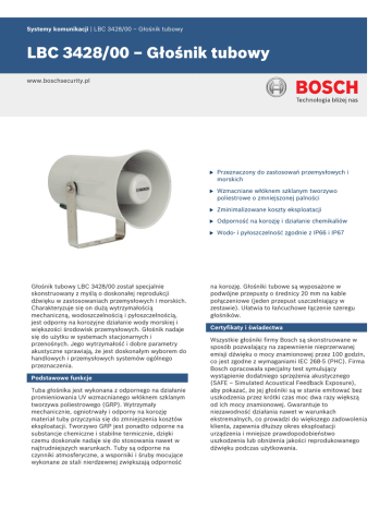 Systemy komunikacji | LBC 3428/00 – Głośnik tubowy LBC 3428/00 – Głośnik tubowy www.boschsecurity.pl Głośnik tubowy LBC 3428/00 został specjalnie skonstruowany z myślą o doskonałej reprodukcji dźwięku w zastosowaniach przemysłowych i morskich. Charakteryzuje się on dużą wytrzymałością mechaniczną, wodoszczelnością i pyłoszczelnością, jest odporny na korozyjne działanie wody morskiej i większości środowisk przemysłowych. Głośnik nadaje się do użytku w systemach stacjonarnych i przenośnych. Jego wytrzymałość i dobre parametry akustyczne sprawiają, że jest doskonałym wyborem do handlowych i przemysłowych systemów ogólnego przeznaczenia. Podstawowe funkcje Tuba głośnika jest wykonana z odpornego na działanie promieniowania UV wzmacnianego włóknem szklanym tworzywa poliestrowego (GRP). Wytrzymały mechanicznie, ogniotrwały i odporny na korozję materiał tuby przyczynia się do zmniejszenia kosztów eksploatacji. Tworzywo GRP jest ponadto odporne na substancje chemiczne i stabilne termicznie, dzięki czemu doskonale nadaje się do stosowania nawet w najtrudniejszych warunkach. Tuby są odporne na czynniki atmosferyczne, a wsporniki i śruby mocujące wykonane ze stali nierdzewnej zwiększają odporność u Przeznaczony do zastosowań przemysłowych i morskich u Wzmacniane włóknem szklanym tworzywo poliestrowe o zmniejszonej palności u Zminimalizowane koszty eksploatacji u Odporność na korozję i działanie chemikaliów u Wodo- i pyłoszczelność zgodnie z IP66 i IP67 na korozję. Głośniki tubowe są wyposażone w podwójne przepusty o średnicy 20 mm na kable połączeniowe (jeden przepust uszczelniający w zestawie). Ułatwia to łańcuchowe łączenie szeregu głośników. Certyfikaty i świadectwa Wszystkie głośniki firmy Bosch są skonstruowane w sposób pozwalający na zapewnienie nieprzerwanej emisji dźwięku o mocy znamionowej przez 100 godzin, co jest zgodne z wymaganiami IEC 268‑5 (PHC). Firma Bosch opracowała specjalny test symulujący wystąpienie dodatniego sprzężenia akustycznego (SAFE – Simulated Acoustical Feedback Exposure), aby pokazać, że jej głośniki są w stanie emitować bez uszkodzenia przez krótki czas moc dwa razy większą od ich mocy znamionowej. Gwarantuje to niezawodność działania nawet w warunkach ekstremalnych, co prowadzi do większego zadowolenia klienta, zapewnia dłuższy okres eksploatacji urządzenia i mniejsze prawdopodobieństwo uszkodzenia lub obniżenia jakości reprodukowanego dźwięku podczas użytkowania. 2 | LBC 3428/00 – Głośnik tubowy Standardy bezpieczeństwa Zgodnie z EN 60065 Odporność na wodę i kurz Zgodnie z IEC 60529, IP 66 oraz IP 67 Region Certyfikacja Europa CE Planowanie Głośnik tubowy zawiera transformator z odczepami na uzwojeniu pierwotnym, co umożliwia wybór mocy wyjściowej. Głośnik tubowy jest dostarczany wraz z wytrzymałym wspornikiem montażowym umożliwiającym precyzyjne kierowanie wiązki emitowanego dźwięku. Wspornik posiada zapadki, co zapewnia jego utrzymywanie w niezmiennej pozycji. Pasmo przenoszenia Wymiary w mm Charakterystyka kierunkowości (pomiar szumem różowym) Odczepy transformatora 125 Hz 250 Hz 500 Hz 1k Hz 2k Hz 4k Hz 8k Hz SPL 1,1 - 79 96 10 2 10 5 98 87 Moc SPL maks. - 91 108 11 4 11 7 11 0 99 Dobroć Q - 1,5 1,9 3,2 6,8 15, 8 51, 3 Skutecz ność - 0,07 2,7 6,2 5,9 0,5 0,1 Kąt zasięgu (poziom ) - 360 360 16 0 90 55 25 Kąt zasięgu (poziom ) - 360 360 16 0 90 55 25 Wspólny Faza 15 W 1 2 15,0 2 3 7,5 3 4 5,0 1 3 4,0 2 4 2,0 1 4 0,8 Schemat połączeń Tabela parametrów odniesienia 3 | LBC 3428/00 – Głośnik tubowy Dołączone części Ilość Element 1 LBC 3428/00 Głośnik tubowy 1 Przepust kablowy Dane techniczne Parametry elektryczne* Moc maksymalna 22,5 W Moc znamionowa 15 / 7,5 / 5 / 4 / 2 / 0,8 W Poziom ciśnienia akustycznego przy 15 W / 1 W (1 kHz, 1 m) 114 / 102 dB (SPL) Efektywne pasmo przenoszenia (-10 dB) 380 Hz - 5,5 kHz Kąt promieniowania przy 1 kHz / 4 kHz (-6 dB) 160° / 55° Wejściowe napięcie znamionowe 100 V Impedancja znamionowa 667 Ω Połączenie zespół zacisków śrubowych * Dane techniczne zgodnie z IEC 60268-5 Parametry mechaniczne Wymiary (całkowita długość x średnica wylotu) 245 x 163 mm Masa 2,6 kg Kolor jasnoszary (RAL 7035) Powierzchnia przekroju żyły 8 - 12 mm Parametry środowiskowe Temperatura pracy -25 ÷ +55°C Temperatura przechowywania -40 ÷ +70°C Wilgotność względna <95% Zamówienia - informacje LBC 3428/00 – Głośnik tubowy do środowisk agresywnych, okrągły, 15 W Numer zamówienia LBC3428/00 Sprzęt LBC 1256/00 Zespół zacisków EVAC 3-stykowy zespół zacisków śrubowych (100 szt.) Numer zamówienia LBC1256/00 4 | LBC 3428/00 – Głośnik tubowy Reprezentowana przez: Poland Robert Bosch Sp. z o.o. Jutrzenki 105 str. 02-231 Warszawa Phone: +48 22 715 4101 Fax: +48 22 715 4105 [email protected] www.boschsecurity.pl © Robert Bosch Sp. z o.o./ Security Systems 2012 | Zastrzega się możliwość wprowadzania zmian 1936387979 | pl, V2, 24. Lis 2012