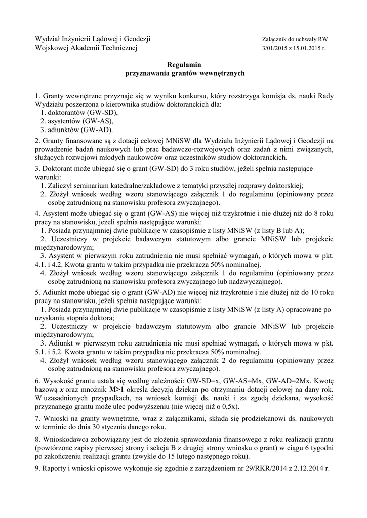 Wydział Inżynierii Lądowej i Geodezji Wojskowej Akademii Technicznej Załącznik do uchwały RW 3/01/2015 z 15.01.2015 r. Regulamin przyznawania grantów wewnętrznych 1. Granty wewnętrzne przyznaje się w wyniku konkursu, który rozstrzyga komisja ds. nauki Rady Wydziału poszerzona o kierownika studiów doktoranckich dla: 1. doktorantów (GW-SD), 2. asystentów (GW-AS), 3. adiunktów (GW-AD). 2. Granty finansowane są z dotacji celowej MNiSW dla Wydziału Inżynierii Lądowej i Geodezji na prowadzenie badań naukowych lub prac badawczo-rozwojowych oraz zadań z nimi związanych, służących rozwojowi młodych naukowców oraz uczestników studiów doktoranckich. 3. Doktorant może ubiegać się o grant (GW-SD) do 3 roku studiów, jeżeli spełnia następujące warunki: 1. Zaliczył seminarium katedralne/zakładowe z tematyki przyszłej rozprawy doktorskiej; 2. Złożył wniosek według wzoru stanowiącego załącznik 1 do regulaminu (opiniowany przez osobę zatrudnioną na stanowisku profesora zwyczajnego). 4. Asystent może ubiegać się o grant (GW-AS) nie więcej niż trzykrotnie i nie dłużej niż do 8 roku pracy na stanowisku, jeżeli spełnia następujące warunki: 1. Posiada przynajmniej dwie publikacje w czasopiśmie z listy MNiSW (z listy B lub A); 2. Uczestniczy w projekcie badawczym statutowym albo grancie MNiSW lub projekcie międzynarodowym; 3. Asystent w pierwszym roku zatrudnienia nie musi spełniać wymagań, o których mowa w pkt. 4.1. i 4.2. Kwota grantu w takim przypadku nie przekracza 50% nominalnej. 4. Złożył wniosek według wzoru stanowiącego załącznik 1 do regulaminu (opiniowany przez osobę zatrudnioną na stanowisku profesora zwyczajnego lub nadzwyczajnego). 5. Adiunkt może ubiegać się o grant (GW-AD) nie więcej niż trzykrotnie i nie dłużej niż do 10 roku pracy na stanowisku, jeżeli spełnia następujące warunki: 1. Posiada przynajmniej dwie publikacje w czasopiśmie z listy MNiSW (z listy A) opracowane po uzyskaniu stopnia doktora; 2. Uczestniczy w projekcie badawczym statutowym albo grancie MNiSW lub projekcie międzynarodowym; 3. Adiunkt w pierwszym roku zatrudnienia nie musi spełniać wymagań, o których mowa w pkt. 5.1. i 5.2. Kwota grantu w takim przypadku nie przekracza 50% nominalnej. 4. Złożył wniosek według wzoru stanowiącego załącznik 2 do regulaminu (opiniowany przez osobę zatrudnioną na stanowisku profesora zwyczajnego). 6. Wysokość grantu ustala się według zależności: GW-SD=x, GW-AS=Mx, GW-AD=2Mx. Kwotę bazową x oraz mnożnik M>1 określa decyzją dziekan po otrzymaniu dotacji celowej na dany rok. W uzasadnionych przypadkach, na wniosek komisji ds. nauki i za zgodą dziekana, wysokość przyznanego grantu może ulec podwyższeniu (nie więcej niż o 0,5x). 7. Wnioski na granty wewnętrzne, wraz z załącznikami, składa się prodziekanowi ds. naukowych w terminie do dnia 30 stycznia danego roku. 8. Wnioskodawca zobowiązany jest do złożenia sprawozdania finansowego z roku realizacji grantu (powtórzone zapisy pierwszej strony i sekcja B z drugiej strony wniosku o grant) w ciągu 6 tygodni po zakończeniu realizacji grantu (zwykle do 15 lutego następnego roku). 9. Raporty i wnioski opisowe wykonuje się zgodnie z zarządzeniem nr 29/RKR/2014 z 2.12.2014 r.