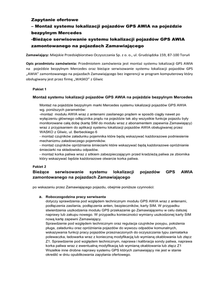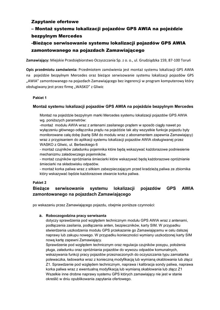 Zapytanie ofertowe – Montaż systemu lokalizacji pojazdów GPS AWIA na pojeździe bezpylnym Mercedes -Bieżące serwisowanie systemu lokalizacji pojazdów GPS AWIA zamontowanego na pojazdach Zamawiającego Zamawiający: Miejskie Przedsiębiorstwo Oczyszczania Sp. z o. o., ul. Grudziądzka 159, 87-100 Toruń Opis przedmiotu zamówienia: Przedmiotem zamówienia jest montaż systemu lokalizacji GPS AWIA na pojeździe bezpylnym Mercedes oraz bieżące serwisowanie systemu lokalizacji pojazdów GPS „AWIA” zamontowanego na pojazdach Zamawiającego bez ingerencji w program komputerowy który obsługiwany jest przez firmę „WASKO” z Gliwic Pakiet 1 Montaż systemu lokalizacji pojazdów GPS AWIA na pojeździe bezpylnym Mercedes Montaż na pojeździe bezpylnym marki Mercedes systemu lokalizacji pojazdów GPS AWIA wg. poniższych parametrów: -montaż modułu AWIA wraz z antenami zasilanego prądem w sposób ciągły nawet po wyłączeniu głównego odłącznika prądu na pojeździe tak aby wszystkie funkcje pojazdu były monitorowane całą dobę (kartę SIM do modułu wraz z abonamentem zapewnia Zamawiający) wraz z przypisaniem do aplikacji systemu lokalizacji pojazdów AWIA obsługiwanej przez WASKO z Gliwic, ul. Berbeckiego 6 - montaż czujników załadunku pojemnika które będą wskazywać każdorazowe podniesienie mechanizmu załadowczego pojemników. - montaż czujników opróżniania śmieciarki które wskazywać będą każdorazowe opróżnianie śmieciarki na składowisku odpadów. - montaż korka paliwa wraz z sitkiem zabezpieczającym przed kradzieżą paliwa ze zbiornika który wskazywać będzie każdorazowe otwarcie korka paliwa. Pakiet 2 Bieżące serwisowanie systemu lokalizacji zamontowanego na pojazdach Zamawiającego pojazdów GPS AWIA po wskazaniu przez Zamawiającego pojazdu, obejmie poniższe czynności: a. Roboczogodzina pracy serwisanta dotyczy sprawdzenia pod względem technicznym modułu GPS AWIA wraz z antenami, podłączenia zasilania, podłączenia anten, bezpieczników, karty SIM. W przypadku stwierdzenia uszkodzenia modułu GPS przekazanie go Zamawiającemu w celu dalszej naprawy lub zakupu nowego. W przypadku konieczności wymiany uszkodzonej karty SIM nową kartę zapewni Zamawiający. Sprawdzenie pod względem technicznym oraz regulacja czujników posypu, położenia pługa, załadunku oraz opróżniania pojazdów do wywozu odpadów komunalnych, wskazywania funkcji pracy pojazdów przeznaczonych do oczyszczania typu zamiatarka polewaczka, ładowarka wraz z konieczną modyfikacją lub wymianą okablowania lub złącz Z1. Sprawdzenie pod względem technicznym, naprawa i kalibracja sondy paliwa, naprawa korka paliwa wraz z ewentualną modyfikacją lub wymianą okablowania lub złącz Z1 Wszelkie inne drobne naprawy systemu GPS których zamawiający nie jest w stanie określić w dniu opublikowania zapytania ofertowego. b. Wymiana mechanicznego zbliżeniowego czujnika funkcji ( dotyczy w zależności od potrzeb i możliwości wymiany mechanicznego zbliżeniowego czujnika wraz z ewentualną modyfikacją instalacji następujących funkcji : pługa, załadunku pojemnika na śmieciarce, opróżnianie śmieciarki, załadunek kontenera, opuszczenie szczotek, polewanie) który będzie zamontowany w miejscu gdzie nie będzie możliwości jego uszkodzenia podczas pracy pojazdu. c. Wymiana optycznego punktowego czujnika funkcji ( dotyczy w zależności od potrzeb i możliwości wymiany czujnika optycznego punktowego wraz z ewentualną modyfikacją instalacji następujących funkcji : pługa, załadunku pojemnika na śmieciarce, opróżnianie śmieciarki, załadunek kontenera, opuszczenie szczotek, polewanie) który będzie zamontowany w pojeździe w którym nie ma możliwości zamontowania czujnika mechanicznego zbliżeniowego ze względu na możliwość jego szybkiego uszkodzenia, ale wskazywanie funkcji nie ulegnie zmianom. d. Wymiana optycznego czujnika funkcji posypywania ( dotyczy wymiany czujnika optycznego wskazującego funkcje posypywania środkiem uszarstniającym podczas Akcji Zima wraz z ewentualną modyfikacją instalacji. Obecnie wszystkie nadwozia piaskarek wyposażone są w czujniki optyczne. e. Wymiana korka paliwa (dotyczy wymiany korka paliwa wraz z sitkiem zabezpieczającym przed kradzieżą paliwa ze zbiornika wraz z ewentualną modyfikacją instalacji, aktualnie zainstalowane są korki BAK Q80 firmy Aplisens) f. Wymiana sondy paliwa (dotyczy wymiany zanurzeniowej sondy paliwa wraz z ewentualną modyfikacją instalacji) Rozliczenie za wykonane pracę odbywać się będą wg następujących zasad: - po stwierdzeniu uszkodzenia i konieczności wymiany czujnika funkcji, korka lub sondy rozliczenie nastąpi według ceny za wymianę poszczególnych elementów zgodnie z cenami zawartymi w formularzu ofertowym - w razie konieczności prac innych niż wymiana czujnika funkcji, korka lub sondy rozliczenie na podstawie iloczynu stawki za roboczogodzinę zgodnie z cenami zawartymi w formularzu ofertowym oraz ilości godzin przepracowanych przez serwisanta Wykaz pojazdów oraz ich funkcje jakimi dysponuje Zamawiający stanowi załącznik nr 1 do zapytania ofertowego. Najczęstszymi usterkami na wymienionych pojazdach są awarie czujników funkcji załadunku i opróżniania śmieciarek, pojazdów kontenerowych oraz czujników optycznych wskazujących funkcję posypywania w piaskarkach . Zamawiający szacuje, że będzie to ok. 70 % zamówienia. Oferta powinna zawierać informacje na temat ceny netto pojedynczej usługi wyszczególnionej w opisie przedmiotu zamówienia, wraz z kosztem zakupu części, przewodów, złączek, robocizną, dojazdem do siedziby Zamawiającego przy ul. Grudziądzkiej 159, 87-100 Toruń i innymi kosztami związanymi ze świadczeniem usługi. Załącznikiem nr 2 do opisu przedmiotu zamówienia jest projekt umowy z wykonawcą, który stanowi integralną część zapytania ofertowego. Zapisy projektu umowy należy bezwzględnie brać po