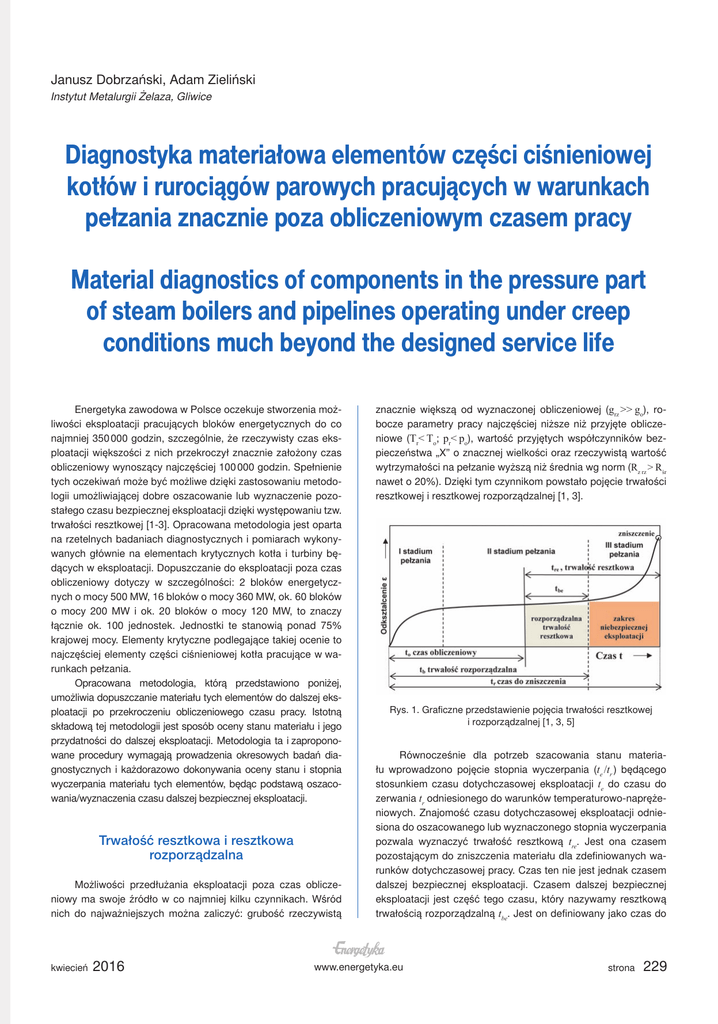 Janusz Dobrzański, Adam Zieliński Instytut Metalurgii Żelaza, Gliwice Diagnostyka materiałowa elementów części ciśnieniowej kotłów i rurociągów parowych pracujących w warunkach pełzania znacznie poza obliczeniowym czasem pracy Material diagnostics of components in the pressure part of steam boilers and pipelines operating under creep conditions much beyond the designed service life Energetyka zawodowa w Polsce oczekuje stworzenia możliwości eksploatacji pracujących bloków energetycznych do co najmniej 350 000 godzin, szczególnie, że rzeczywisty czas eksploatacji większości z nich przekroczył znacznie założony czas obliczeniowy wynoszący najczęściej 100 000 godzin. Spełnienie tych oczekiwań może być możliwe dzięki zastosowaniu metodologii umożliwiającej dobre oszacowanie lub wyznaczenie pozostałego czasu bezpiecznej eksploatacji dzięki występowaniu tzw. trwałości resztkowej [1-3]. Opracowana metodologia jest oparta na rzetelnych badaniach diagnostycznych i pomiarach wykonywanych głównie na elementach krytycznych kotła i turbiny będących w eksploatacji. Dopuszczanie do eksploatacji poza czas obliczeniowy dotyczy w szczególności: 2 bloków energetycznych o mocy 500 MW, 16 bloków o mocy 360 MW, ok. 60 bloków o mocy 200 MW i ok. 20 bloków o mocy 120 MW, to znaczy łącznie ok. 100 jednostek. Jednostki te stanowią ponad 75% krajowej mocy. Elementy krytyczne podlegające takiej ocenie to najczęściej elementy części ciśnieniowej kotła pracujące w warunkach pełzania. Opracowana metodologia, którą przedstawiono poniżej, umożliwia dopuszczanie materiału tych elementów do dalszej eksploatacji po przekroczeniu obliczeniowego czasu pracy. Istotną składową tej metodologii jest sposób oceny stanu materiału i jego przydatności do dalszej eksploatacji. Metodologia ta i zaproponowane procedury wymagają prowadzenia okresowych badań diagnostycznych i każdorazowo dokonywania oceny stanu i stopnia wyczerpania materiału tych elementów, będąc podstawą oszacowania/wyznaczenia czasu dalszej bezpiecznej eksploatacji. Trwałość resztkowa i resztkowa rozporządzalna Możliwości przedłużania eksploatacji poza czas obliczeniowy ma swoje źródło w co najmniej kilku czynnikach. Wśród nich do najważniejszych można zaliczyć: grubość rzeczywistą kwiecień 2016 znacznie większą od wyznaczonej obliczeniowej (grz ˃˃ go), robocze parametry pracy najczęściej niższe niż przyjęte obliczeniowe (Tr˂ To; pr˂ po), wartość przyjętych współczynników bezpieczeństwa „X” o znacznej wielkości oraz rzeczywistą wartość wytrzymałości na pełzanie wyższą niż średnia wg norm (Rz rz ˃ Rśr nawet o 20%). Dzięki tym czynnikom powstało pojęcie trwałości resztkowej i resztkowej rozporządzalnej [1, 3]. Rys. 1. Graficzne przedstawienie pojęcia trwałości resztkowej i rozporządzalnej [1, 3, 5] Równocześnie dla potrzeb szacowania stanu materiału wprowadzono pojęcie stopnia wyczerpania (te /tr ) będącego stosunkiem czasu dotychczasowej eksploatacji te do czasu do zerwania tr odniesionego do warunków temperaturowo-naprężeniowych. Znajomość czasu dotychczasowej eksploatacji odniesiona do oszacowanego lub wyznaczonego stopnia wyczerpania pozwala wyznaczyć trwałość resztkową tre. Jest ona czasem pozostającym do zniszczenia materiału dla zdefiniowanych warunków dotychczasowej pracy. Czas ten nie jest jednak czasem dalszej bezpiecznej eksploatacji. Czasem dalszej bezpiecznej eksploatacji jest część tego czasu, który nazywamy resztkową trwałością rozporządzalną tbe. Jest on definiowany jako czas do www.energetyka.eu strona 229 osiągnięcia końca drugiego okresu pełzania. Jego udział w czasie do zerwania jest nieco różny i zależy od poziomu temperatury oraz naprężenia. Pojęcia trwałości resztkowej i rozporządzalnej resztkowej przedstawiono w postaci graficznej na rysunku 1 [1, 3, 5]. Zasady doboru rodzaju badań w ocenie stanu materiału elementów pracujących w warunkach pełzania Ocena stanu materiału jest jedną z najbardziej istotnych składowych w ocenie stanu elementów pracujących w warunkach pełzania i w określaniu ich przydatności do dalszej eksploatacji. Wybór sposobu oceny stanu materiału, jego przydatności do dalszej pracy oraz szacowania/wyznaczania czasu dalszej bezpiecznej eksploatacji materiału elementu decyduje o doborze rodzaju diagnostycznych badań niezbędnych w tej ocenie. Rodzaj tych badań należy dostosować do czasu eksploatacji i typu elementu części ciśnieniowej bloku energetycznego podlegającego badaniom. Ocena stanu i przydatności do dalszej pracy materiałów elementów po eksploatacji w warunkach pełzania znacznie poza obliczeniowym czasem pracy są wykonywane w oparciu o opracowane algorytmy postępowania uwzględniające możliwe i niezbędne do przeprowadzenia rodzaje badań oraz wymaganą dla ich wykonania metodykę [1-8]. Dla oszacowania stopnia wyczerpania na podstawie badań strukturalnych, najczęściej metodami nieniszczącymi, niezbędna jest znajomość zachowania się badanych materiałów w czasie pracy w warunkach pełzania. Zmiany w strukturze zachodzą w jej podstawowych składnikach fazowych oraz występujących wydzieleniach, powodując powstawanie i rozwój wewnętrznych uszkodzeń. Ujawniono, że udział poszczególnych rodzajów procesów i ich intensywność zależy od typu struktury stanu wyjściowego i stopnia wyczerpania. W pierwszym okresie największe zmiany są związane z rozpadem obszarów perlitu i/lub bainitu w stalach niskostopowych oraz martenzytu w stalach wysokochromowych. Ze wzrostem stopnia wyczerpania intensywność tych zmian maleje, natomiast rośnie intensywność procesów wydzieleniowych. Zaawansowany stan rozwoju procesów wydzieleniowych sprzyja inkubacji i rozwojowi wewnętrznych uszkodzeń powodując powstawanie nieciągłości. Inicjacja nieciągłości najczęściej następuje pod koniec dru