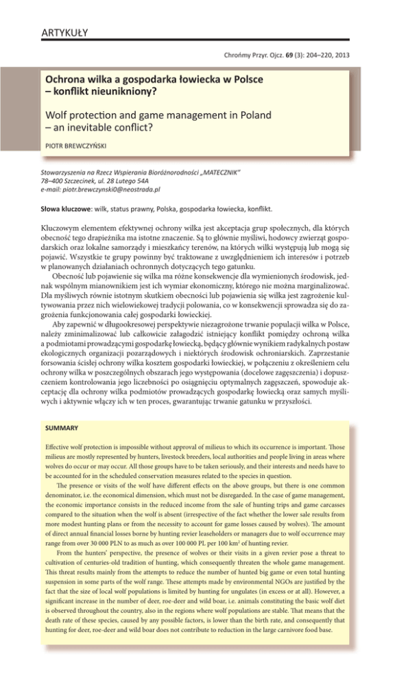 ARTYKUŁY Chrońmy Przyr. Ojcz. 69 (3): 204–220, 2013 Ochrona wilka a gospodarka łowiecka w Polsce – konflikt nieunikniony? Wolf protec�on and game management in Poland – an inevitable conflict? PIOTR BREWCZYŃSKI Stowarzyszenia na Rzecz Wspierania Bioróżnorodności „MATECZNIK” 78–400 Szczecinek, ul. 28 Lutego 54A e-mail: [email protected] Słowa kluczowe: wilk, status prawny, Polska, gospodarka łowiecka, konflikt. Kluczowym elementem efektywnej ochrony wilka jest akceptacja grup społecznych, dla których obecność tego drapieżnika ma istotne znaczenie. Są to głównie myśliwi, hodowcy zwierząt gospodarskich oraz lokalne samorządy i mieszkańcy terenów, na których wilki występują lub mogą się pojawić. Wszystkie te grupy powinny być traktowane z uwzględnieniem ich interesów i potrzeb w planowanych działaniach ochronnych dotyczących tego gatunku. Obecność lub pojawienie się wilka ma różne konsekwencje dla wymienionych środowisk, jednak wspólnym mianownikiem jest ich wymiar ekonomiczny, którego nie można marginalizować. Dla myśliwych równie istotnym skutkiem obecności lub pojawienia się wilka jest zagrożenie kultywowania przez nich wielowiekowej tradycji polowania, co w konsekwencji sprowadza się do zagrożenia funkcjonowania całej gospodarki łowieckiej. Aby zapewnić w długookresowej perspektywie niezagrożone trwanie populacji wilka w Polsce, należy zminimalizować lub całkowicie załagodzić istniejący konflikt pomiędzy ochroną wilka a podmiotami prowadzącymi gospodarkę łowiecką, będący głównie wynikiem radykalnych postaw ekologicznych organizacji pozarządowych i niektórych środowisk ochroniarskich. Zaprzestanie forsowania ścisłej ochrony wilka kosztem gospodarki łowieckiej, w połączeniu z określeniem celu ochrony wilka w poszczególnych obszarach jego występowania (docelowe zagęszczenia) i dopuszczeniem kontrolowania jego liczebności po osiągnięciu optymalnych zagęszczeń, spowoduje akceptację dla ochrony wilka podmiotów prowadzących gospodarkę łowiecką oraz samych myśliwych i aktywnie włączy ich w ten proces, gwarantując trwanie gatunku w przyszłości. SUMMARY Effective wolf protection is impossible without approval of milieus to which its occurrence is important. Those milieus are mostly represented by hunters, livestock breeders, local authorities and people living in areas where wolves do occur or may occur. All those groups have to be taken seriously, and their interests and needs have to be accounted for in the scheduled conservation measures related to the species in question. The presence or visits of the wolf have different effects on the above groups, but there is one common denominator, i.e. the economical dimension, which must not be disregarded. In the case of game management, the economic importance consists in the reduced income from the sale of hunting trips and game carcasses compared to the situation when the wolf is absent (irrespective of the fact whether the lower sale results from more modest hunting plans or from the necessity to account for game losses caused by wolves). The amount of direct annual financial losses borne by hunting revier leaseholders or managers due to wolf occurrence may range from over 30 000 PLN to as much as over 100 000 PL per 100 km2 of hunting revier. From the hunters’ perspective, the presence of wolves or their visits in a given revier pose a threat to cultivation of centuries-old tradition of hunting, which consequently threaten the whole game management. This threat results mainly from the attempts to reduce the number of hunted big game or even total hunting suspension in some parts of the wolf range. These attempts made by environmental NGOs are justified by the 204 fact that the size of local wolf populations is limited by hunting for ungulates (in excess or at all). However, a significant increase in the number of deer, roe-deer and wild boar, i.e. animals constituting the basic wolf diet is observed throughout the country, also in the regions where wolf populations are stable. That means that the death rate of these species, caused by any possible factors, is lower than the birth rate, and consequently that hunting for deer, roe-deer and wild boar does not contribute to reduction in the large carnivore food base. In order to preserve sustainable wolf populations in Poland, the conflict between those who work for wolf conservation and the entities dealing with game management has to be mitigated or totally resolved. The conflict is induce mainly by the radical attitude of non-governmental environmental organisations and some milieus of nature conservationists. The first step to resolve the conflict between wolf protection and game management is to make the conservationists aware of the following facts determined in the course of scientific research and everyday practice. 1. The proper game management, including ungulate hunting, does not pose any threat to wolves or other carnivores. 2. There are no factual or legal basis for submitting the annual hunting plans and long-term hunting breeding plans for environmental impact assessment with respect to protection of large carnivores, including the wolf. Applying the environmental impact assessment procedure to annual hunting plans would involve additional changes in the inventory schedules, approval of annual hunting plans, and thus most likely changes in the hunting season duration, which could make the complicated procedure of hunting planning even more difficult. 3. Assigning arbitrary levels for the number of hunted ungulates to provide adequate food resources for wolves is not justified and does not contribute to an increase in the number of carnivores. 4. When determining the target wolf population density in individual zones (regions) of their range, the extent of damage in forests, damage to crops and agricultural products caused by ungulates (basic food of wolf) should be accounte