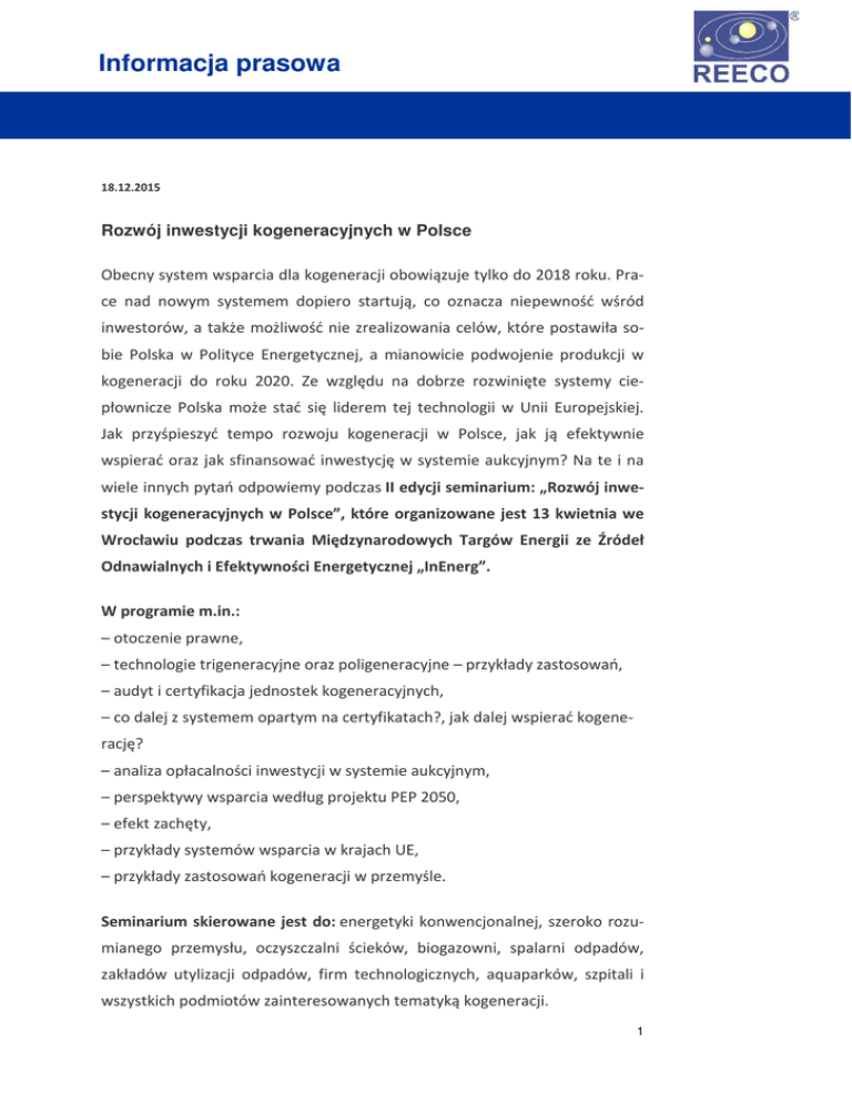 Informacja prasowa 18.12.2015 Rozwój inwestycji kogeneracyjnych w Polsce Obecny system wsparcia dla kogeneracji obowiązuje tylko do 2018 roku. Prace nad nowym systemem dopiero startują, co oznacza niepewność wśród inwestorów, a także możliwość nie zrealizowania celów, które postawiła sobie Polska w Polityce Energetycznej, a mianowicie podwojenie produkcji w kogeneracji do roku 2020. Ze względu na dobrze rozwinięte systemy ciepłownicze Polska może stać się liderem tej technologii w Unii Europejskiej. Jak przyśpieszyć tempo rozwoju kogeneracji w Polsce, jak ją efektywnie wspierać oraz jak sfinansować inwestycję w systemie aukcyjnym? Na te i na wiele innych pytań odpowiemy podczas II edycji seminarium: „Rozwój inwestycji kogeneracyjnych w Polsce”, które organizowane jest 13 kwietnia we Wrocławiu podczas trwania Międzynarodowych Targów Energii ze Źródeł Odnawialnych i Efektywności Energetycznej „InEnerg”. W programie m.in.: – otoczenie prawne, – technologie trigeneracyjne oraz poligeneracyjne – przykłady zastosowań, – audyt i certyfikacja jednostek kogeneracyjnych, – co dalej z systemem opartym na certyfikatach?, jak dalej wspierać kogenerację? – analiza opłacalności inwestycji w systemie aukcyjnym, – perspektywy wsparcia według projektu PEP 2050, – efekt zachęty, – przykłady systemów wsparcia w krajach UE, – przykłady zastosowań kogeneracji w przemyśle. Seminarium skierowane jest do: energetyki konwencjonalnej, szeroko rozumianego przemysłu, oczyszczalni ścieków, biogazowni, spalarni odpadów, zakładów utylizacji odpadów, firm technologicznych, aquaparków, szpitali i wszystkich podmiotów zainteresowanych tematyką kogeneracji. 1 Informacja prasowa *** tłumaczenie symultaniczne przy osiągniętej minimalnej liczby uczestników z zagranicy Koszt uczestnictwa w konferencji: • 393,60 PLN w przypadku rejestracji uczestnictwa do dnia 11.03.2016 r • 492,00 PLN w przypadku rejestracji uczestnictwa po dniu 11.03.2016 r • 393,60 PLN cena z kodem rabatowym • 246,00 PLN studenci za okazaniem legitymacji studenckiej Seminarium odbędzie się podczas trwania Międzynarodowych Targów Energii ze Źródeł Odnawialnych i Efektywności Energetycznej „InEnerg” na Stadionie Miejskim we Wrocławiu przy Alei Śląskiej 1 w Strefie VIP. Więcej informacji na stronie współorganizatora: http://city-brand.pl/wroclaw-13-04-2016/ Rejestracja odbywa się na stronie: http://www.inenerg.com/ Kontakt do współorganizatora: Kamil Ptak City-Brand Energia Odnawialna 530-049-882 [email protected] www.city-brand.pl Organizator InEnerg: REECO Poland Sp. z o.o. ul. Bartycka 22B/21A 00-716 Warszawa Tel.: +48 (0) 22 266 02 16 Fax: +48 (0) 22 379 78 60 [email protected] www.inenerg.com 2 Informacja prasowa Organizator REECO Poland Sp. z o.o. jest częścią grupy REECO z główną siedzibą w Niemczech i oddziałami: Reutlingen/Niemcy, Salzburg/Austria, Nowy Sad/Serbia oraz Arad/Rumunia. Od 1997 roku spotyka się rocznie około 50 000 fachowców z 70 krajów na targach specjalistycznych i kongresach, które organizowane są przez REECO. Wszystkie terminy targów można znaleźć na stronie www.reeco.eu. 3