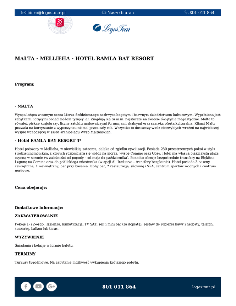 [email protected] Nasze biura 801 011 864 MALTA - MELLIEHA - HOTEL RAMLA BAY RESORT Program: - MALTA Wyspa leżąca w samym sercu Morza Śródziemnego zachwyca bogatym i barwnym dziedzictwem kulturowym. Wypełniona jest zabytkami liczącymi ponad siedem tysięcy lat. Znajdują się tu m.in. najstarsze na świecie świątynie megalityczne. Malta to również piękne krajobrazy, liczne zatoki z malowniczymi formacjami skalnymi oraz szeroka oferta kulturalna. Klimat Malty pozwala na korzystanie z wypoczynku niemal przez cały rok. Wszystko to dostarczy wiele niezwykłych wrażeń na największej wyspie wchodzącej w skład archipelagu Wysp Maltańskich. - Hotel RAMLA BAY RESORT 4* Hotel położony w Mellieha, w niewielkiej zatoczce, daleko od zgiełku cywilizacji. Posiada 280 przestrzennych pokoi w stylu śródziemnomorskim, z których rozpościera się widok na morze, wyspę Comino oraz Gozo. Hotel ma własną piaszczystą plażę, czynną w sezonie (w zależności od pogody – od maja do października). Ponadto oferuje bezpośrednie transfery na Błękitną Lagunę na Comino oraz do pobliskiego miasteczka (w opcji All Inclusive – transfery bezpłatnie). Hotel posiada 3 baseny zewnętrzne, 1 wewnętrzny, bar przy basenie, lobby bar, 2 restauracje, siłownię i SPA, centrum sportów wodnych i centrum nurkowe. Cena obejmuje: Dodatkowe informacje: ZAKWATEROWANIE Pokoje 1- i 2-osob., łazienka, klimatyzacja, TV SAT, sejf i mini bar (za dopłatą), zestaw do robienia kawy i herbaty, telefon, suszarkę, balkon lub taras. WYŻYWIENIE Śniadania i kolacje w formie bufetu. TERMINY Turnusy tygodniowe. Na zapytanie możliwość wykupienia krótszego pobytu. 801 011 864 logostour.pl [email protected] Nasze biura 801 011 864 WARUNKI PLATNOŚCI 30% kwoty rezerwacji przy podpisaniu umowy, dopłata do 100% na 35 dni przed wyjazdem. ZNIŻKI Dla dzieci do 2 lat - gratis; dla dzieci 2-12 lat (w pokoju z dwoma osobami dorosłymi) - pierwsze dziecko gratis; drugie dziecko 25% zniżki. DOPLATA Osoba w pokoju 1-osob. 1300 PLN/turnus – w lipcu i sierpniu, 850 PLN/turnus – w pozostałych terminach. Pokój z widokiem na morze - 300 PLN/turnus/osoba. Pakiet All inclusive – 900 PLN/turnus/osoba dor., 500 PLN/turnus/dziecko. UBIEZPIECZENIE Obowiązkowe Signal Iduna, KL (15 000 EUR), NW (7000 PLN), bagaż (800 PLN) - dodatkowo płatne 25 PLN. INNE Taksa turystyczna w cenie. UWAGA! Kwota zaliczki może się zmienić w zależności od aktualnych cen biletów lotniczych. CENA W PLN od osoby, w pokoju 2-osob, za turnus tygodniowy. TRANSPORT Na zapytanie przeloty międzynarodowe liniami Ryanair z Krakowa lub Wrocławia (za dopłatą – około 600-900 PLN w zależności od aktualnych cen przewoźnika). TRANSFERY Za dopłatą 135 PLN/osoba (przy min. 2 os. dor.); transfer lotnisko-hotel-lotnisko, anglojęzyczny opiekun po przylocie i przed wylotem z Malty, powitalny zestaw informacyjny + spotkanie powitalne i dwie wizyty anglojęzycznego rezydenta. Terminy: 801 011 864 logostour.pl