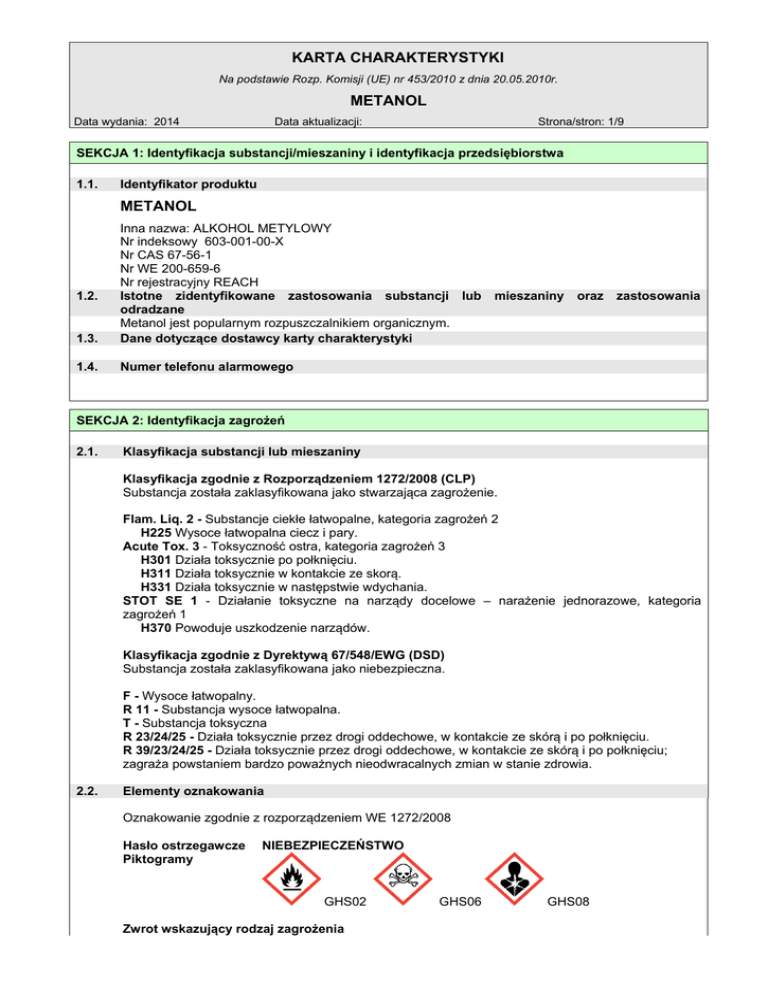 KARTA CHARAKTERYSTYKI Na podstawie Rozp. Komisji (UE) nr 453/2010 z dnia 20.05.2010r. METANOL Data wydania: 2014 Data aktualizacji: Strona/stron: 1/9 SEKCJA 1: Identyfikacja substancji/mieszaniny i identyfikacja przedsiębiorstwa 1.1. Identyfikator produktu METANOL 1.3. Inna nazwa: ALKOHOL METYLOWY Nr indeksowy 603-001-00-X Nr CAS 67-56-1 Nr WE 200-659-6 Nr rejestracyjny REACH Istotne zidentyfikowane zastosowania substancji lub odradzane Metanol jest popularnym rozpuszczalnikiem organicznym. Dane dotyczące dostawcy karty charakterystyki 1.4. Numer telefonu alarmowego 1.2. mieszaniny oraz zastosowania SEKCJA 2: Identyfikacja zagrożeń 2.1. Klasyfikacja substancji lub mieszaniny Klasyfikacja zgodnie z Rozporządzeniem 1272/2008 (CLP) Substancja została zaklasyfikowana jako stwarzająca zagrożenie. Flam. Liq. 2 - Substancje ciekłe łatwopalne, kategoria zagrożeń 2 H225 Wysoce łatwopalna ciecz i pary. Acute Tox. 3 - Toksyczność ostra, kategoria zagrożeń 3 H301 Działa toksycznie po połknięciu. H311 Działa toksycznie w kontakcie ze skorą. H331 Działa toksycznie w następstwie wdychania. STOT SE 1 - Działanie toksyczne na narządy docelowe – narażenie jednorazowe, kategoria zagrożeń 1 H370 Powoduje uszkodzenie narządów. Klasyfikacja zgodnie z Dyrektywą 67/548/EWG (DSD) Substancja została zaklasyfikowana jako niebezpieczna. F - Wysoce łatwopalny. R 11 - Substancja wysoce łatwopalna. T - Substancja toksyczna R 23/24/25 - Działa toksycznie przez drogi oddechowe, w kontakcie ze skórą i po połknięciu. R 39/23/24/25 - Działa toksycznie przez drogi oddechowe, w kontakcie ze skórą i po połknięciu; zagraża powstaniem bardzo poważnych nieodwracalnych zmian w stanie zdrowia. 2.2. Elementy oznakowania Oznakowanie zgodnie z rozporządzeniem WE 1272/2008 Hasło ostrzegawcze Piktogramy NIEBEZPIECZEŃSTWO GHS02 Zwrot wskazujący rodzaj zagrożenia GHS06 GHS08 KARTA CHARAKTERYSTYKI Na podstawie Rozp. Komisji (UE) nr 453/2010 z dnia 20.05.2010r. METANOL Data wydania: 2014 Data aktualizacji: Strona/stron: 2/9 H225 - Wysoce łatwopalna ciecz i pary. H301 - Działa toksycznie po połknięciu. H311 - Działa toksycznie w kontakcie ze skorą. H331 - Działa toksycznie przy wdychaniu. H370 - Powoduje uszkodzenie narządów wewnętrznych. Zwroty wskazujące środki ostrożności Zapobieganie Przechowywać z dala od źródeł ciepła, gorących powierzchni, źródeł iskrzenia, P210 otwartego ognia i innych źródeł zapłonu. Nie palić. Stosować rękawice ochronne / odzież ochronną / ochronę oczu / ochronę P280 twarzy. Reagowanie W PRZYPADKU POŁKNIĘCIA: natychmiast skontaktować się z OŚRODKIEM P301+P310 ZATRUĆ/lekarzem. P303+P361+P353 W PRZYPADKU KONTATKU ZE SKÓRĄ (lub z włosami): Natychmiast zdjąć całą zanieczyszczoną odzież. Spłukać skórę pod strumieniem wody/prysznicem. Przechowywanie Przechowywać w dobrze wentylowanym miejscu. Przechowywać pojemnik P403+P233 szczelnie zamknięty. Usuwanie Przestrzegać wskazówek producenta lub dostawcy dotyczących odzysku lub P502 wtórnego wykorzystania. 2.3. Inne zagrożenia Brak danych. SEKCJA 3: Skład/informacja o składnikach 3.1. Substancje Charakter chemiczny: metanol Nazwa substancji metanol Identyfikator Nr indeksowy 603-001-00-X Nr CAS 67-56-1 Nr WE 200-659-6 % wag 100 Nr rejestracyjny REACH SEKCJA 4: Środki pierwszej pomocy 4.1. Opis środków pierwszej pomocy Drogi narażenia: Drogi oddechowe, drogi pokarmowe, kontakt ze skórą, kontakt z oczami. Następstwa wdychania: Wyprowadzić poszkodowana osobę ze strefy zagrożenia na świeże powietrze. Ułożyć w wygodnej pozycji. Zapewnić ciepło i spokój. W przypadku nieregularnego oddechu lub braku oddechu – wykonać sztuczne oddychanie. Utrzymywać drożność dróg oddechowych Niezwłocznie wezwać pomoc lekarską Następstwa połknięcia: Przepłukać usta wodą, dać do wypicia 2-3 szklanki wody, skontaktować się z lekarzem. Nie wywoływać wymiotów. Osobie nieprzytomnej nie podawać niczego do połknięcia. W razie potrzeby przetransportować do szpitala. Choremu zapewnić spokój, leżenie i ciepło. Kontakt z oczami: KARTA CHARAKTERYSTYKI Na podstawie Rozp. Komisji (UE) nr 453/2010 z dnia 20.05.2010r. METANOL Data wydania: 2014 Data aktualizacji: Strona/stron: 3/9 4.2. 4.3. Przemyć zanieczyszczone oczy większą ilością wody przez 15-20 minut przy wywiniętych powiekach. Założyć opaskę higieniczną chroniącą przed światłem. Zapewnić pomoc okulisty. Kontakt ze skórą: Zdjąć zanieczyszczone ubranie. Oczyścić zanieczyszczoną skórę, przemyć dużą ilością wody, a następnie wodą z łagodnym mydłem. W przypadku gdy podrażnienie skóry nie przemija, skonsultować się z lekarzem dermatologiem. Najważniejsze ostre i opóźnione objawy oraz skutki narażenia Może wystąpić działanie narkotyczne. Wskazania dotyczące wszelkiej natychmiastowej pomocy lekarskiej i szczególnego postępowania z poszkodowanym W miejscu pracy powinny być dostępne środki umożliwiające natychmiastową pomoc przedlekarską. Osoby udzielające pierwszej pomocy powinny posiadać rękawiczki medyczne SEKCJA 5: Postępowanie w przypadku pożaru 5.1. 5.2. 5.3. Środki gaśnicze Odpowiednie środki gaśnicze: ditlenek węgla CO2, proszki gaśnicze, piana gaśnicza odporna na alkohol, Niewłaściwe środki gaśnicze: Nie stosować zwartych strumieni wody na powierzchnię palącej się substancji. Powoduje to rozrzucanie palącej się substancji, a tym samym rozprzestrzenianie ognisk pożaru. Szczególne zagrożenia związane z substancją lub mieszaniną Produkty spalania: Podczas spalania tworzą się tlenki i ditlenki węgla i woda. Mieszaniny wybuchowe: W sprzyjających warunkach termicznych, pary tworzą z powietrzem mieszaniny wybuchowe. Pary są cięższe od powietrza i gromadzą się przy powierzchni. Zbiorniki i inne opakowania z metanolem narażone na działanie ognia lub wysokiej temperatury mogą eksplodować. Informacje dla straż