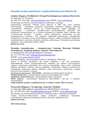 Poradnie terapii uzależnienia i współuzależnienia od alkoholu (6) Gabinet Diagnoz, Profilaktyki i Terapii Psychologicznej Andrzej Zborowski ul. Storrady 5/1, Szczecin tel. 506 756 270; mail: [email protected]; WWW: www.santocka.pl Psycholog, psychiatra, psychoterapeuta uzależnień, socjolog Psychoterapia uzależnień. Ośrodek został założony w 2003 roku przez Andrzeja Zborowskiego - psychologa, specjalistę psychoterapii uzależnień, biegłego sądowego w przedmiocie uzależnień. Tworzy go wielodyscyplinarny zespół składający się z psychologów i socjologów, certyfikowanych psychoterapeutów uzależnień oraz psychiatrów. Specjalizujemy się w leczeniu uzależnień od: alkoholu, leków, nikotyny oraz w zaburzeniach nawyków i popędów: hazard patologiczny, uzależnienia od gier komputerowych i Internetu i inne nałogowe zachowania (pracoholizm, zakupoholizm, seksoholizm). Oferujemy pomoc psychologiczną osobom z rodzin z problemem uzależnień: współmałżonkowi, dzieciom, młodzieży, rodzicom uzależnionego. Prowadzimy psychoterapię dorosłych - dzieci alkoholików (DDA, DDD). gabinet prywatny Poradnia konsultacyjno - terapeutyczna Centrum Rozwoju Rodziny Prawobrzeże, Fundacja Kultury i Sportu "Prawobrzeże" ul. Seledynowa 109 (osiedle Bukowe), Szczecin tel. 513 727 459; mail: [email protected]; WWW: www.prawobrzeze.org.pl Psychoterapeuta, psychoterapeuta dzieci i młodzieży, seksuolog Pomoc w obszarze poradnictwa dla rodzin, małżeństw i par oraz poradnictwa indywidualnego. Pomoc psychoterapeutyczna udzielana jest osobom przeżywającym: trudności emocjonalne (przewlekły stres, nerwice, depresja,lęki, strata i inne), zaburzenia jedzenia (anoreksja i bulimia), kryzysy małżeński i partnerskie, trudności wychowawcze i niepokojące zachowania dziecka, problemy wieku dojrzewania, uzależnienia, sytuacje kryzysowe indywidualne i rodzinne. Przyjmują psychoterapeuci: Alina Radny - seksuolog i psychoterapeuta systemowy Wioleta Smykowska - psychoterapeuta systemowy indywidualny, par i rodzin Magdalena Chojęta-Borowicz - psychoterapeuta dzieci i młodzieży Maria Ligocka - psychoterapia integratywna indywidualna i dla par, w podejściu chrześcijańskim usługi bezpłatne (projekt współfinansowany ze środków Gminy Miast Szczecin) Pracownia Diagnozy i Terapii mgr Anna Kic-Nizińska ul. Felczaka 20B (gabinety specjalistyczne DIAGNOZA), Szczecin tel. 733 454 034; mail: [email protected]; WWW: www.pdtszczecin.pl Psycholog, psychoterapeuta poznawczo-behawioralny, terapeuta uzależnień Terapia poznawczo-behawioralna, terapia uzależnień, poradnictwo, psychologiczne, diagnoza psychologiczna dzieci i dorosłych, badania do ZUS. gabinet prywatny SPS ZOZ Zdroje konsultacje ul. Żołnierska 55, Szczecin tel. 91 434 41 38; mail: [email protected]; WWW: http://www.szpital-zdroje.szczecin.pl/zdroje Psychiatra, psycholog, psychoterapeuta, specjalista w terapii uzależnień, rehabilitant Pomoc psychologiczna, leczenie zaburzeń nerwicowych, terapia uzależnień (środki psychoaktywne, alkohol, współuzależnienia), rehabilitacja psychologiczna, oddziały dziennego pobytu, program leczenia substytucyjnego metadonem. NFZ SPZOZ – Ośrodek Terapii Uzależnień od Alkoholu ul. Ostrowska 7, Szczecin tel. 455 83 43; mail: [email protected]; WWW: http://www.otu.szczecin.pl/ Psychiatra, psychoterapeuta uzależnień Terapia osób uzależnionych od alkoholu, oraz osób współuzależnionych, dzieci alkoholików, terapia dla osób uzależnionych od hazardu, oddział dzienny dla uzależnionych od alkoholu. NFZ Wojewódzki Ośrodek Medycyny Pracy - Zachodniopomorskie Centrum Leczenia i Profilaktyki ul. 3-go Maja 25-27, Szczecin tel. 91 471 11 66, 91 471 33 66, 91 488 05 01 mail: [email protected]; WWW: http://womp.szczecin.pl/ Psycholog, psychiatra, seksuolog Diagnoza i leczenie psychiatryczne, terapia uzależnienia i współuzależnienia od alkoholu, pomoc psychologiczna, terapia zaburzeń seksualnych. NFZ