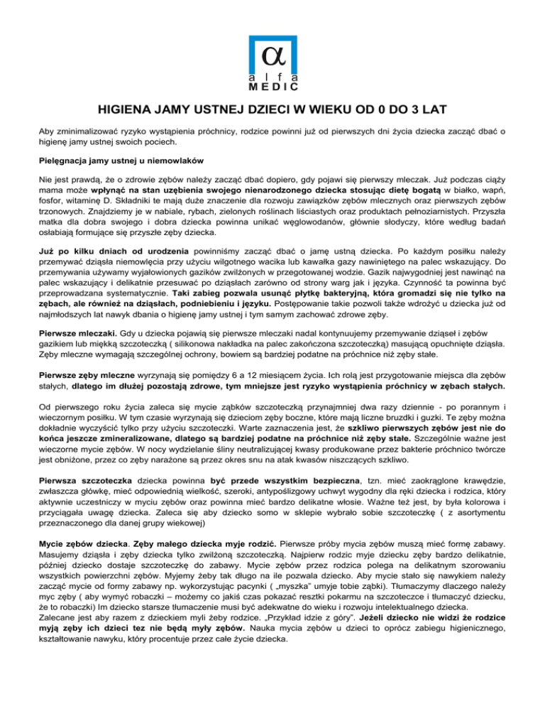 HIGIENA JAMY USTNEJ DZIECI W WIEKU OD 0 DO 3 LAT Aby zminimalizować ryzyko wystąpienia próchnicy, rodzice powinni już od pierwszych dni życia dziecka zacząć dbać o higienę jamy ustnej swoich pociech. Pielęgnacja jamy ustnej u niemowlaków Nie jest prawdą, że o zdrowie zębów należy zacząć dbać dopiero, gdy pojawi się pierwszy mleczak. Już podczas ciąży mama może wpłynąć na stan uzębienia swojego nienarodzonego dziecka stosując dietę bogatą w białko, wapń, fosfor, witaminę D. Składniki te mają duże znaczenie dla rozwoju zawiązków zębów mlecznych oraz pierwszych zębów trzonowych. Znajdziemy je w nabiale, rybach, zielonych roślinach liściastych oraz produktach pełnoziarnistych. Przyszła matka dla dobra swojego i dobra dziecka powinna unikać węglowodanów, głównie słodyczy, które według badań osłabiają formujące się przyszłe zęby dziecka. Już po kilku dniach od urodzenia powinniśmy zacząć dbać o jamę ustną dziecka. Po każdym posiłku należy przemywać dziąsła niemowlęcia przy użyciu wilgotnego wacika lub kawałka gazy nawiniętego na palec wskazujący. Do przemywania używamy wyjałowionych gazików zwilżonych w przegotowanej wodzie. Gazik najwygodniej jest nawinąć na palec wskazujący i delikatnie przesuwać po dziąsłach zarówno od strony warg jak i języka. Czynność ta powinna być przeprowadzana systematycznie. Taki zabieg pozwala usunąć płytkę bakteryjną, która gromadzi się nie tylko na zębach, ale również na dziąsłach, podniebieniu i języku. Postępowanie takie pozwoli także wdrożyć u dziecka już od najmłodszych lat nawyk dbania o higienę jamy ustnej i tym samym zachować zdrowe zęby. Pierwsze mleczaki. Gdy u dziecka pojawią się pierwsze mleczaki nadal kontynuujemy przemywanie dziąseł i zębów gazikiem lub miękką szczoteczką ( silikonowa nakładka na palec zakończona szczoteczką) masującą opuchnięte dziąsła. Zęby mleczne wymagają szczególnej ochrony, bowiem są bardziej podatne na próchnice niż zęby stałe. Pierwsze zęby mleczne wyrzynają się pomiędzy 6 a 12 miesiącem życia. Ich rolą jest przygotowanie miejsca dla zębów stałych, dlatego im dłużej pozostają zdrowe, tym mniejsze jest ryzyko wystąpienia próchnicy w zębach stałych. Od pierwszego roku życia zaleca się mycie ząbków szczoteczką przynajmniej dwa razy dziennie - po porannym i wieczornym posiłku. W tym czasie wyrzynają się dzieciom zęby boczne, które mają liczne bruzdki i guzki. Te zęby można dokładnie wyczyścić tylko przy użyciu szczoteczki. Warte zaznaczenia jest, że szkliwo pierwszych zębów jest nie do końca jeszcze zmineralizowane, dlatego są bardziej podatne na próchnice niż zęby stałe. Szczególnie ważne jest wieczorne mycie zębów. W nocy wydzielanie śliny neutralizującej kwasy produkowane przez bakterie próchnico twórcze jest obniżone, przez co zęby narażone są przez okres snu na atak kwasów niszczących szkliwo. Pierwsza szczoteczka dziecka powinna być przede wszystkim bezpieczna, tzn. mieć zaokrąglone krawędzie, zwłaszcza główkę, mieć odpowiednią wielkość, szeroki, antypoślizgowy uchwyt wygodny dla ręki dziecka i rodzica, który aktywnie uczestniczy w myciu zębów oraz powinna mieć bardzo delikatne włosie. Ważne też jest, by była kolorowa i przyciągała uwagę dziecka. Zaleca się aby dziecko somo w sklepie wybrało sobie szczoteczkę ( z asortymentu przeznaczonego dla danej grupy wiekowej) Mycie zębów dziecka. Zęby małego dziecka myje rodzić. Pierwsze próby mycia zębów muszą mieć formę zabawy. Masujemy dziąsła i zęby dziecka tylko zwilżoną szczoteczką. Najpierw rodzic myje dziecku zęby bardzo delikatnie, później dziecko dostaje szczoteczkę do zabawy. Mycie zębów przez rodzica polega na delikatnym szorowaniu wszystkich powierzchni zębów. Myjemy żeby tak długo na ile pozwala dziecko. Aby mycie stało się nawykiem należy zacząć mycie od formy zabawy np. wykorzystując pacynki ( „myszka” umyje tobie ząbki). Tłumaczymy dlaczego należy myc zęby ( aby wymyć robaczki – możemy co jakiś czas pokazać resztki pokarmu na szczoteczce i tłumaczyć dziecku, że to robaczki) Im dziecko starsze tłumaczenie musi być adekwatne do wieku i rozwoju intelektualnego dziecka. Zalecane jest aby razem z dzieckiem myli żeby rodzice. „Przykład idzie z góry”. Jeżeli dziecko nie widzi że rodzice myją zęby ich dzieci tez nie będą myły zębów. Nauka mycia zębów u dzieci to oprócz zabiegu higienicznego, kształtowanie nawyku, który procentuje przez całe życie dziecka. Rola śliny. Jest ona naturalna ochroną przed próchnicą. Wypłukuje resztki pokarmu i neutralizuje kwasy. W przypadku częstego pojadania pomiędzy posiłkami jak również gdy dziecko pójdzie spać bez umycia zębów po ostatnim posiłku rola ochronna śliny maleje. Podczas snu zmniejsza się wydzielanie śliny . Resztki pokarmu pozostałe na powierzchni zębów lub w bruzdach rozkładane są przez bakterie produkujące kwasy które niszczą szkliwo. Zasypianie z butelką lub podawanie przez sen słodkich napojów przez sen tylko przyspiesza ten proces. Atak trwa przez cały okres snu lub w przypadku częstego pojadania do czasu usunięcia resztek pokarmu. Regularne posiłki. Zaleca się aby dziecko jadło regularnych odstępach czasu. Podawanie dziecku miedzy głównymi posiłkami przekąsek ( szczególnie ciastek bułek , chipsów, chrupek itd.) powoduje że atak kwasów rozpuszczających szkliwo trwa bez przerwy na neutralizacje ich przez ślinę. Korzystne działanie fluoru. Pastę z fluorem możemy wprowadzić już po pierwszym roku życia dziecka. Szkliwo jest wtedy bardzo cienkie i delikatne, a fluor wnika w nie i chroni przed próchnicą. W zasadzie pasty z fluorem powinny używać dzieci, które już umieją płukać usta, ale młodszym maluchom można usuwać resztki pasty kawałkiem gazy. Pierwsza wizyta u stomato