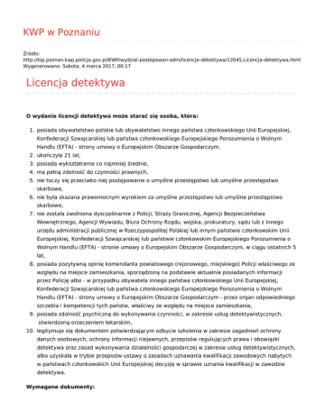 KWP w Poznaniu Źródło: http://bip.poznan.kwp.policja.gov.pl/KWP/wydzial-postepowan-adm/licencje-detektywa/12045,Licencja-detektywa.html Wygenerowano: Sobota, 4 marca 2017, 00:17 Licencja detektywa O wydanie licencji detektywa może starać się osoba, która: 1. posiada obywatelstwo polskie lub obywatelstwo innego państwa członkowskiego Unii Europejskiej, Konfederacji Szwajcarskiej lub państwa członkowskiego Europejskiego Porozumienia o Wolnym Handlu (EFTA) - strony umowy o Europejskim Obszarze Gospodarczym, 2. ukończyła 21 lat, 3. posiada wykształcenie co najmniej średnie, 4. ma pełną zdolność do czynności prawnych, 5. nie toczy się przeciwko niej postępowanie o umyślne przestępstwo lub umyślne przestępstwo skarbowe, 6. nie była skazana prawomocnym wyrokiem za umyślne przestępstwo lub umyślne przestępstwo skarbowe, 7. nie została zwolniona dyscyplinarnie z Policji, Straży Granicznej, Agencji Bezpieczeństwa Wewnętrznego, Agencji Wywiadu, Biura Ochrony Rządu, wojska, prokuratury, sądu lub z innego urzędu administracji publicznej w Rzeczypospolitej Polskiej lub innym państwie członkowskim Unii Europejskiej, Konfederacji Szwajcarskiej lub państwie członkowskim Europejskiego Porozumienia o Wolnym Handlu (EFTA) - stronie umowy o Europejskim Obszarze Gospodarczym, w ciągu ostatnich 5 lat, 8. posiada pozytywną opinię komendanta powiatowego (rejonowego, miejskiego) Policji właściwego ze względu na miejsce zamieszkania, sporządzoną na podstawie aktualnie posiadanych informacji przez Policję albo - w przypadku obywatela innego państwa członkowskiego Unii Europejskiej, Konfederacji Szwajcarskiej lub państwa członkowskiego Europejskiego Porozumienia o Wolnym Handlu (EFTA) - strony umowy o Europejskim Obszarze Gospodarczym - przez organ odpowiedniego szczebla i kompetencji tych państw, właściwy ze względu na miejsce zamieszkania, 9. posiada zdolność psychiczną do wykonywania czynności, w zakresie usług detektywistycznych, stwierdzoną orzeczeniem lekarskim, 10. legitymuje się dokumentem potwierdzającym odbycie szkolenia w zakresie zagadnień ochrony danych osobowych, ochrony informacji niejawnych, przepisów regulujących prawa i obowiązki detektywa oraz zasad wykonywania działalności gospodarczej w zakresie usług detektywistycznych, albo uzyskała w trybie przepisów ustawy o zasadach uznawania kwalifikacji zawodowych nabytych w państwach członkowskich Unii Europejskiej decyzję w sprawie uznania kwalifikacji w zawodzie detektywa. Wymagane dokumenty: 1. pisemny wniosek o wydanie licencji detektywa skierowany do właściwego, ze względu na swoje miejsce zamieszkania, komendanta wojewódzkiego Policji (wniosek winien zawierać imię, nazwisko, adres oraz podpis wnioskującego), 2. kopie stron dowodu osobistego albo dokument stwierdzający posiadane obywatelstwo innego państwa członkowskiego Unii Europejskiej, zawierający imię, nazwisko, datę i miejsce urodzenia lub dokument potwierdzający przysługujące, na podstawie umów międzynarodowych lub przepisów prawa Unii Europejskiej, prawo do podjęcia zatrudnienia lub wykonywania działalności gospodarczej na terytorium Rzeczypospolitej Polskiej, zawierający imię, nazwisko, datę i miejsce urodzenia (oryginał do wglądu), 3. kopia świadectwa lub dyplomu potwierdzającego posiadanie, co najmniej średniego wykształcenia (oryginał do wglądu), 4. pisemne oświadczenie osoby ubiegającej się o wydanie licencji o pełnej zdolności do czynności prawnych - podpisane w obecności pracownika WPA KWP w Poznaniu, 5. pisemne oświadczenie osoby ubiegającej się o wydanie licencji stwierdzające, że nie toczy się przeciwko niej postępowanie o umyślne przestępstwo lub umyślne przestępstwo skarbowe podpisane w obecności pracownika WPA KWP w Poznaniu, 6. zaświadczenie z Krajowego Rejestru Karnego o niekaralności (oryginał), 7. wskazane jest: pisemne oświadczenie osoby ubiegającej się o wydanie licencji stwierdzające, że w ciągu ostatnich 5 lat nie została zwolniona dyscyplinarnie z Policji, Straży Granicznej, Agencji Bezpieczeństwa Wewnętrznego, Agencji Wywiadu, Biura Ochrony Rządu, wojska, prokuratury, sądu lub z innego urzędu administracji publicznej w Rzeczypospolitej Polskiej lub innym państwie członkowskim Unii Europejskiej, Konfederacji Szwajcarskiej lub państwie członkowskim Europejskiego Porozumienia o Wolnym Handlu (EFTA) – stronie umowy o Europejskim Obszarze Gospodarczym - podpisane w obecności pracownika WPA KWP w Poznaniu 8. zaświadczenie o odbyciu szkolenia w zakresie zagadnień ochrony danych osobowych, ochrony informacji niejawnych, przepisów regulujących prawa i obowiązki detektywa oraz zasad wykonywania działalności gospodarczej w zakresie usług detektywistycznych (oryginał) albo decyzja o uznaniu kwalifikacji zawodowych nabytych w państwach członkowskich Unii Europejskiej w sprawie uznania kwalifikacji w zawodzie detektywa (oryginał do wglądu), 9. dwie fotogafie o wym. 2,5 x 3,5 cm, Opłaty (po zakończonym postępowaniu): 1. Opłatę za wydanie licencji detektywa ustala się w wysokości 50% przeciętnego miesięcznego wynagrodzenia z ostatniego kwartału ogłaszanego przez Prezesa Głównego Urzędu Statystycznego w Dzienniku Urzędowym Rzeczypospolitej Polskiej "Monitor Polski". 2. Opłata za wydanie duplikatu licencji detektywa wynosi 20% kwoty, stanowiącej opłatę za wydanie licencji detektywa. 3. Opłatę wnosi się na rachunek bankowy Komendy Wojewódzkiej Policji w Poznaniu NBP O/POZNAŃ 86101014690046042231000000 ad. 1 z dopiskiem „za wydanie licencji detektywa” ad. 2 z dopiskiem „za wydanie duplikatu licencji detektywa” Wykaz aktów prawnych 1. Ustawa z dnia 6 lipca 2001 roku o usługach detektywistycznych (Dz. U. nr 12 poz.110 z 2002 r. z późniejszymi zmianami) 2. Rozporządzenie MSWiA z dnia 30 sierpnia 2004 r. w sprawie składania wniosku o wydanie licencji detektywa (Dz. U. Nr.196 poz. 2020 z pó