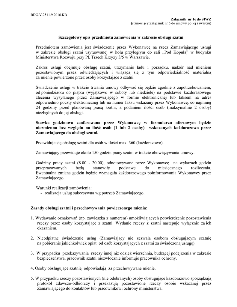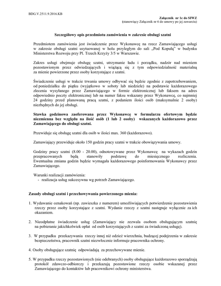 BDG.V.2511.9.2016.KB Załącznik nr 1c do SIWZ (stanowiący Załącznik nr 6 do umowy po jej zawarciu) Szczegółowy opis przedmiotu zamówienia w zakresie obsługi szatni Przedmiotem zamówienia jest świadczenie przez Wykonawcę na rzecz Zamawiającego usługi w zakresie obsługi szatni usytuowanej w holu przyległym do sali „Pod Kopułą” w budynku Ministerstwa Rozwoju przy Pl. Trzech Krzyży 3/5 w Warszawie. Zakres usługi obejmuje obsługę szatni, utrzymanie ładu i porządku, nadzór nad mieniem pozostawionym przez odwiedzających i wiążącą się z tym odpowiedzialność materialną za mienie powierzone przez osoby korzystające z szatni. Świadczenie usługi w trakcie trwania umowy odbywać się będzie zgodnie z zapotrzebowaniem, od poniedziałku do piątku (wyjątkowo w soboty lub niedziele) na podstawie każdorazowego zlecenia wysyłanego przez Zamawiającego w formie elektronicznej lub faksem na adres odpowiednio poczty elektronicznej lub na numer faksu wskazany przez Wykonawcę, co najmniej 24 godziny przed planowaną pracą szatni, z podaniem ilości osób (maksymalnie 2 osoby) niezbędnych do jej obsługi. Stawka godzinowa zaoferowana przez Wykonawcę w formularzu ofertowym będzie niezmienna bez względu na ilość osób (1 lub 2 osoby) wskazanych każdorazowo przez Zamawiającego do obsługi szatni. Przewiduje się obsługę szatni dla osób w ilości max. 360 (każdorazowo). Zamawiający przewiduje około 150 godzin pracy szatni w trakcie obowiązywania umowy. Godziny pracy szatni (8.00 - 20.00), odnotowywane przez Wykonawcę na wykazach godzin przepracowanych będą stanowiły podstawę do miesięcznego rozliczenia. Ewentualna zmiana godzin będzie wymagała każdorazowego poinformowania Wykonawcy przez Zamawiającego. Warunki realizacji zamówienia: - realizacja usług sukcesywna wg potrzeb Zamawiającego. Zasady obsługi szatni i przechowywania powierzonego mienia: 1. Wydawanie oznakowań (np. zawieszka z numerem) umożliwiających potwierdzenie pozostawienia rzeczy przez osoby korzystające z szatni. Wydanie rzeczy z szatni następuje wyłącznie za ich okazaniem. 2. Nieodpłatne świadczenie usług (Zamawiający nie zezwala osobom obsługującym szatnię na pobieranie jakichkolwiek opłat od osób korzystających z szatni za świadczoną usługę). 3. W przypadku przekazywania rzeczy innej niż odzież wierzchnia, budzącej podejrzenia w zakresie bezpieczeństwa, pracownik szatni niezwłocznie informuje pracownika ochrony. 4. Osoby obsługujące szatnię odpowiadają za przechowywane mienie. 5. W przypadku rzeczy pozostawionych (nie odebranych) osoby obsługujące każdorazowo sporządzają protokół zdawczo-odbiorczy i przekazują pozostawione rzeczy osobie wskazanej przez Zamawiającego do kontaktów lub pracownikowi ochrony ministerstwa. BDG.V.2511.9.2016.KB 6. W przypadku zagubienia przywieszki i żądania wydania przechowywanych rzeczy, osoba obsługująca szatnię jest zobowiązana do: a) przystąpienia do dalszych czynności osoby pełniącej rolę świadka zdarzenia, b) poinformowania Zamawiającego o zdarzeniu, c) uprawdopodobnienia faktu pozostawienia rzeczy poprzez rozmowę z osobą żądającą ich wydania dotyczącej cech charakterystycznych rzeczy, d) sporządzenia raportu z wydania rzeczy bez zwrotu przywieszki, zawierającego czas wydania, dane osobowe świadka, pracownika ochrony oraz osoby żądającej wydania rzeczy z uwzględnieniem informacji o dokumentach potwierdzających jej tożsamość. 7. Osoby obsługujące szatnię będą posiadać: - stały estetyczny (jednolity) ubiór (biała bluzka/koszula zapinana pod szyją oraz spodnie/spódnica w kolorze czarnym lub granatowym, w przypadku spódnicy wymagana długość nie krótsza niż 5 cm nad kolanem), - wysoką kulturę osobistą.