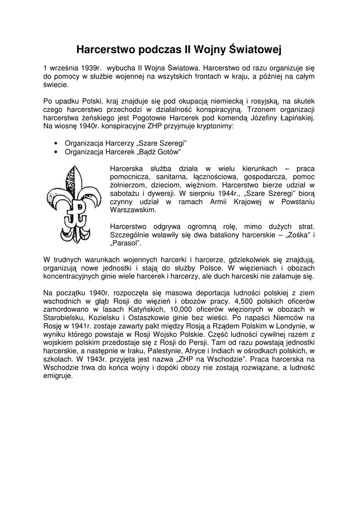 Harcerstwo podczas II Wojny Światowej 1 września 1939r. wybucha II Wojna Światowa. Harcerstwo od razu organizuje się do pomocy w służbie wojennej na wszytskich frontach w kraju, a później na całym świecie. Po upadku Polski, kraj znajduje się pod okupacją niemiecką i rosyjską, na skutek czego harcerstwo przechodzi w działalność konspiracyjną. Trzonem organizacji harcerstwa żeńskiego jest Pogotowie Harcerek pod komendą Józefiny Łapińskiej. Na wiosnę 1940r. konspiracyjne ZHP przyjmuje kryptonimy: • • Organizacja Harcerzy „Szare Szeregi” Organizacja Harcerek „Bądź Gotów” Harcerska służba działa w wielu kierunkach – praca pomocnicza, sanitarna, łącznościowa, gospodarcza, pomoc żołnierzom, dzieciom, więźniom. Harcerstwo bierze udział w sabotażu i dywersji. W sierpniu 1944r., „Szare Szeregi” biorą czynny udział w ramach Armii Krajowej w Powstaniu Warszawskim. Harcerstwo odgrywa ogromną rolę, mimo dużych strat. Szczególnie wsławiły się dwa bataliony harcerskie – „Zośka” i „Parasol”. W trudnych warunkach wojennych harcerki i harcerze, gdziekolwiek się znajdują, organizują nowe jednostki i stają do służby Polsce. W więzieniach i obozach koncentracyjnych ginie wiele harcerek i harcerzy, ale duch harceski nie załamuje się. Na początku 1940r. rozpoczęła się masowa deportacja ludności polskiej z ziem wschodnich w głąb Rosji do więzień i obozów pracy. 4,500 polskich oficerów zamordowano w lasach Katyńskich, 10,000 oficerów więzionych w obozach w Starobielsku, Kozielsku i Ostaszkowie ginie bez wieści. Po napaści Niemców na Rosję w 1941r. zostaje zawarty pakt między Rosją a Rządem Polskim w Londynie, w wyniku którego powstaje w Rosji Wojsko Polskie. Część ludności cywilnej razem z wojskiem polskim przedostaje się z Rosji do Persji. Tam od razu powstają jednostki harcerskie, a następnie w Iraku, Palestynie, Afryce i Indiach w ośrodkach polskich, w szkołach. W 1943r. przyjęta jest nazwa „ZHP na Wschodzie”. Praca harcerska na Wschodzie trwa do końca wojny i dopóki obozy nie zostają rozwiązane, a ludność emigruje. 1944 Zuchy w Afryce