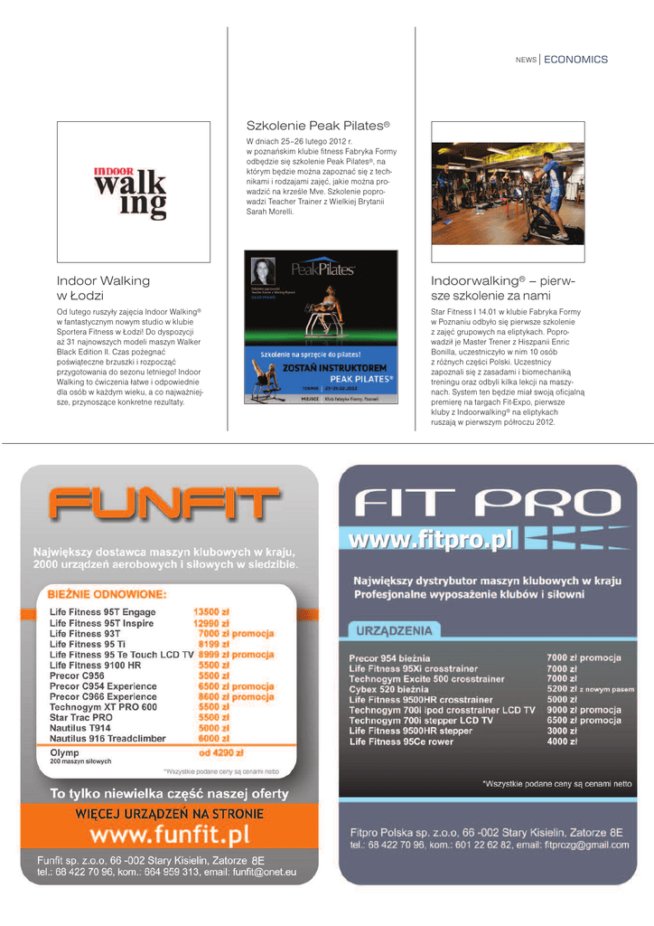 NEWS ECONOMICS Szkolenie Peak Pilates® W dniach 25–26 lutego 2012 r. w poznańskim klubie fitness Fabryka Formy odbędzie się szkolenie Peak Pilates®, na którym będzie można zapoznać się z technikami i rodzajami zajęć, jakie można prowadzić na krześle Mve. Szkolenie poprowadzi Teacher Trainer z Wielkiej Brytanii Sarah Morelli. Indoor Walking w Łodzi Indoorwalking® – pierwsze szkolenie za nami Od lutego ruszyły zajęcia Indoor Walking® w fantastycznym nowym studio w klubie Sportera Fitness w Łodzi! Do dyspozycji aż 31 najnowszych modeli maszyn Walker Black Edition II. Czas pożegnać poświąteczne brzuszki i rozpocząć przygotowania do sezonu letniego! Indoor Walking to ćwiczenia łatwe i odpowiednie dla osób w każdym wieku, a co najważniejsze, przynoszące konkretne rezultaty. Star Fitness I 14.01 w klubie Fabryka Formy w Poznaniu odbyło się pierwsze szkolenie z zajęć grupowych na eliptykach. Poprowadził je Master Trener z Hiszpanii Enric Bonilla, uczestniczyło w nim 10 osób z różnych części Polski. Uczestnicy zapoznali się z zasadami i biomechaniką treningu oraz odbyli kilka lekcji na maszynach. System ten będzie miał swoją oficjalną premierę na targach Fit-Expo, pierwsze kluby z Indoorwalking® na eliptykach ruszają w pierwszym półroczu 2012. ECONOMICS NEWS Szkolenia z Open Mind OM I Mazowiecki oddział szkoły Open Mind zaprasza na szkolenia do Warszawy. Sebastian Obirek poprowadzi szkolenie OM BASIC AEROBIK® 25–26.02 oraz OM BASIC BODY® 24–25.03. W kwietniu natomiast przewidziane są następujące szkolenia: 14–15.04 OM FFK Fitness Fight Kick® (Przemek Widyna), 27.04 warsztaty Aerobik Instruktor oraz 28–29.04 OM BASIC STEP® (Sebastian Obirek). Edukacja w programie Spinning® Star Fitness I Program Spinning® oferuje dwa rodzaje szkoleń: szkolenie podstawowe Spinning® Clinic i Spinning® Continuing Education. Spinning® Clinic to podstawowe dwudniowe szkolenie, po którym zdobywa się uprawnienia do prowadzenia zajęć Spinning® we wszystkich Oficjalnych Centrach Spinning® w kraju i na świecie. Szkolenia Continiuing Education są to tematyczne warsztaty, uczestnictwo w nich pozwala na poszerzenie wiedzy teoretycznej w zakresie prowadzenia zajęć Spinning®. Szkolenia te dostępne są w dwóch wariantach – jako warsztaty stacjonarne lub warsztaty online. Wysoka popularność zajęć Spinning® w klubach fitness sprawia, że ukończenie szkolenia Spinning® Clinic otwiera możliwość zdobycia atrakcyjnej – dającej ogromną satysfakcję pracy. Szeroka oferta szkoleń CED pozwala na podniesienie umiejętności instruktorskich, poszerzenie wiedzy, wymianę doświadczeń z innymi instruktorami, zdobycie inspiracji i świeżych pomysłów do prowadzenia zajęć. 64 body LIFE 1I 2012 NEWS Targi, szkolenia, życie klubowe Międzynarodowa Konwencja EFS EFS I 25–26.03 Euro Fitness Star Convention & Education w Bielsku-Białej to przede wszystkim imponująca liczba doskonałych zagranicznych prezenterów: Julio Papi (Hiszpania), David Stauffer (USA), Katia Vasilenko (Rosja), Jannie Lindeque (RPA), Sascha Antoniutti (Włochy), Taras Klimov (Rosja) oraz Marta Wawszczyk, Małgorzata Grzybowska i Kaja Delewska. W programie Aerobic, Jazz, House Dance, Step, Athletic Functional Training, Trio, Bootcam, Yoga Fitness, Yoga Body Workout, Pilates, Fitbox, IO Ball, Power Barbell, Portdebras®, TBC oraz Indoor Walking®, a do tego uzupełniające, twórcze warsztaty szkoleniowe Pilates, 100% Muscle, Aerobic Dance, Step Advanced, TBC. SPRING FITNESS FESTIVAL IFAA Polska | Prawie trzydzieści godzin czystego fitnessu w trzech salach i na basenie, których wspólnym mianownikiem jest nowoczesna edukacja i duża dawka dobrej energii, oferują w dniach 10–11 marca br. Akademia IFAA i Ośrodek Biznesowo-Rekreacyjny STACJA NOWA GDYNIA w Zgierzu. Na profesjonalistów i amatorów czeka bogaty program lekcji aerobiku, stepu, dance. Uzupełnią go warsztaty z różnych form wzmacniających oraz body&mind, w tym: Pilates, Power Dumbell, Flexi Bar, Ovoball, Bosu, Vinyasa Power Yoga. Ponadto lekcje indoor cycling i aqua. W tej wiosennej konwencji fitness, która przyciąga doskonałym programem, ale i niezwykłym, malowniczym miejscem, jakim jest ośrodek Stacja Nowa Gdynia, bierze co roku udział prawie 280 osób. Swoje lekcje zaprezentuje tym razem prawie cały team Akademii IFAA, a także polscy i zagraniczni goście, wśród nich Christiane Reiter, Lionel Obringer, Viola Bayer. www.bodylife.com.pl