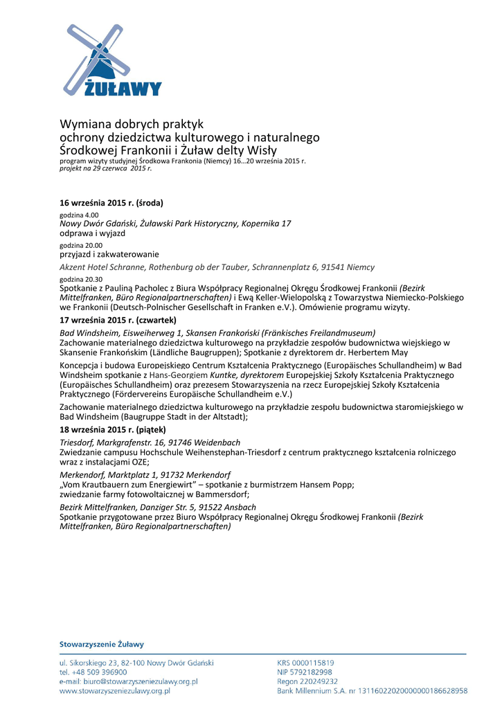 Wymiana dobrych praktyk ochrony dziedzictwa kulturowego i naturalnego Środkowej Frankonii i Żuław delty Wisły program wizyty studyjnej Środkowa Frankonia (Niemcy) 16…20 września 2015 r. projekt na 29 czerwca 2015 r. 16 września 2015 r. (środa) godzina 4.00 Nowy Dwór Gdański, Żuławski Park Historyczny, Kopernika 17 odprawa i wyjazd godzina 20.00 przyjazd i zakwaterowanie Akzent Hotel Schranne, Rothenburg ob der Tauber, Schrannenplatz 6, 91541 Niemcy godzina 20.30 Spotkanie z Pauliną Pacholec z Biura Współpracy Regionalnej Okręgu Środkowej Frankonii (Bezirk Mittelfranken, Büro Regionalpartnerschaften) i Ewą Keller-Wielopolską z Towarzystwa Niemiecko-Polskiego we Frankonii (Deutsch-Polnischer Gesellschaft in Franken e.V.). Omówienie programu wizyty. 17 września 2015 r. (czwartek) Bad Windsheim, Eisweiherweg 1, Skansen Frankoński (Fränkisches Freilandmuseum) Zachowanie materialnego dziedzictwa kulturowego na przykładzie zespołów budownictwa wiejskiego w Skansenie Frankońskim (Ländliche Baugruppen); Spotkanie z dyrektorem dr. Herbertem May Koncepcja i budowa Europejskiego Centrum Kształcenia Praktycznego (Europäisches Schullandheim) w Bad Windsheim spotkanie z Hans-Georgiem Kuntke, dyrektorem Europejskiej Szkoły Kształcenia Praktycznego (Europäisches Schullandheim) oraz prezesem Stowarzyszenia na rzecz Europejskiej Szkoły Kształcenia Praktycznego (Fördervereins Europäische Schullandheim e.V.) Zachowanie materialnego dziedzictwa kulturowego na przykładzie zespołu budownictwa staromiejskiego w Bad Windsheim (Baugruppe Stadt in der Altstadt); 18 września 2015 r. (piątek) Triesdorf, Markgrafenstr. 16, 91746 Weidenbach Zwiedzanie campusu Hochschule Weihenstephan-Triesdorf z centrum praktycznego kształcenia rolniczego wraz z instalacjami OZE; Merkendorf, Marktplatz 1, 91732 Merkendorf „Vom Krautbauern zum Energiewirt” – spotkanie z burmistrzem Hansem Popp; zwiedzanie farmy fotowoltaicznej w Bammersdorf; Bezirk Mittelfranken, Danziger Str. 5, 91522 Ansbach Spotkanie przygotowane przez Biuro Współpracy Regionalnej Okręgu Środkowej Frankonii (Bezirk Mittelfranken, Büro Regionalpartnerschaften) 19 września 2015 r. (sobota) Bad Windsheim, Eisweiherweg 1, Skansen Frankoński (Fränkisches Freilandmuseum) Uczestniczenie w Festiwalu Jesiennym (Herbstfest) w Skansenie Frankońskim czas wolny Rothenburg ob der Tauber 20 września 2015 r. (niedziela) godzina 9.00 wyjazd do Nowego Dworu Gdańskiego godzina 24.00 Nowy Dwór Gdański, Żuławski Park Historyczny, Kopernika 17 przyjazd do Nowego Dworu Gdańskiego Projekt „Wymiana dobrych praktyk ochrony dziedzictwa kulturowego i naturalnego Środkowej Frankonii i Żuław delty Wisły” jest realizowany przez Stowarzyszenie Żuławy w partnerstwie z Biurem Współpracy Regionalnej Okręgu Środkowej Frankonii (Bezirk Mittelfranken, Büro Regionalpartnerschaften), Departamentem Rozwoju Gospodarczego Urzędu Marszałkowskiego Województwa Pomorskiego, Skansenem Frankońskim (Fränkisches Freilandmuseum), Towarzystwem Niemiecko-Polskim we Frankonii (Deutsch-Polnischer Gesellschaft in Franken e.V.) i współfinansowany przez Fundację Współpracy Polsko-Niemieckiej