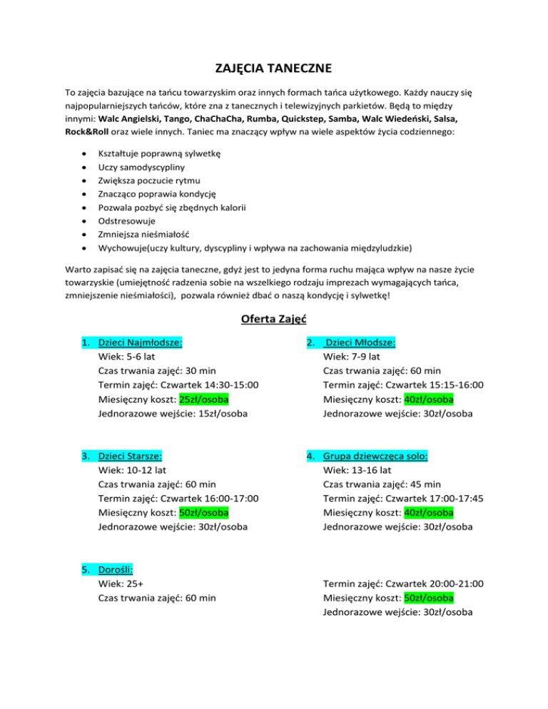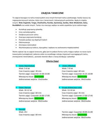 ZAJĘCIA TANECZNE To zajęcia bazujące na tańcu towarzyskim oraz innych formach tańca użytkowego. Każdy nauczy się najpopularniejszych tańców, które zna z tanecznych i telewizyjnych parkietów. Będą to między innymi: Walc Angielski, Tango, ChaChaCha, Rumba, Quickstep, Samba, Walc Wiedeński, Salsa, Rock&Roll oraz wiele innych. Taniec ma znaczący wpływ na wiele aspektów życia codziennego: Kształtuje poprawną sylwetkę Uczy samodyscypliny Zwiększa poczucie rytmu Znacząco poprawia kondycję Pozwala pozbyć się zbędnych kalorii Odstresowuje Zmniejsza nieśmiałość Wychowuje(uczy kultury, dyscypliny i wpływa na zachowania międzyludzkie) Warto zapisać się na zajęcia taneczne, gdyż jest to jedyna forma ruchu mająca wpływ na nasze życie towarzyskie (umiejętność radzenia sobie na wszelkiego rodzaju imprezach wymagających tańca, zmniejszenie nieśmiałości), pozwala również dbać o naszą kondycję i sylwetkę! Oferta Zajęć 1. Dzieci Najmłodsze: Wiek: 5-6 lat Czas trwania zajęć: 30 min Termin zajęć: Czwartek 14:30-15:00 Miesięczny koszt: 25zł/osoba Jednorazowe wejście: 15zł/osoba 2. Dzieci Młodsze: Wiek: 7-9 lat Czas trwania zajęć: 60 min Termin zajęć: Czwartek 15:15-16:00 Miesięczny koszt: 40zł/osoba Jednorazowe wejście: 30zł/osoba 3. Dzieci Starsze: Wiek: 10-12 lat Czas trwania zajęć: 60 min Termin zajęć: Czwartek 16:00-17:00 Miesięczny koszt: 50zł/osoba Jednorazowe wejście: 30zł/osoba 4. Grupa dziewczęca solo: Wiek: 13-16 lat Czas trwania zajęć: 45 min Termin zajęć: Czwartek 17:00-17:45 Miesięczny koszt: 40zł/osoba Jednorazowe wejście: 30zł/osoba 5. Dorośli: Wiek: 25+ Czas trwania zajęć: 60 min Termin zajęć: Czwartek 20:00-21:00 Miesięczny koszt: 50zł/osoba Jednorazowe wejście: 30zł/osoba Jakie możliwości mamy dzięki zajęciom tanecznym: Poznanie podstawowych kroków i w dalszym etapie bardziej rozwiniętych układów do najpopularniejszych tańców użytkowych. Możliwość przygotowania do pokazów tanecznych i uświetnianie swoimi występami uroczystości, festynów, bali. Możliwość startu na turniejach tańca i rywalizacja na prawdziwym tanecznym parkiecie Możliwość uczestnictwa w obozach taneczno-rekreacyjnych odbywających się zarówno latem, jak i zimą. Ogromna satysfakcja i zdanie sobie sprawy ze swoich możliwości i potencjału!!! Co należy zabrać na pierwsze zajęcia: Wygodne buty (najlepiej sportowe) Wygodny strój (koszulka, spodnie dresowe) Butelkę wody lub soku Zajęcia odbywają się w sali korekcyjnej Gminnego Centrum Kultury, Sportu i Rekreacji w Szemudzie. Na zajęciach nie jest wymagany partner!!! Za miesiąc zajęć należy rozliczyć się na pierwszych zajęciach w danym miesiącu. W przypadku pojedynczych wejść, płatności dokonujemy przed rozpoczęciem zajęć. KONTAKT [email protected] Tel. 697-058-409