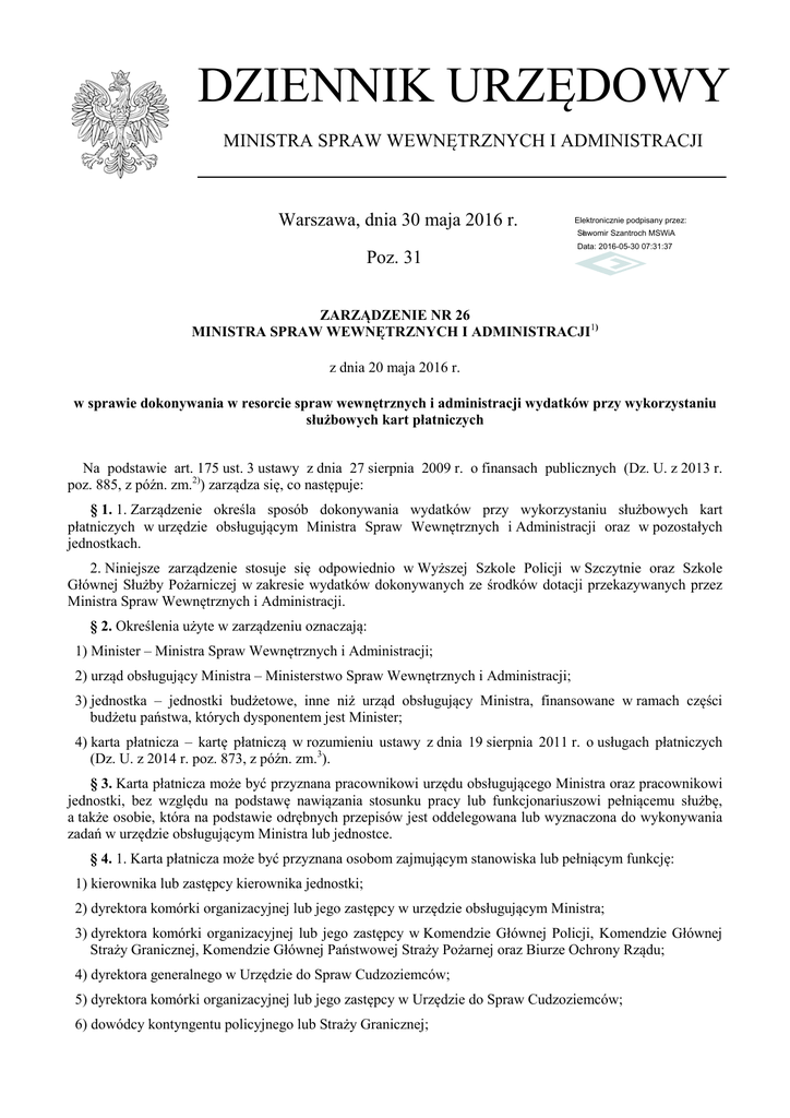 DZIENNIK URZĘDOWY MINISTRA SPRAW WEWNĘTRZNYCH I ADMINISTRACJI Warszawa, dnia 30 maja 2016 r. Elektronicznie podpisany przez: Sławomir Szantroch MSWiA Poz. 31 Data: 2016-05-30 07:31:37 ZARZĄDZENIE NR 26 MINISTRA SPRAW WEWNĘTRZNYCH I ADMINISTRACJI1) z dnia 20 maja 2016 r. w sprawie dokonywania w resorcie spraw wewnętrznych i administracji wydatków przy wykorzystaniu służbowych kart płatniczych Na podstawie art. 175 ust. 3 ustawy z dnia 27 sierpnia 2009 r. o finansach publicznych (Dz. U. z 2013 r. poz. 885, z późn. zm.2)) zarządza się, co następuje: § 1. 1. Zarządzenie określa sposób dokonywania wydatków przy wykorzystaniu służbowych kart płatniczych w urzędzie obsługującym Ministra Spraw Wewnętrznych i Administracji oraz w pozostałych jednostkach. 2. Niniejsze zarządzenie stosuje się odpowiednio w Wyższej Szkole Policji w Szczytnie oraz Szkole Głównej Służby Pożarniczej w zakresie wydatków dokonywanych ze środków dotacji przekazywanych przez Ministra Spraw Wewnętrznych i Administracji. § 2. Określenia użyte w zarządzeniu oznaczają: 1) Minister – Ministra Spraw Wewnętrznych i Administracji; 2) urząd obsługujący Ministra – Ministerstwo Spraw Wewnętrznych i Administracji; 3) jednostka – jednostki budżetowe, inne niż urząd obsługujący Ministra, finansowane w ramach części budżetu państwa, których dysponentem jest Minister; 4) karta płatnicza – kartę płatniczą w rozumieniu ustawy z dnia 19 sierpnia 2011 r. o usługach płatniczych (Dz. U. z 2014 r. poz. 873, z późn. zm.3). § 3. Karta płatnicza może być przyznana pracownikowi urzędu obsługującego Ministra oraz pracownikowi jednostki, bez względu na podstawę nawiązania stosunku pracy lub funkcjonariuszowi pełniącemu służbę, a także osobie, która na podstawie odrębnych przepisów jest oddelegowana lub wyznaczona do wykonywania zadań w urzędzie obsługującym Ministra lub jednostce. § 4. 1. Karta płatnicza może być przyznana osobom zajmującym stanowiska lub pełniącym funkcję: 1) kierownika lub zastępcy kierownika jednostki; 2) dyrektora komórki organizacyjnej lub jego zastępcy w urzędzie obsługującym Ministra; 3) dyrektora komórki organizacyjnej lub jego zastępcy w Komendzie Głównej Policji, Komendzie Głównej Straży Granicznej, Komendzie Głównej Państwowej Straży Pożarnej oraz Biurze Ochrony Rządu; 4) dyrektora generalnego w Urzędzie do Spraw Cudzoziemców; 5) dyrektora komórki organizacyjnej lub jego zastępcy w Urzędzie do Spraw Cudzoziemców; 6) dowódcy kontyngentu policyjnego lub Straży Granicznej; Dziennik Urzędowy Ministra Spraw Wewnętrznych i Administracji –2– Poz. 31 7) oficera łącznikowego Policji lub Straży Granicznej w polskich przedstawicielstwach dyplomatycznych; 8) dowódcy, zastępcy dowódcy lub oficera łącznikowego grupy ratowniczej Państwowej Straży Pożarnej. 2. Karta płatnicza może być wydana lub przyznana innym osobom, niż określone w ust. 1, jeżeli w związku z zajmowanym stanowiskiem lub wykonywanymi obowiązkami służbowymi dokonują one wydatków, o których mowa w § 8 ust. 1, oraz jeżeli płatności nie mogą być dokonywane w innej formie bezgotówkowej, z zastrzeżeniem ust. 3. 3. Warunek, o którym mowa w ust. 2, nie dotyczy płatności związanych z finansową obsługą realizacji zadań poza granicami kraju, w szczególności polegających na udziale w międzynarodowych akcjach ratowniczych oraz wspólnych działaniach. 4. Jeżeli częstotliwość dokonywania wydatków przez osoby, o których mowa w ust. 1 i 2, nie uzasadnia wydania lub przyznania im karty płatniczej, a zachodzi konieczność ich dokonania lub potwierdzenia płatności przy wykorzystaniu karty płatniczej, płatności lub potwierdzenia może dokonać inna osoba, za pomocą przyznanej jej karty płatniczej, z zachowaniem pozostałych wymogów wynikających z zarządzenia. § 5. 1. Osoby, o których mowa w § 4, w celu otrzymania kart płatniczych składają, z zastrzeżeniem ust. 2-4, wniosek o jej przyznanie do kierownika jednostki. Wniosek składa się za pośrednictwem bezpośredniego przełożonego, chyba że bezpośrednim przełożonym jest kierownik jednostki. 2. Kierownik jednostki składa wniosek o wyrażenie zgody na korzystanie z karty płatniczej do kierownika jednostki nadrzędnej. Wnioski kierowane do Ministra rozpatruje odpowiednio sekretarz lub podsekretarz stanu w urzędzie obsługującym Ministra, właściwy w zakresie spraw wynikających z nadzoru Ministra nad wnioskodawcą lub ze stosunku podległości wobec Ministra. 3. Osoby, o których mowa w § 4 ust. 1 pkt 2 i 5, składają wniosek o przyznanie karty płatniczej do dyrektora generalnego urzędu. 4. Osoby, o których mowa w § 4 ust. 1 pkt 6-8, składają wniosek o przyznanie karty płatniczej odpowiednio do Komendanta Głównego Policji, Komendanta Głównego Straży Granicznej albo Komendanta Głównego Państwowej Straży Pożarnej. 5. Wniosek o przyznanie karty płatniczej powinien zawierać następujące dane: imię i nazwisko wnioskodawcy, zajmowane stanowisko służbowe lub pełnioną funkcję, nazwę jednostki organizacyjnej, wysokość miesięcznego limitu wydatków, okres użytkowania karty płatniczej oraz rodzaje wydatków, które będą dokonywane przy jej użyciu, a także uzasadnienie potrzeby posiadania karty płatniczej oraz wnioskowanej wysokości miesięcznego limitu wydatków. § 6. 1. Podstawę wydania karty płatniczej osobie, której przyznano prawo do jej użytkowania w trybie określonym w § 5, stanowi, z zastrzeżeniem ust. 3 i 4, umowa w sprawie korzystania z karty płatniczej zawarta pomiędzy tą osobą a właściwym kierownikiem jednostki albo dyrektorem generalnym urzędu, zawierająca w szczególności: 1) dane, o których mowa w § 5 ust. 5; 2) określenie zakresu upoważnienia do zaciągania zobowiązań, udzielonego użytkownikowi karty przez kierownika jednostki; 3) pouczenie o odpowiedzialności 
