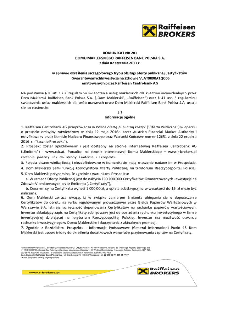 1. Raiffeisen Centrobank AG przeprowadza w Polsce ofertę publiczną koszyk (''Oferta Publiczna'') w oparciu