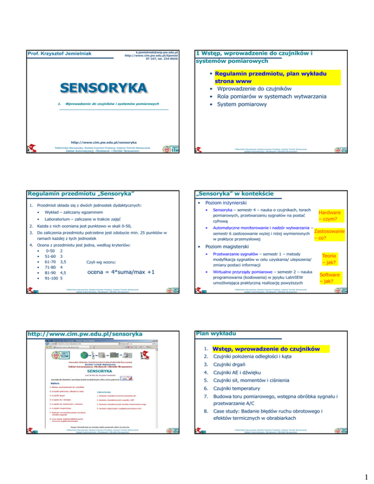 Prof. Krzysztof Jemielniak [email protected] http://www.cim.pw.edu.pl/kjemiel ST 107, tel. 234 8656 1 Wstęp, wprowadzenie do czujników i systemów pomiarowych • Regulamin Regulamin przedmiotu, plan wykładu, strona przedmiotu, plan wykładu www www strona • Wprowadzenie do czujników • Rola pomiarów w systemach wytwarzania • System pomiarowy SENSORYKA 1. Wprowadzenie do czujników i systemów pomiarowych http://www.cim.pw.edu.pl/sensoryka Politechnika Warszawska, Wydział Inżynierii Produkcji, Instytut Technik Wytwarzania Politechnika Warszawska, Wydział Inżynierii Produkcji, Instytut Technik Wytwarzania Zakład Automatyzacji, Obrabiarek i Obróbki Skrawaniem Zakład Automatyzacji, Obrabiarek i Obróbki Skrawaniem Regulamin przedmiotu „Sensoryka” „Sensoryka” w kontekście • 1. Przedmiot składa się z dwóch jednostek dydaktycznych: • Wykład – zaliczany egzaminem • Laboratorium – zaliczane w trakcie zajęć 2. Każda z nich oceniana jest punktowo w skali 0-50, Poziom inżynierski • Sensoryka – semestr 4 – nauka o czujnikach, torach pomiarowych, przetwarzaniu sygnałów na postać cyfrową • Automatyczne monitorowanie i nadzór wytwarzania – Zastosowanie semestr 6 zastosowanie wyżej i niżej wymienionych – co? w praktyce przemysłowej 3. Do zaliczenia przedmiotu potrzebne jest zdobycie min. 25 punktów w ramach każdej z tych jednostek 4. Ocena z przedmiotu jest jedna, według kryteriów: • 0-50 2 • 51-60 3 • 61-70 3,5 Czyli wg wzoru: • 71-80 4 ocena = 4*suma/max • 81-90 4,5 • 91-100 5 • +1 Poziom magisterski • Przetwarzanie sygnałów – semestr 1 – metody modyfikacja sygnałów w celu uzyskania/ ulepszenia/ zmiany postaci informacji Teoria – jak? • Wirtualne przyrządy pomiarowe – semestr 2 – nauka programowania (kodowania) w języku LabVIEW umożliwiająca praktyczną realizację powyższych Software – jak? Politechnika Warszawska, Wydział Inżynierii Produkcji, Instytut Technik Wytwarzania Politechnika Warszawska, Wydział Inżynierii Produkcji, Instytut Technik Wytwarzania Zakład Automatyzacji, Obrabiarek i Obróbki Skrawaniem http://www.cim.pw.edu.pl/sensoryka Hardware – czym? Zakład Automatyzacji, Obrabiarek i Obróbki Skrawaniem Plan wykładu 1. Wstęp, Wstęp, wprowadzenie do czujników wprowadzenie do czujników Politechnika Warszawska, Wydział Inżynierii Produkcji, Instytut Technik Wytwarzania Zakład Automatyzacji, Obrabiarek i Obróbki Skrawaniem 2. Czujniki położenia odległości i kąta 3. Czujniki drgań 4. Czujniki AE i dźwięku 5. Czujniki sił, momentów i ciśnienia 6. Czujniki temperatury 7. Budowa toru pomiarowego, wstępna obróbka sygnału i przetwarzanie A/C 8. Case study: Badanie błędów ruchu obrotowego i efektów termicznych w obrabiarkach Politechnika Warszawska, Wydział Inżynierii Produkcji, Instytut Technik Wytwarzania Zakład Automatyzacji, Obrabiarek i Obróbki Skrawaniem 1 1 Wstęp, wprowadzenie do czujników i systemów pomiarowych • Plan wykładu, regulamin przedmiotu, strona www • Wprowadzenie Wprowadzenie dodo czujników czujników • Rola pomiarów w systemach wytwarzania • System pomiarowy Wszystko zaczyna się od zmysłów „Nie ma nic w umyśle, czego nie byłoby przedtem w zmysłach” Św. Tomasz z Akwinu (1221-1274) “Wszelka nasza wiedza ma początek w naszych zmysłach” Leonardo da Vinci (1452-1519) Postrzeganie zmysłowe jest procesem uświadamiania sobie lub rozumienia informacji docierających z narządów środowisko / otoczenie Politechnika Warszawska, Wydział Inżynierii Produkcji, Instytut Technik Wytwarzania wzrok jest naszym najważniejszym zmysłem, dostarczającym nam najwięcej informacji, ale... zmysły / czujniki odczucia / sygnały mózg / komputer reakcje wiedza, efekty działań Politechnika Warszawska, Wydział Inżynierii Produkcji, Instytut Technik Wytwarzania Zakład Automatyzacji, Obrabiarek i Obróbki Skrawaniem Homocentryczne widzenie świata zjawiska, wielkości fizyczne Zakład Automatyzacji, Obrabiarek i Obróbki Skrawaniem Typy czujników Istnieje ogromna liczba typów czujników owady mają dwoje oczu po powiedzmy 10,000 elementów światłoczułych w każdym wiele wykrywa zjawiska, których człowiek nie może wykryć np. magnetyzm, podczerwień, ultrafiolet, ultradźwięki, faza światła itd. umiemy posługiwać się dotykiem, ale... karaluchy mają 30,000 włosków czułych na ruch powietrza na każdej nodze mogą wyczuć zbliżające się obiekty bez dotykania ich Omówimy tu tylko część z nich, zwłaszcza te, które mogą znaleźć zastosowanie podobnie jest z innymi zmysłami systemach wytwarzania Świat oferuje znacznie więcej informacji niż my jesteśmy w stanie postrzegać zmysłami Politechnika Warszawska, Wydział Inżynierii Produkcji, Instytut Technik Wytwarzania Politechnika Warszawska, Wydział Inżynierii Produkcji, Instytut Technik Wytwarzania Zakład Automatyzacji, Obrabiarek i Obróbki Skrawaniem Czujnik – przetwornik Typy czujników Przetwornik przekształca jedną wielkość fizyczną jak temperatura, siła, ciśnienie, prędkość itd., na inną, najczęściej elektryczną jak napięcie lub opór Wielkość fizyczna przetwornik opór, napięcie Czujnik to urządzenie, zawierające obudowany przetwornik, przewody odprowadzające sygnał itp. Czujnik drgań (akcelerometr) masa sejsmiczna Zakład Automatyzacji, Obrabiarek i Obróbki Skrawaniem przetwornik piezoelektryczny Wyróżniamy sześć podstawowych typów czujników (przetworników) z punktu widzenia mierzonych sygnałów i form energii przetwarzanej przez nie: • mechaniczne • termiczne (energia kinetyczna atomów lub cząsteczek) • elektryczne • magnetyczne • radiacyjne (włączając fale elektromagnetyczne, mikrofale itd.) • chemiczne obudowa badany element sygnał Politechnika Warszawska, Wydział Inżynierii Produkcji, Instytut Technik Wytwarzania Zakład Automatyzacji, Obrabiarek i Obróbki Skrawaniem Politechnika 