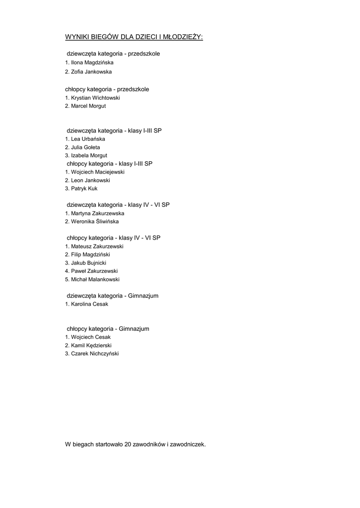 WYNIKI BIEGÓW DLA DZIECI I MŁODZIEŻY: dziewczęta kategoria - przedszkole 1. Ilona Magdzińska 2. Zofia Jankowska chłopcy kategoria - przedszkole 1. Krystian Wichtowski 2. Marcel Morgut dziewczęta kategoria - klasy I-III SP 1. Lea Urbańska 2. Julia Gołeta 3. Izabela Morgut chłopcy kategoria - klasy I-III SP 1. Wojciech Maciejewski 2. Leon Jankowski 3. Patryk Kuk dziewczęta kategoria - klasy IV - VI SP 1. Martyna Zakurzewska 2. Weronika Śliwińska chłopcy kategoria - klasy IV - VI SP 1. Mateusz Zakurzewski 2. Filip Magdziński 3. Jakub Bujnicki 4. Paweł Zakurzewski 5. Michał Malankowski dziewczęta kategoria - Gimnazjum 1. Karolina Cesak chłopcy kategoria - Gimnazjum 1. Wojciech Cesak 2. Kamil Kędzierski 3. Czarek Nichczyński W biegach startowało 20 zawodników i zawodniczek.