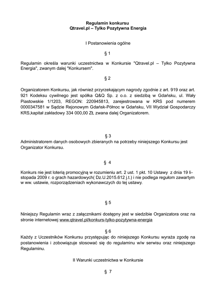 Regulamin konkursu Qtravel.pl – Tylko Pozytywna Energia I Postanowienia ogólne §1 Regulamin określa warunki uczestnictwa w Konkursie "Qtravel.pl – Tylko Pozytywna Energia", zwanym dalej "Konkursem". §2 Organizatorem Konkursu, jak również przyrzekającym nagrody zgodnie z art. 919 oraz art. 921 Kodeksu cywilnego jest spółka Q&Q Sp. z o.o. z siedzibą w Gdańsku, ul. Wały Piastowskie 1/1203, REGON: 220945813, zarejestrowana w KRS pod numerem 0000347581 w Sądzie Rejonowym Gdańsk-Północ w Gdańsku, VII Wydział Gospodarczy KRS,kapitał zakładowy 334 000,00 ZŁ zwana dalej Organizatorem. §3 Administratorem danych osobowych zbieranych na potrzeby niniejszego Konkursu jest Organizator Konkursu. § 4 Konkurs nie jest loterią promocyjną w rozumieniu art. 2 ust. 1 pkt. 10 Ustawy z dnia 19 listopada 2009 r. o grach hazardowych( Dz.U.2015.612 j.t.) i nie podlega regułom zawartym w ww. ustawie, rozporządzeniach wykonawczych do tej ustawy. §5 Niniejszy Regulamin wraz z załącznikami dostępny jest w siedzibie Organizatora oraz na stronie internetowej www.qtravel.pl/konkurs-tylko-pozytywna-energia §6 Każdy z Uczestników Konkursu przystępując do niniejszego Konkursu wyraża zgodę na postanowienia i zobowiązuje stosować się do regulaminu w/w serwisu oraz niniejszego Regulaminu. II Warunki uczestnictwa w Konkursie § 7 Uczestnikiem Konkursu może być każda osoba pełnoletnia, która spełnia pozostałe warunki niniejszego regulaminu, zamieszkała na terytorium Rzeczypospolitej Polskiej, posiadająca osobiste konto w serwisie Facebook i/lub w serwisie Instagram. §8 Z udziału w Konkursie wyklucza się: • pracowników Organizatora, w tym osoby świadczące usługi na rzecz Organizatora na podstawie umowy cywilnoprawnej. • najbliższych członków rodzin pracowników i współpracowników Organizatora, czyli: ◦ małżonków ◦ wstępnych, zstępnych i powinowatych, ◦ konkubentów, ◦ osoby pozostające w stosunku przysposobienia. III Zasady Konkursu §9 1. Konkurs rozpoczyna się w dniu 8 lipca 2015, a kończy w dniu 30 września 2015 o godz. 23:59. 2. Aby wziąć udział w konkursie, należy wykonać minimum jedno zdjęcie przedstawiające dowolną własną aktywność fizyczną w trakcie tegorocznych wakacji. 3. Wykonane zdjęcie należy umieścić w serwisie Facebook za pomocą dedykowanej aplikacji konkursowej lub w serwisie Instagram opatrzone tagiem #TylkoPozytywnaEnergia oraz @Qtravel.pl 4. Zdjęcia biorące udział w Konkursie będą oceniane przez trzyosobową Komisję Konkursową, powołaną przez Organizatora. 5. Liczba głosów oddanych za pomocą przycisku "Lubię to" w serwisie Facebook oraz polubień w serwisie Instagram będzie istotnym, ale nie najważniejszym kryterium wyboru zwycięzcy Konkursu. 6. Uczestnik, który używając aplikacji w serwisie Facebook nie skorzysta z funkcji "Zaproś znajomych" może dodać dwa zdjęcia konkursowe dziennie. 7. Użytkownik, który użyje funkcjonalności „Zaproś znajomych” może dodać 4 zdjęcia konkursowe dziennie. 8. Minimalna liczba znajomych, których należy zaprosić korzystając z aplikacji w serwisie Facebook wynosi pięć. 9. Uczestnik konkursu korzystający z serwisu Instagram może dodać dowolną liczbę zdjęć konkursowych. 10. Uczestnik może otrzymać tylko jedną nagrodę tygodnia, niezależnie od tego w jakim kanale dodawał swoje zdjęcia. 11. Uczestnik ponosi pełną odpowiedzialność wobec Organizatora i osób trzecich w przypadku, gdyby użyte przez niego zdjęcia naruszały prawa osób trzecich. 12. Konkurs nie może zawierać treści przeznaczonych wyłącznie dla osób pełnoletnich, w tym treści erotycznych, promujących alkohol, wyroby tytoniowe oraz substancje psychoaktywne . 13. Organizator zastrzega sobie prawo do bezpłatnego wykorzystania wizerunku uczestników i przesłanych przez nich zdjęć na cele związane z realizacją i promocją Konkursu. IV Wyłanianie zwycięzców § 10 1. Konkurs dzieli się na 12 etapów tygodniowych odbywających się od dnia 8 lipca 2015 do dnia 30 września 2015 do godz. 23:59 oraz 3 etapów (I etap - 8 lipca – 5 sierpnia, II etap 6 sierpnia-2 września, III etap 3 września - 30 września). Dokładny harmonogram wszystkich etapów konkursu stanowi Załącznik nr 1 niniejszego Regulaminu. 2. W każdym etapie Konkursu wezmą udział Uczestnicy, którzy spełnią warunki określone w § 7-9 niniejszego Regulaminu. 3. Liczba zdobytych przez Uczestnika nagród tygodniowych lub miesięcznych nie ma wpływu na przyznanie lub nie przyznanie nagrody głównej. 4. Organizator zobowiązuje się poinformować o wynikach w terminie do 48 godzin od posiedzenia Komisji Konkursowej na każdym etapie Konkursu. 5. Uczestnicy korzystający z serwisu Facebook zostaną powiadomieni o jego etapowych wynikach na stronach tego serwisu w specjalnym komunikacie, zaś Uczestnicy korzystający z serwisu Instagram zostaną powiadomieni o jego wynikach na stronach serwisu Instagram. 6. Zwycięzcy poszczególnych etapów po powiadomieniu są zobowiązani przesłać swoje dane teleadresowe za pomocą prywatnej wiadomości w serwisie Facebook, skierowanej do profilu Qtravel.pl (https://www.facebook.com/qtravel) lub za pomocą poczty elektronicznej, wysyłając na adres [email protected] zdjęcie konkursowe wraz z danymi teleadresowymi. 7. Uczestnicy, którzy nie otrzymują nagrody w Konkursie, nie są o tym fakcie informowani przez Organizatora 8. Organizator zastrzega sobie prawo do nieprzyznania nagrody jeśli w jego opinii istnieją przesłanki wskazujące na użycie narzędzi służących do masowego pozyskiwania głosów (polubień). 9. Zwycięzcom Konkursu nie przysługuje prawo do zastrzeżenia szczególnych właściwości nagród ani otrzymania ich ekwiwalentu pieniężnego. 10. Podatek od wygranej wymagany art. 21 ust. 1 pkt 68 ustawy o podatku od osób fizycznych zostanie uiszczony przez Organizatora. V Nagrody w Konkursie § 11 1. Nagrodą główną za 