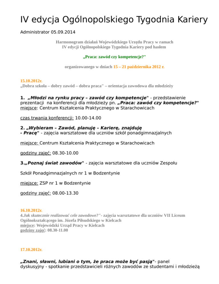 IV edycja Ogólnopolskiego Tygodnia Kariery Administrator 05.09.2014 Harmonogram działań Wojewódzkiego Urzędu Pracy w ramach IV edycji Ogólnopolskiego Tygodnia Kariery pod hasłem „Praca: zawód czy kompetencje?" organizowanego w dniach 15 – 21 października 2012 r. 15.10.2012r. „Dobra szkoła – dobry zawód – dobra praca" – orientacja zawodowa dla młodzieży 1. „Młodzi na rynku pracy – zawód czy kompetencje" - przedstawienie prezentacji na konferencji dla młodzieży pn. „Praca: zawód czy kompetencje?" miejsce: Centrum Kształcenia Praktycznego w Starachowicach czas trwania konferencji: 10.00-14.00 2. „Wybieram – Zawód, planuję – Karierę, znajduję - Pracę" - zajęcia warsztatowe dla uczniów szkół ponadgimnazjalnych miejsce: Centrum Kształcenia Praktycznego w Starachowicach godziny zajęć: 08.30-10.00 3.„Poznaj świat zawodów" - zajęcia warsztatowe dla uczniów Zespołu Szkół Ponadgimnazjalnych nr 1 w Bodzentynie miejsce: ZSP nr 1 w Bodzentynie godziny zajęć: 08.00-13.30 16.10.2012r. 4.Jak skutecznie realizować cele zawodowe?"- zajęcia warsztatowe dla uczniów VII Liceum Ogólnokształcącego im. Józefa Piłsudskiego w Kielcach miejsce: Wojewódzki Urząd Pracy w Kielcach godziny zajęć: 08.30-11.00 17.10.2012r. „Znani, sławni, lubiani o tym, że praca może być pasją"- panel dyskusyjny - spotkanie przedstawicieli różnych zawodów ze studentami i młodzieżą szkół ponadgimnazjalnych O swoich wyborach, doświadczeniach i pasjach opowiedzą: • Adam Jarubas – Marszałek Województwa Świętokrzyskiego • ·dr hab. inż. Zdzisława Owsiak, prof. PŚk - Prorektor ds. Studenckich i Dydaktyki Politechniki Świętokrzyskiej w Kielcach • Tomasz Tworek – Prezes Dorbud S.A., Prezes Zarządu Świętokrzyskiego Związków Pracodawców Prywatnych PKPP „LEWIATAN" • Agnieszka Migoń – przedsiębiorca, dyrektor Fundacji Rozwoju Demokracji Lokalnej w Kielcach • Paulina Biernati Stefano Terrazzino – mistrzowie Europy w tańcach latynoamerykańskich Show Dance, uczestnicy programu telewizyjnego „Taniec z Gwiazdami" • Kamil Cebulski – najmłodszy polski milioner, rektor Uczelni ASBIRO • Sławomir Szmal – zawodnik Vive Targi Kielce, najlepszy bramkarz Mistrzostw Europy 2010, najlepszy piłkarz ręczny Świata 2009 miejsce: aula Politechniki Świętokrzyskiej w Kielcach godziny spotkania: 10.00-13.00 18.10.2012r. „Student w sidłach Assessment Centre - najskuteczniejsza metoda oceny kompetencji"- trening dla studentów Uniwersytetu Jana Kochanowskiego w Kielcach miejsce: Wojewódzki Urząd Pracy w Kielcach godziny treningu: 11.00-15.00 19.10.2012r. „Biblioteka kariery"- indywidualne konsultacje z doradcą zawodowym miejsce: Wojewódzka Biblioteka Publiczna im. Witolda Gombrowicza w Kielcach godziny konsultacji: 10.00 – 15.30 Załączniki plakat.gif